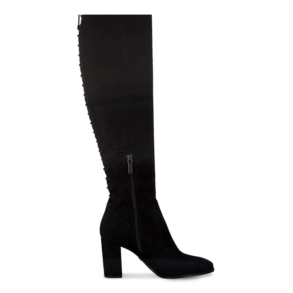 Černé semišové kozačky se budou skvěle hodit k sukni, ale i úzkým kalhotám. Hladký svršek je zdoben efektním šněrováním na zadní straně. Pro snadnější nazutí je z vnitřní strany všitý zip.