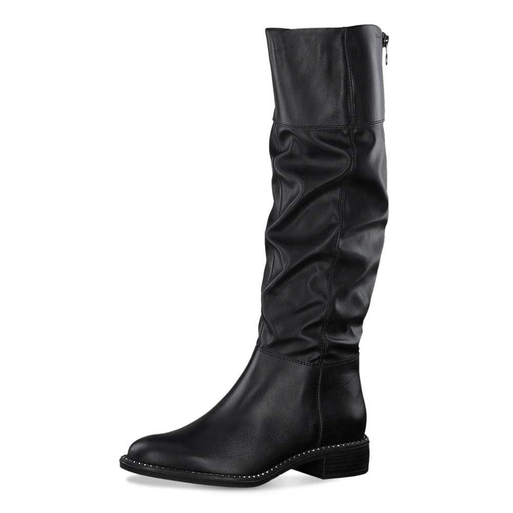 Tyto černé kozačky na nízkém podpatku využijete ať už do práce, tak na procházku do města. Hladký svršek je zdoben řasením kolem lýtka a nýtky podél podešve. Pro snadní obutí je z vnitřní strany umístěn zip. Vedle něj je všita pružná gumička, díky které se bota lépe přizpůsobí na nohu. Na zadní straně si pomocí zipu můžete tento model dle potřeby ještě rozšířit a nosit k němu tak třeba i kalhoty.