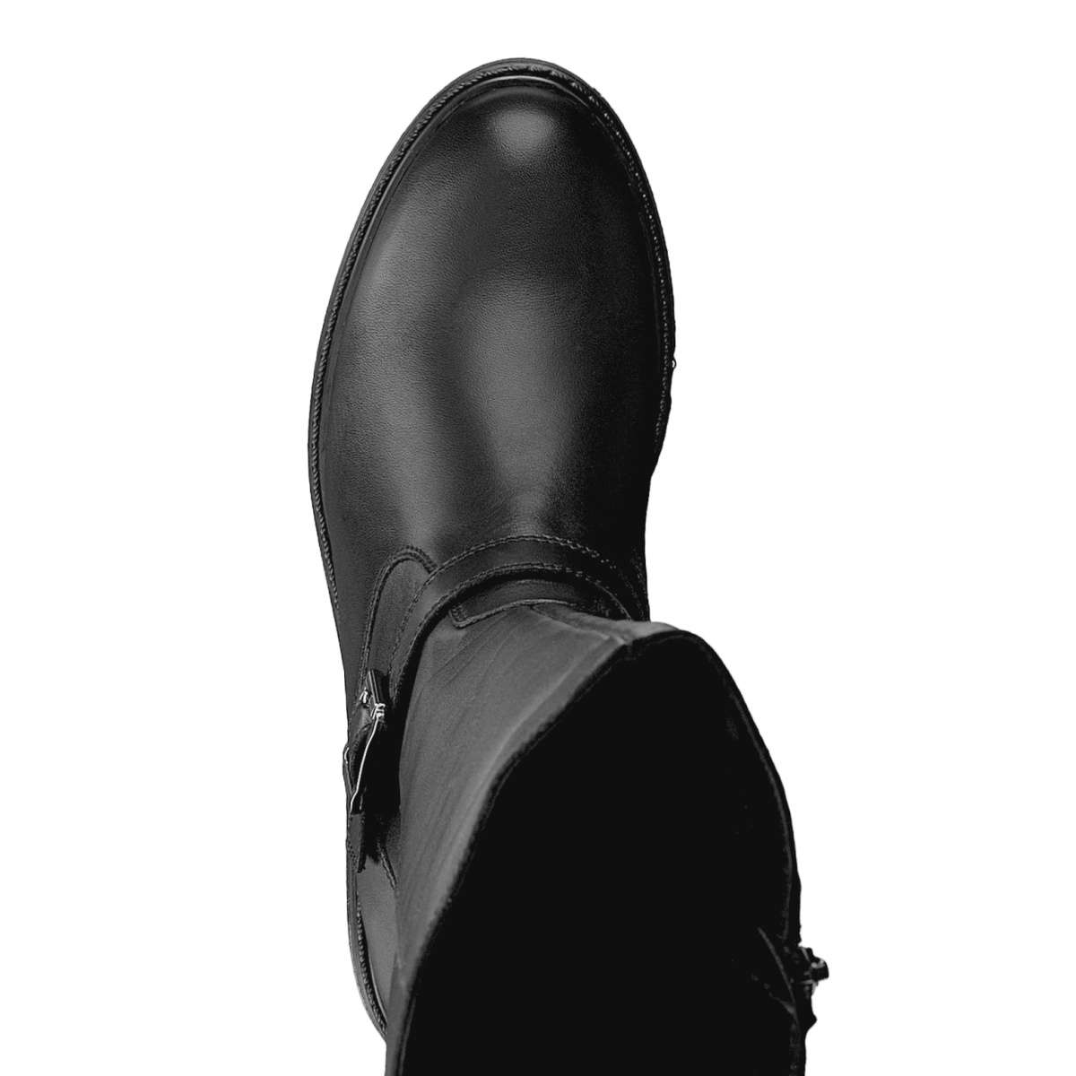 Hladký kožený svršek je zdobný v oblasti kotníku páskem s kovovou přezkou, prošíváním a u horního okraje decentně vytlačeným názvem značky. Snadně nazouvání zajistí funkční zip na vnitřní straně obuvi.