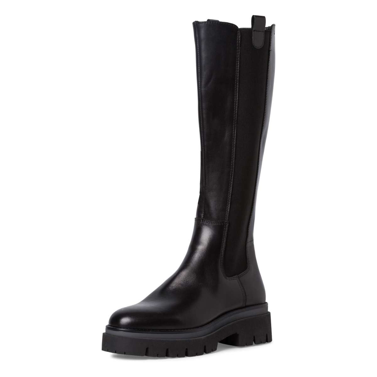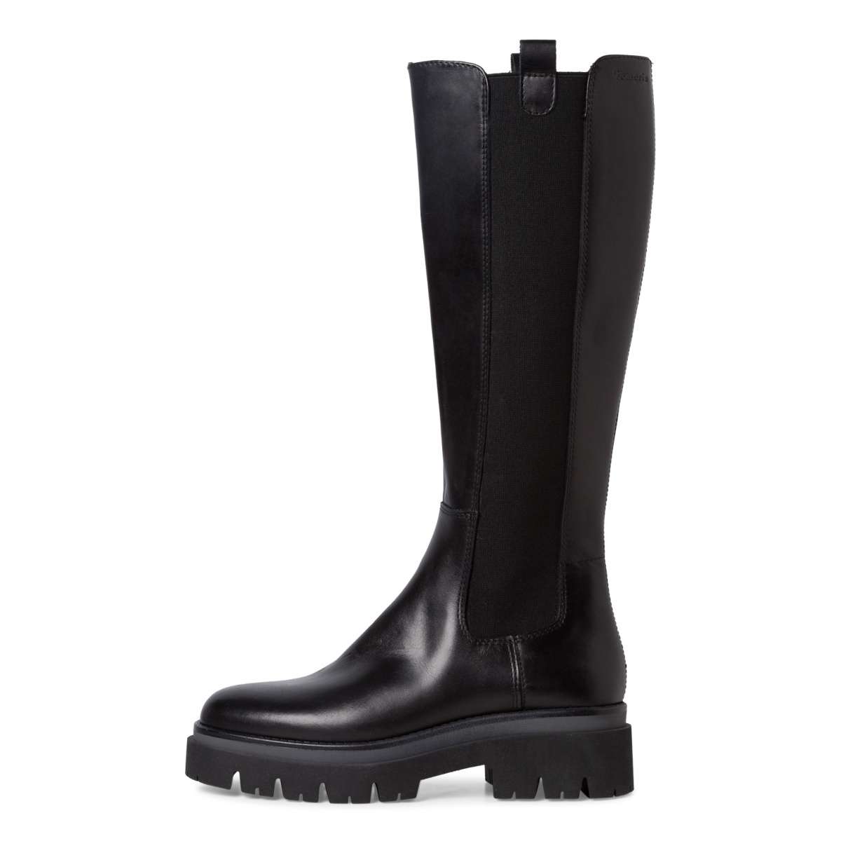 Kozačka s černým svrškem z pravé kůže má hladký povrch a kulatou špici. Po stranách jsou vsazeny velké pružné gumičky pro snadné obutí i přizpůsobení Vaší noze.