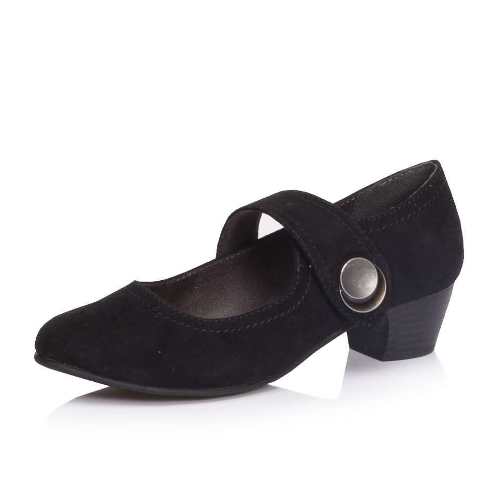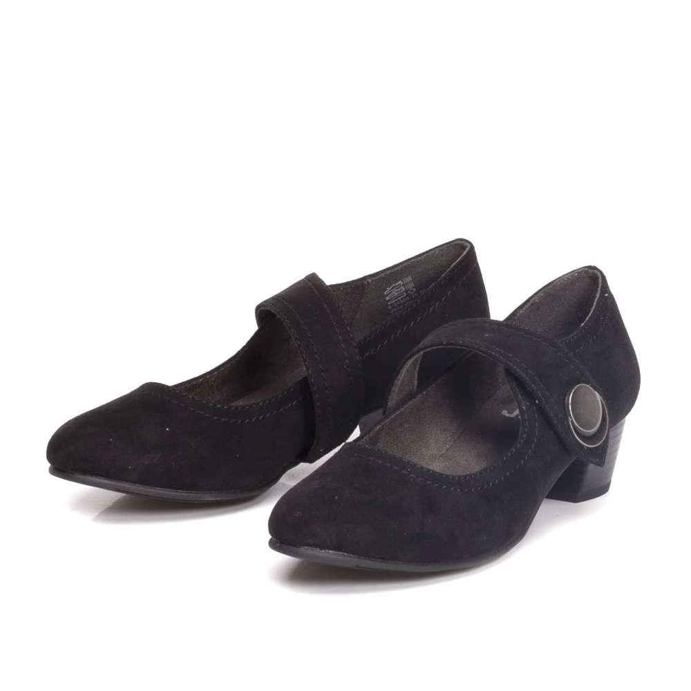 Dámské černé botičky značky JANA s širším podpatkem, jsou doplněny ozdobným páskem přes nárt. Obouvání je snadné a pásek na suchý zip skvěle zajistí Vaši stabilitu. Kvalitní podešev má jemný vzorek s podpatkem o výšce cca 4 cm a měkká stélka se postará o Vaše pohodlí. Tato obuv je jako dělaná k Vaší sukni nebo šatům.