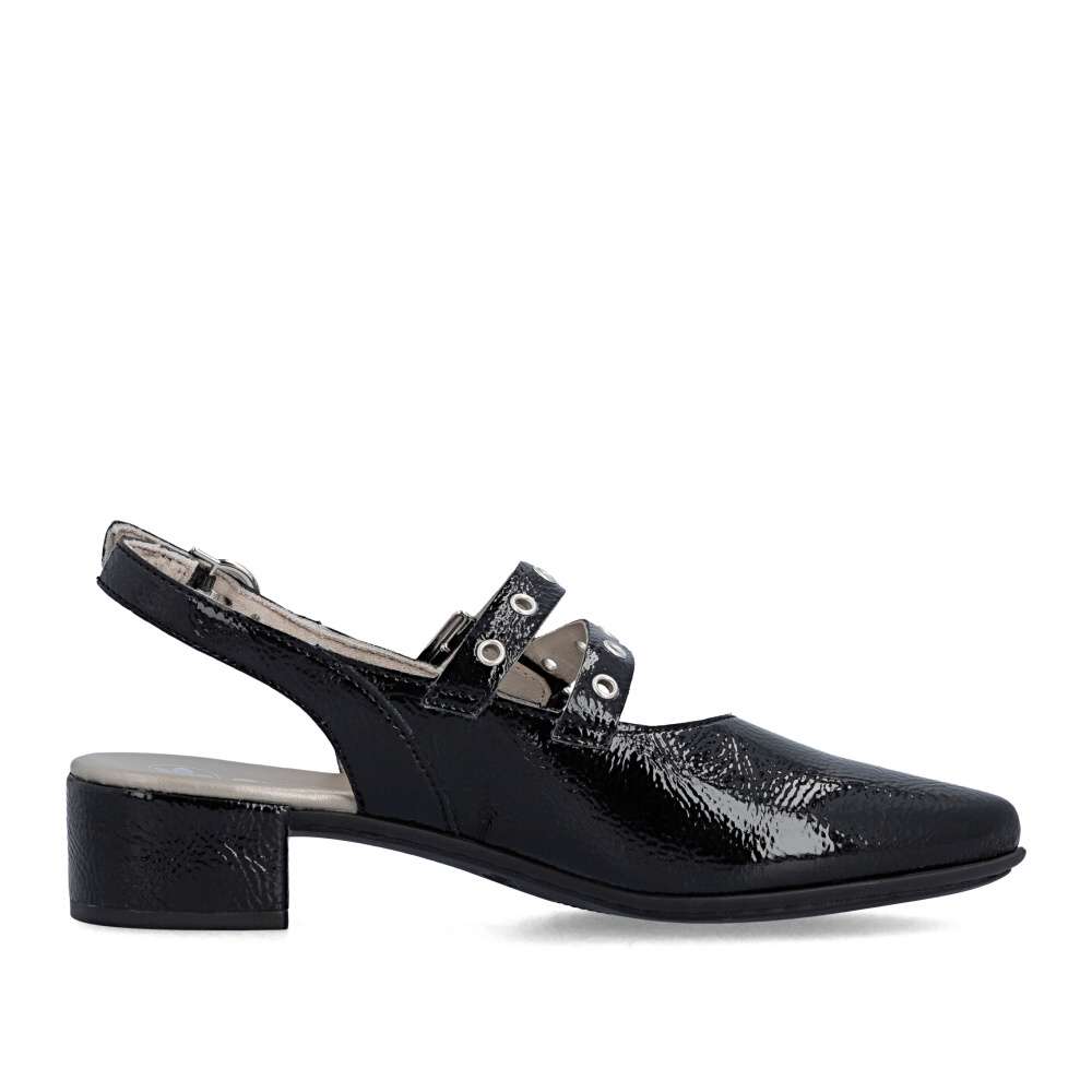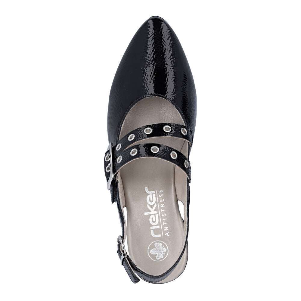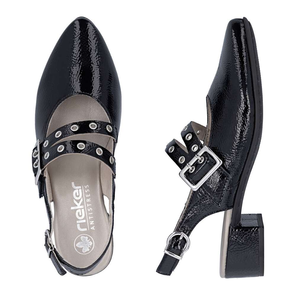 Okouzlující odlesky černého svršku a výrazné zdobení nártového pásku dodávají těmto lodičkám RIEKER nezaměnitelný charakter. Zadní pásek je vybaven nastavitelnou sponou, díky které si obuv jednoduše přizpůsobíte podle svých potřeb a zabezpečíte si pevné a pohodlné usazení na noze. Příjemná stélka se postará o komfort i během delšího nošení a nízký podpatek dodává modelu ladnost, přičemž zároveň poskytuje stabilitu a jistotu při každém kroku. Tyto lodičky RIEKER jsou ideální volbou pro ženy, které chtějí zazářit, cítit se sebevědomě a zároveň si dopřát pohodlí během celého dne.