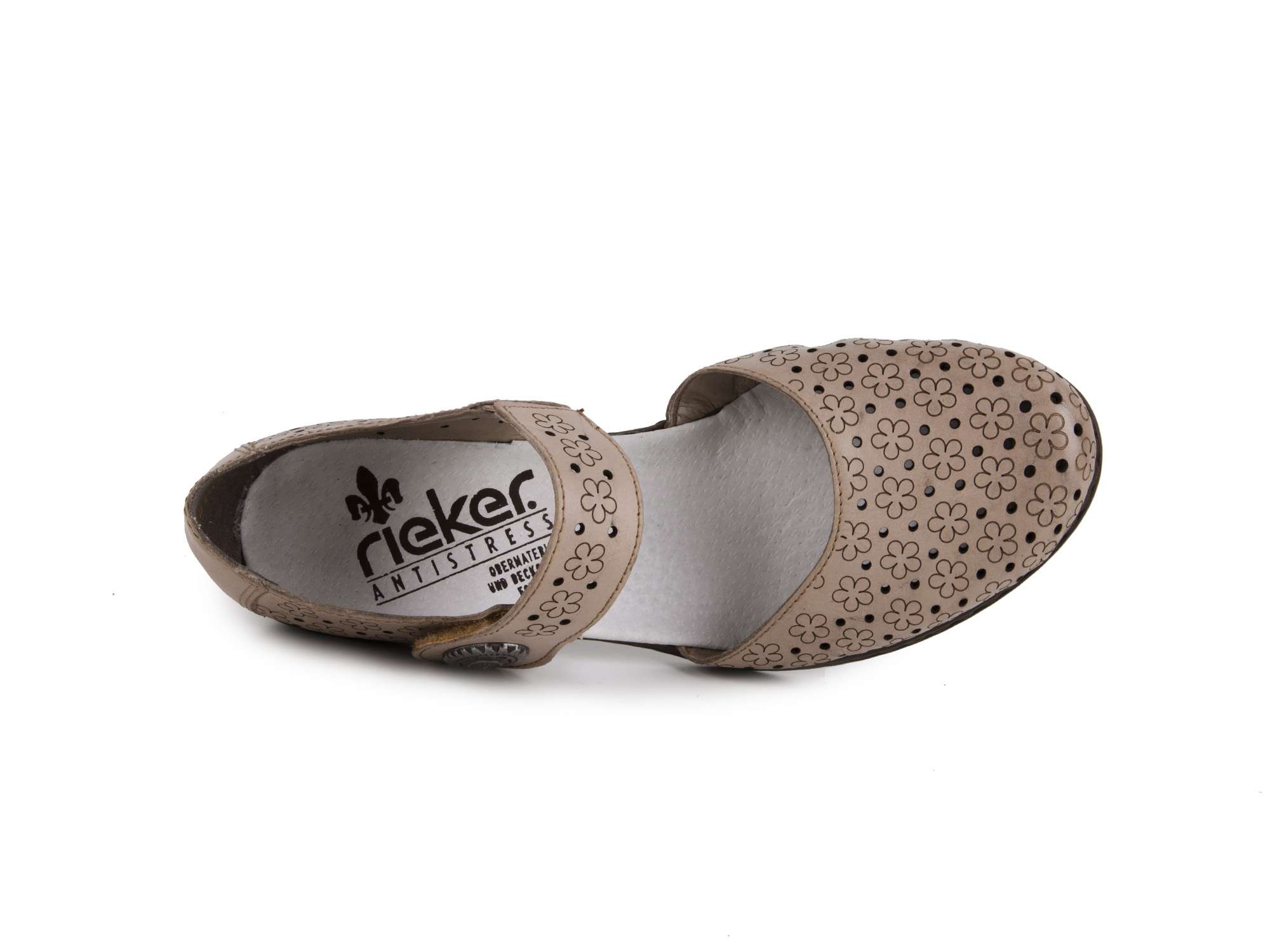 Svršek boty je vyroben z pravé kůže vbílé barvě. Je rozdělena na přední a zadní část. Obě části jsou s otvory a s ozdobnými ornamenty, které jsou vybroušeny do kůže. Na tomto modelu sandálů jsou ornamenty ve tvaru kytiček a jsou skutečně krásné. Přes nárt je veden pásek, který je na konci dozdoben kovovým zdobením a je zapínatelný na suchý zip. Podšívka boty je v kombinaci kůže a syntetického materiálu.