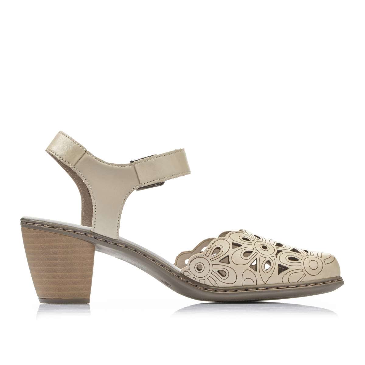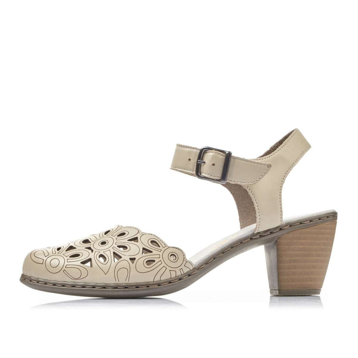 Dámská lodička světlé barvy s volnou patou, značky RIEKER. Podešev Podešev je vyrobena z velmi kvalitního syntetického materiálu. Podešev je díky technologii Antistress lehká, flexibilní, absorbuje nárazy při došlapu a snadno se přizpůsobí každé noze. Podpatek je vysoký cca 5,7 cm. Svršek Dámská lodička hladkého stylu s kulatou špičkou světlé barvy je zdobená perforací na špici. Pásek kolem kotníku obsahuje zapínání na přezku i pružnou gumičku pro jednodušší obutí a přizpůsobení přímo k Vaší noze. Tento model unosíte jak do práce k sukni, tak na běžné pochůzky městem či na nákupy. Stélka Pohodlná kožená stélka se postará o Vaše pohodlí na každém kroku. Technologie: Antistress