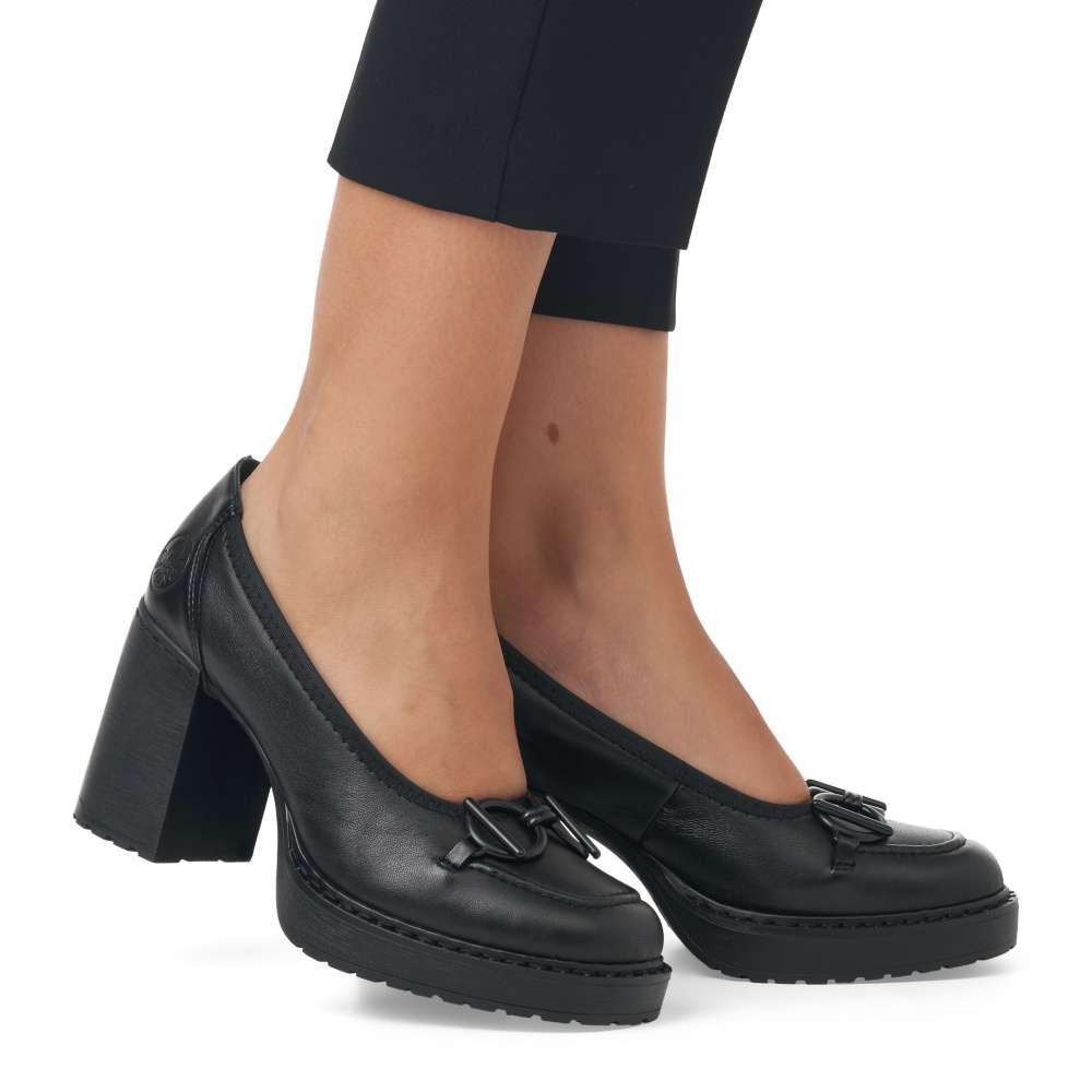 Tyto kožené dámské boty Vás okouzlí na první pohled, hladký černý svršek je doplněn jemným prošíváním a na nártu ozdobnou aplikací, díky které budete vskutku nepřehlédnutelná. Měkká kožená stélka a podešev s vysokým stabilním podpatkem Vám zaručí pohodlí na každém kroku a tento jedinečný model skvěle oživí Vaše outfity.