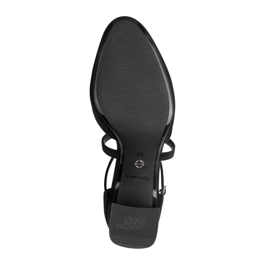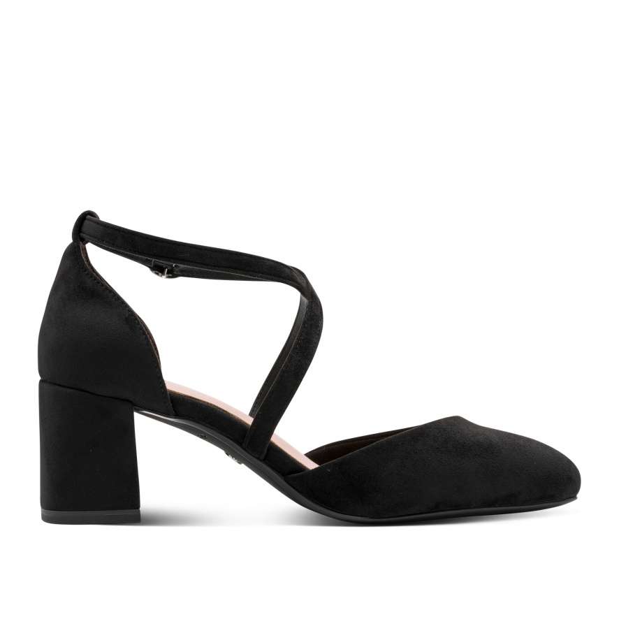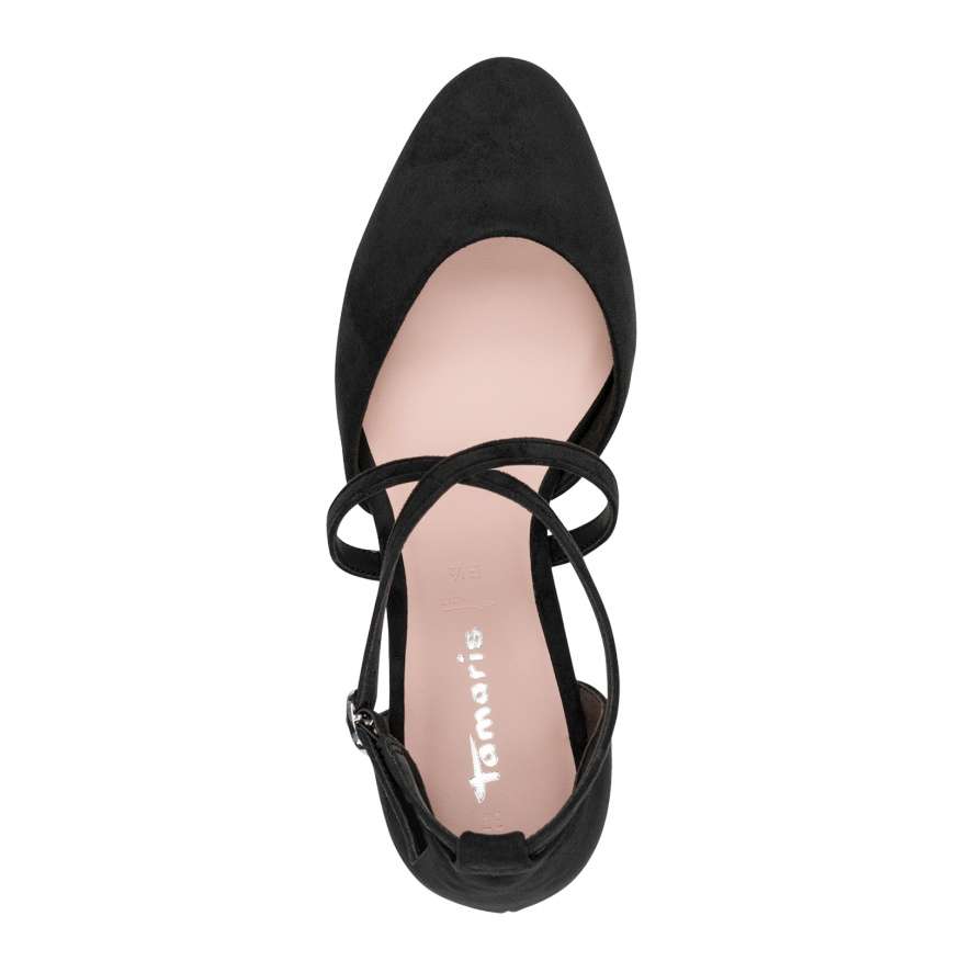 Tyto půvabné lodičky značky Tamaris představují dokonalé spojení ženskosti, stylu a pohodlí. Černý svršek v textilním provedení působí elegantně a nadčasově, zatímco plná špička a pata dodávají modelu klasický charakter a univerzálnost pro různé příležitosti. Zajímavým detailem jsou dekorativně poskládané pásky přes nárt, které vytvářejí atraktivní vzhled a zároveň zajišťují stabilitu při chůzi. Nastavitelná spona umožňuje snadné přizpůsobení obuvi tvaru nohy, díky čemuž se budete cítit pohodlně po celý den. Vyšší, širší podpatek je vybaven protiskluzovou úpravou a tlumením nárazů, což přináší jistotu a pohodlí i při delším nošení. Uvnitř se nachází měkká stélka, která poskytuje výjimečný komfort a příjemný pocit při každém kroku. Tyto lodičky Tamaris jsou ideální volbou pro ženy, které chtějí vypadat elegantně, a přitom se cítit pohodlně. Skvěle doplní jak pracovní, tak společenský outfit a stanou se vaším spolehlivým společníkem pro každou příležitost.