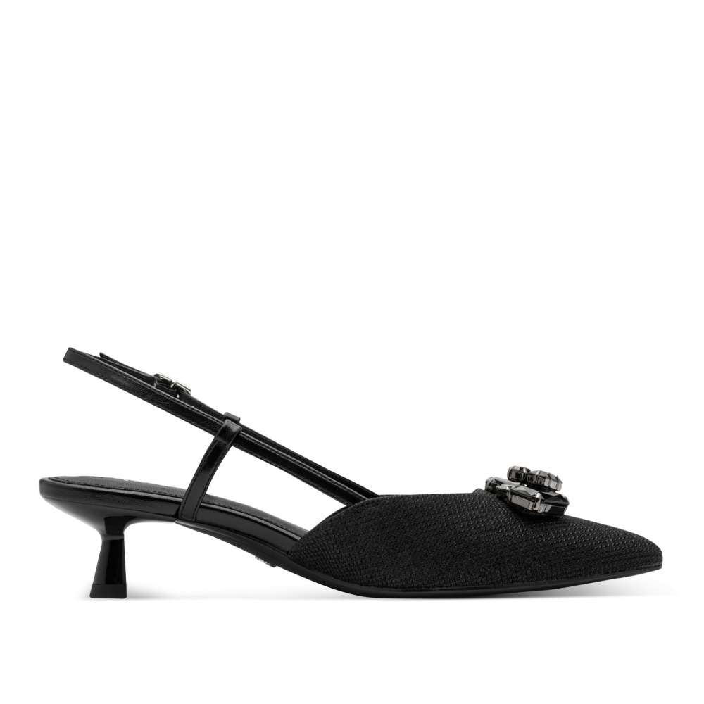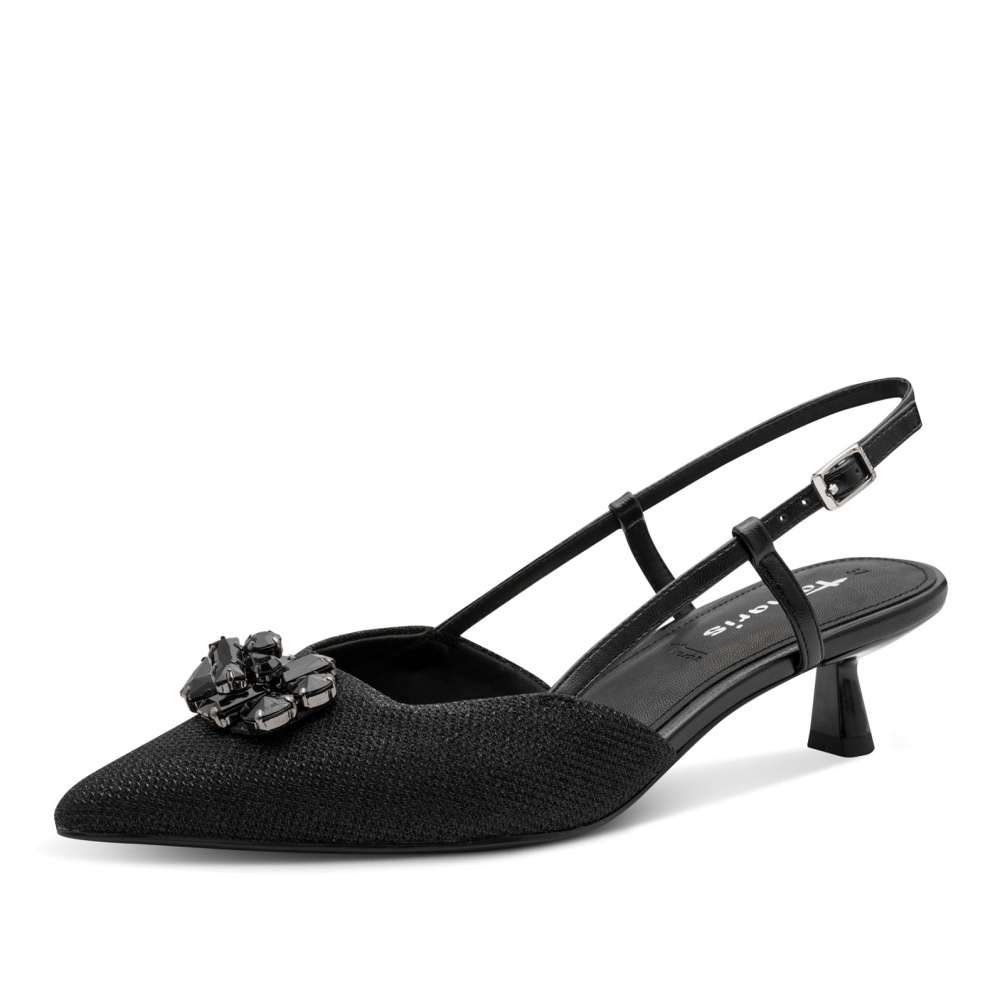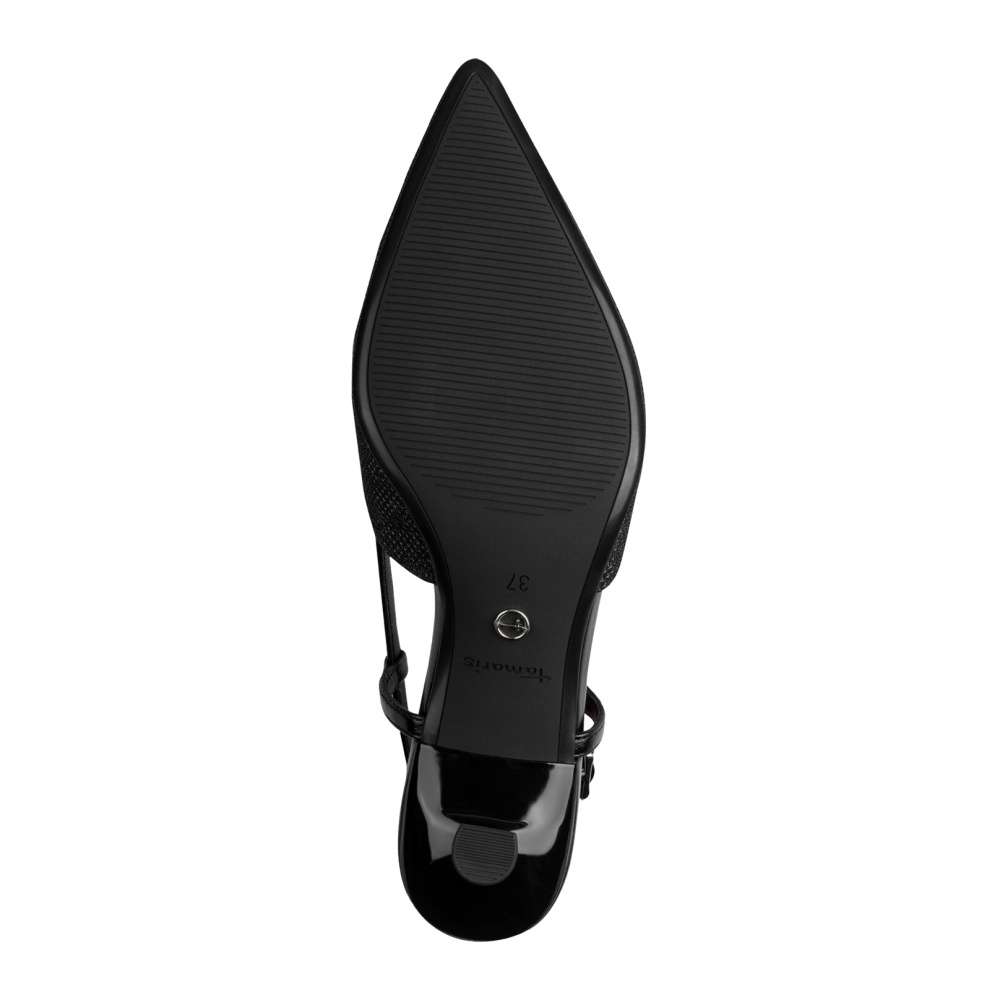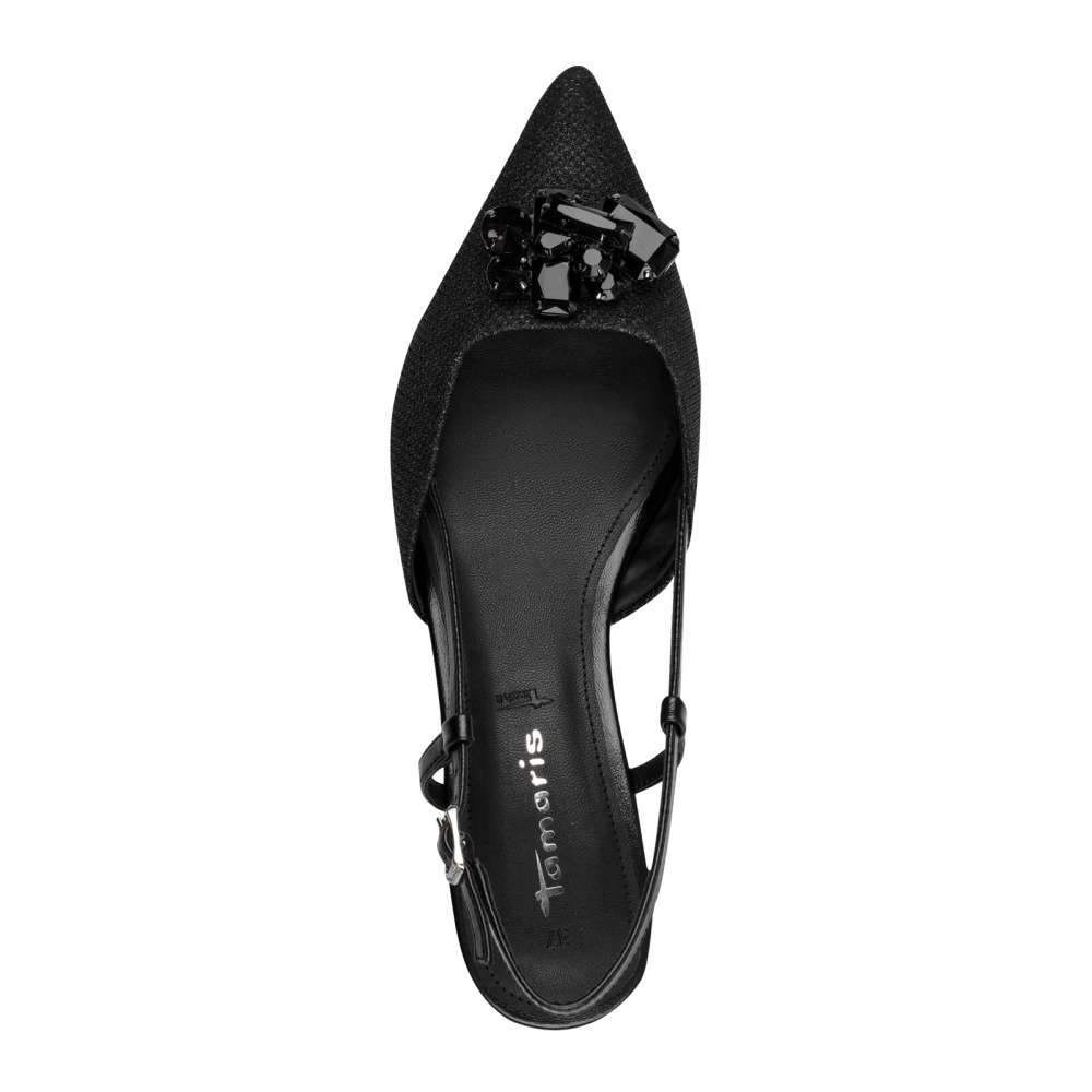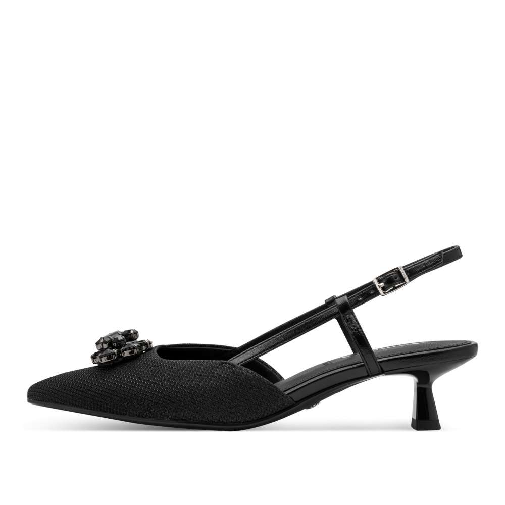 Tyto lodičky Tamaris s volnou patou jsou zosobněním jemné elegance a ženského půvabu. Okouzlujícími dekorace na černém svršku dodává modelu slavnostní nádech, díky kterému budete nepřehlédnutelná. Měkká stélka se postará o pohodlí i během delšího dne či večera, takže si svůj výjimečný vzhled můžete užívat bez kompromisů. Zadní pásek s nastavitelnou sponou umožňuje přesné přizpůsobení noze a zajistí stabilitu při chůzi. Nízký podpatek působí elegantně, zároveň však neubírá na komfortu při chůzi. Tyto lodičky Tamaris jsou ideální volbou pro chvíle, kdy chcete zazářit – ať už na společenské události, večeři nebo při slavnostní příležitosti.