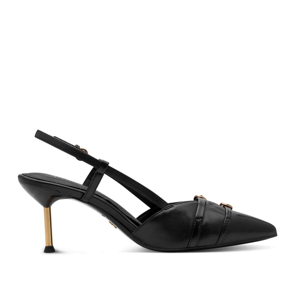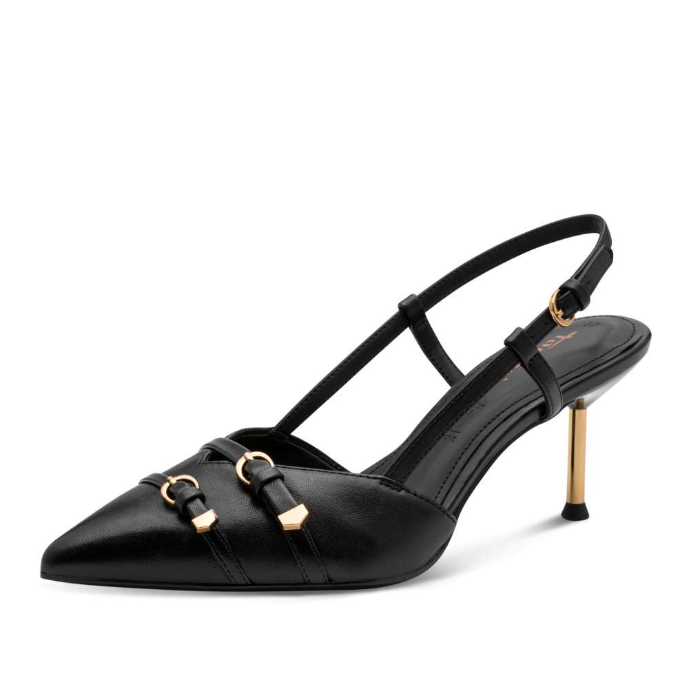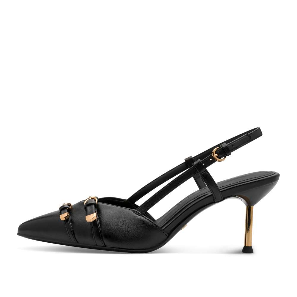Lodičky Tamaris jsou ztělesněním nadčasové elegance, která nikdy nevyjde z módy. Černý svršek atraktivně doplňují aplikace se zlatými odlesky. Zúžená špička dodává siluetě noblesu, zatímco volná pata působí svůdně žensky. Zadní pásek s nastavitelnou sponou zajistí dokonalé přizpůsobení i jistotu při každém kroku. Příjemně měkká stélka vás bude hýčkat po celý den a úzký podpatek zvýrazní ženskou siluetu. Lodičky jsou ideální volbou pro chvíle, kdy chcete působit elegantně – ať už v práci, na slavnostní události nebo při výjimečném večeru. S těmito lodičkami Tamaris se budete cítit krásná, sebevědomá a naprosto neodolatelná.