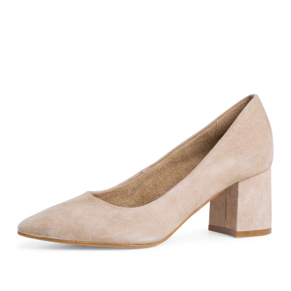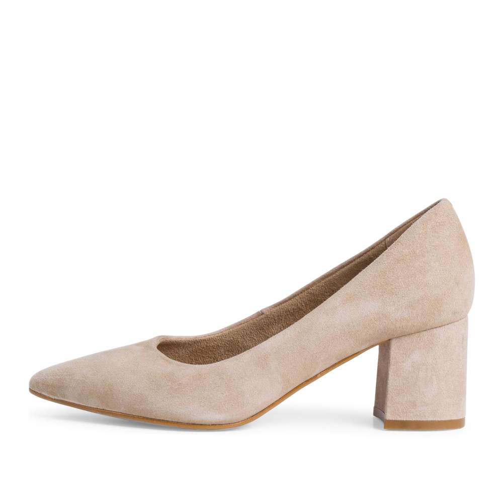 Lodičky v béžové barvě jsou šité z pravé kůže jsou velmi elegantní. Mají semišový povrch a úzkou špici.