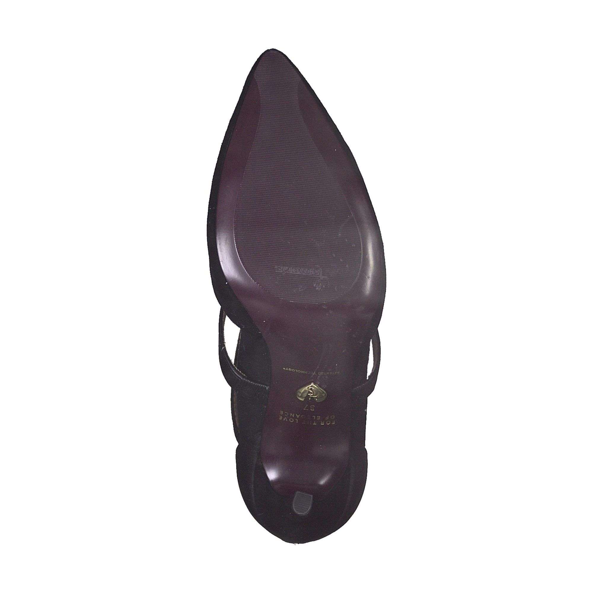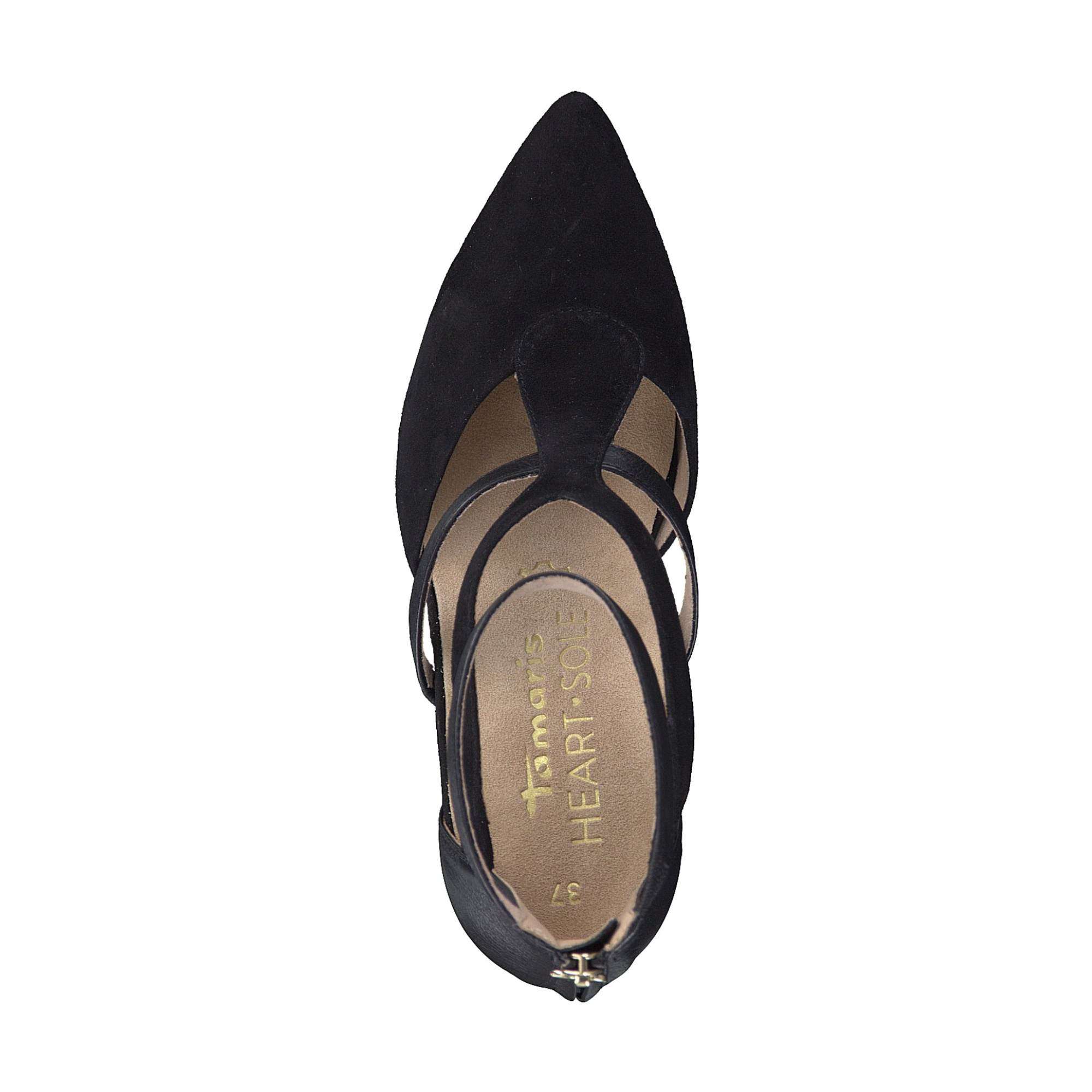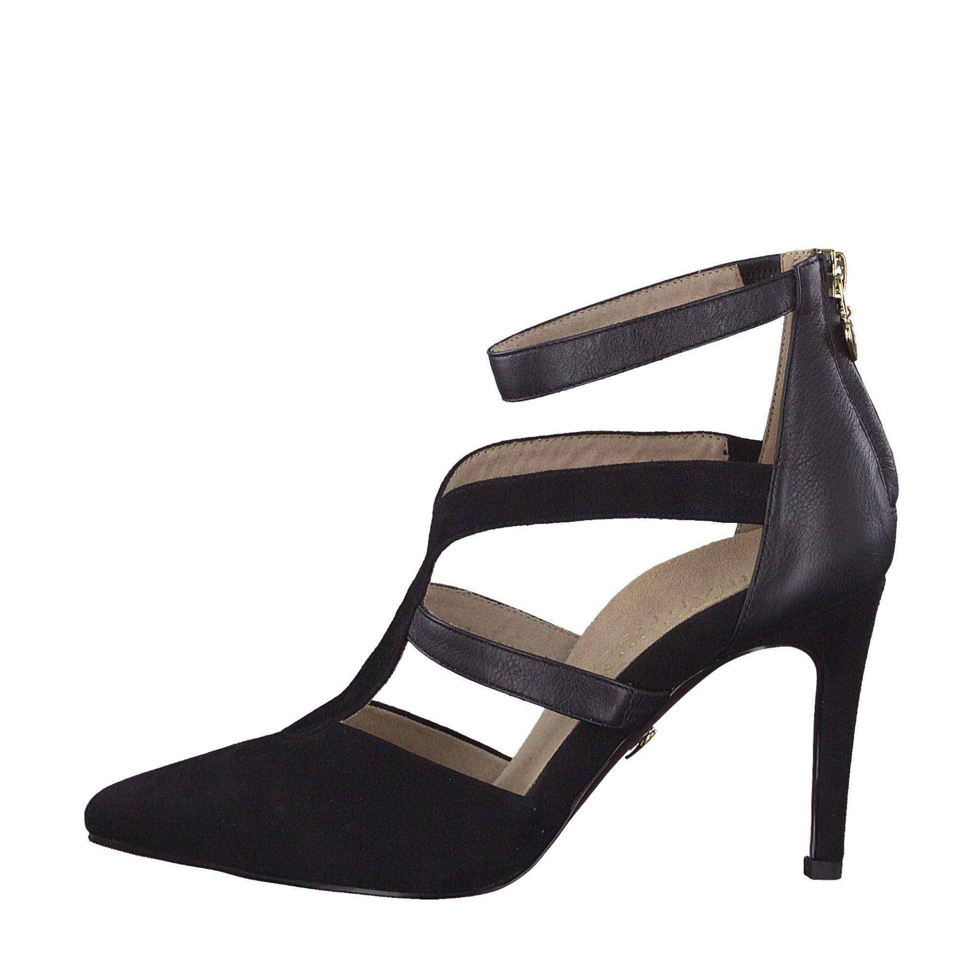 Lodičky černé barvy na vysokém podpatku. Svršek je v oblasti nártu částečně otevřený. Díky ozdobným páskům budou lodičky na Vašich nohou skvěle držet. Na patě je zapínání na klasický zip. Tyto lodičky skvěle podtrhnou elegantní nebo business outfit.