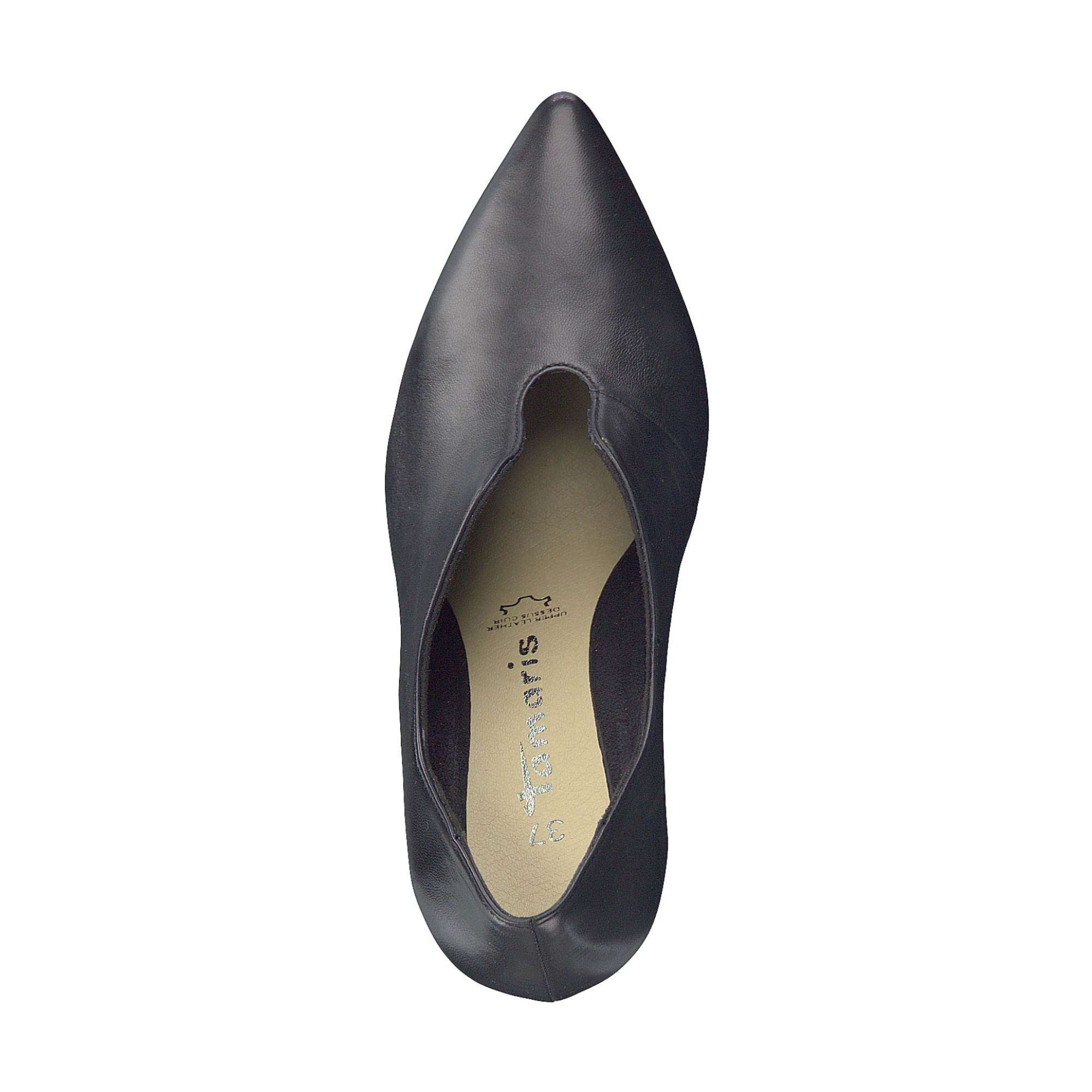 Dámské lodičky ušité z pravé kůže v černé barvě zdobené výkrojem horního okraje. Mají úzkou špičku a hladký povrch. Elegantní a jednoduchý model vhodný i do práce i ke společenským událostem.