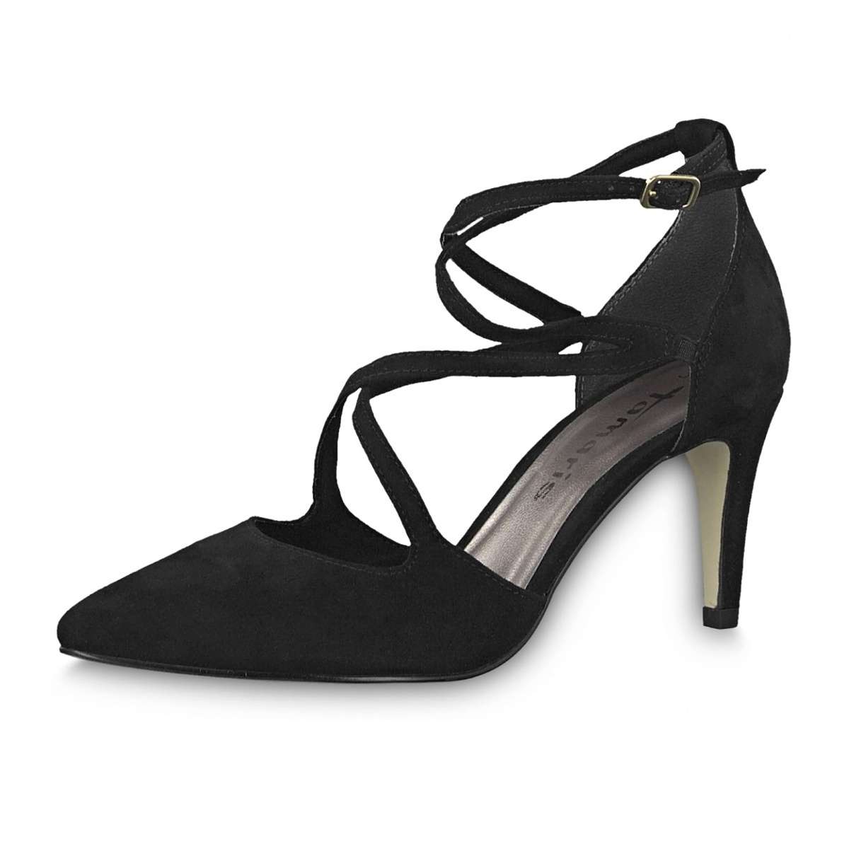 Semišová dámská lodička značky Tamaris je po bocích otevřená. Pro snadné nazouvání slouží pásek s kovovým zapínáním kolem kotníku a ostatní pásky jsou elegantně poskládány přes nárt což opticky prodlouží Vaši nohu. Pásky také slouží pro dokonalé přizpůsobení, aby Váš krok mohl být jistý. Tato lodička se špičatou špičkou bude skvěle vypadat jak se sukní, tak i se šaty třeba na ples.