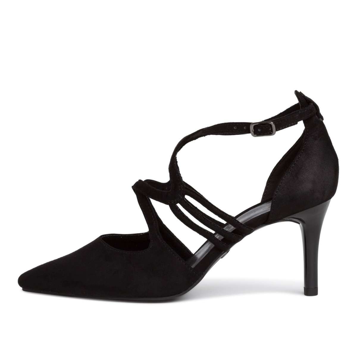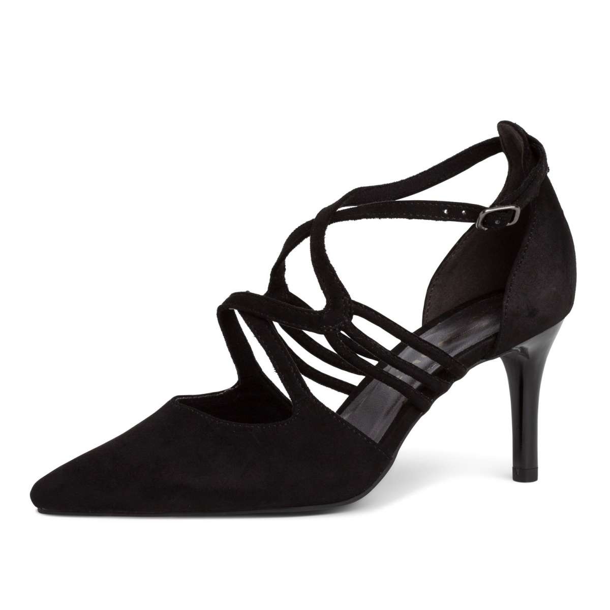 Semišová dámská lodička značky Tamaris je po bocích otevřená. Pro snadné nazouvání slouží pásek s kovovým zapínáním kolem kotníku a ostatní pásky jsou elegantně poskládány přes nárt což opticky prodlouží Vaši nohu. Pásky také slouží pro dokonalé přizpůsobení, aby Váš krok mohl být jistý. Tato lodička se špičatou špičkou bude skvěle vypadat jak se sukní, tak i se šaty třeba na ples.