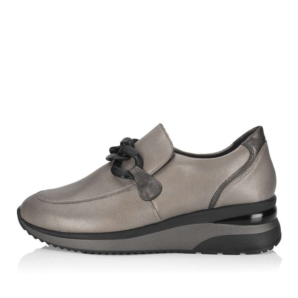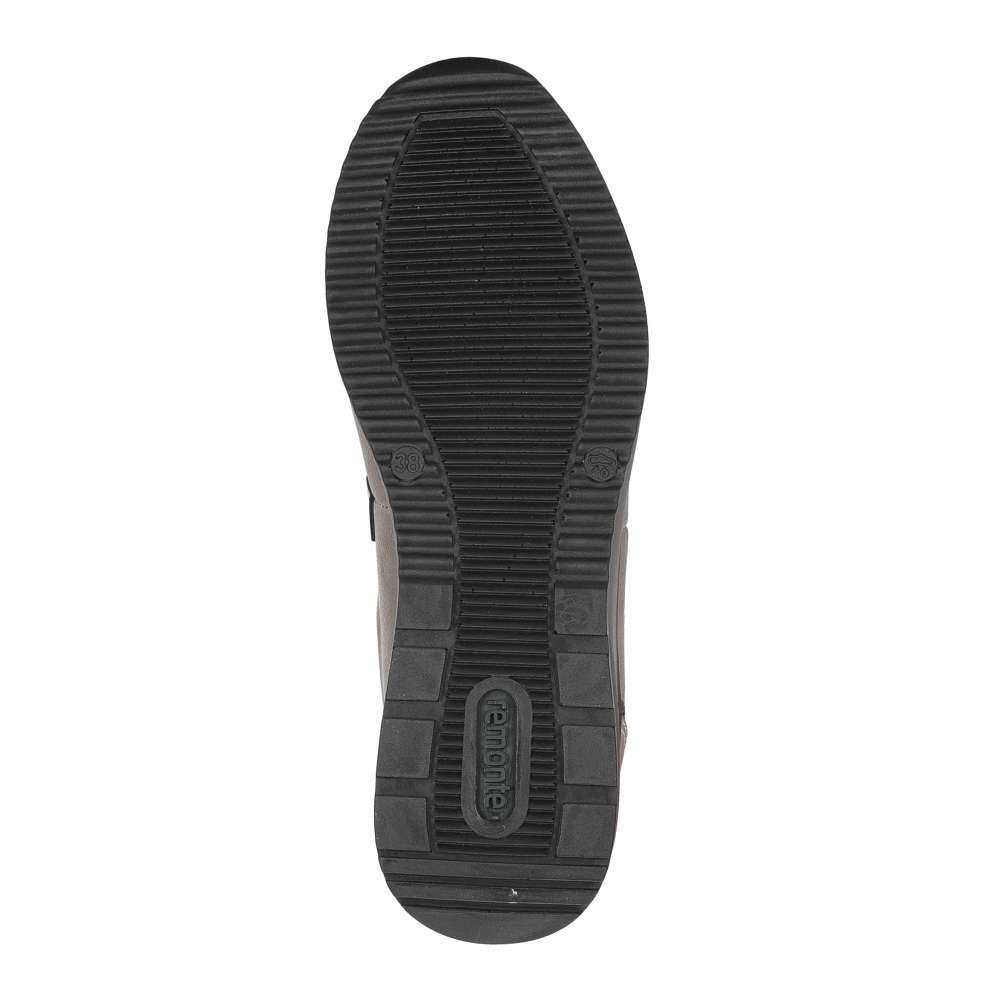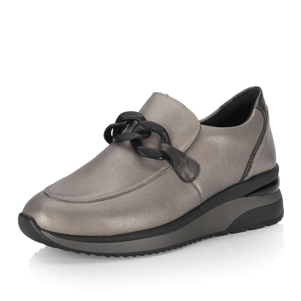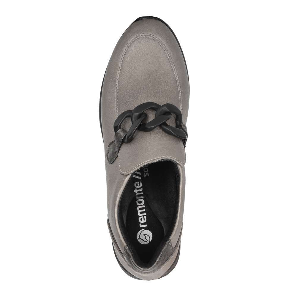 Obuv REMONTE je vyšší řada značky RIEKER, obuv se vyznačuje kvalitou použitých materiálů. Nepřehlédnutelné dámské mokasíny Vás uchvátí nevšední designovou aplikací na nártové části, jemným prošitím a kontrastní podešví. Kožený svršek dodá na eleganci celkového vzhledu. Měkká stélka se dokonale přizpůsobí tvaru Vaší nohy a Vám zajistí maximální komfort na každém kroku. S tímto jedinečným kouskem oživíte nejeden outfit.