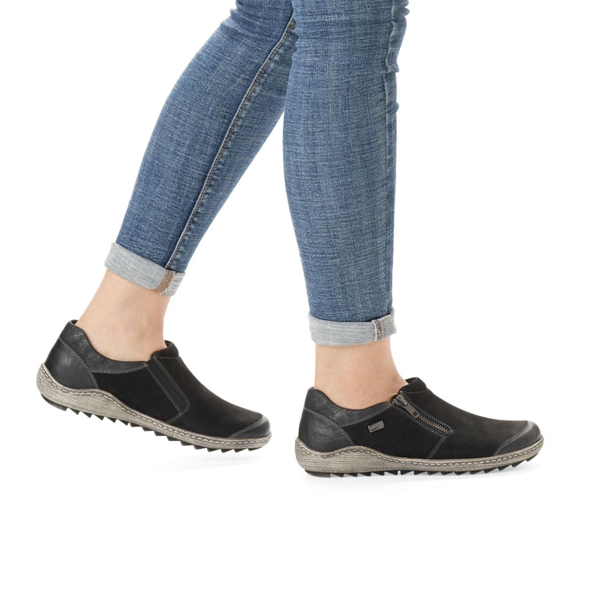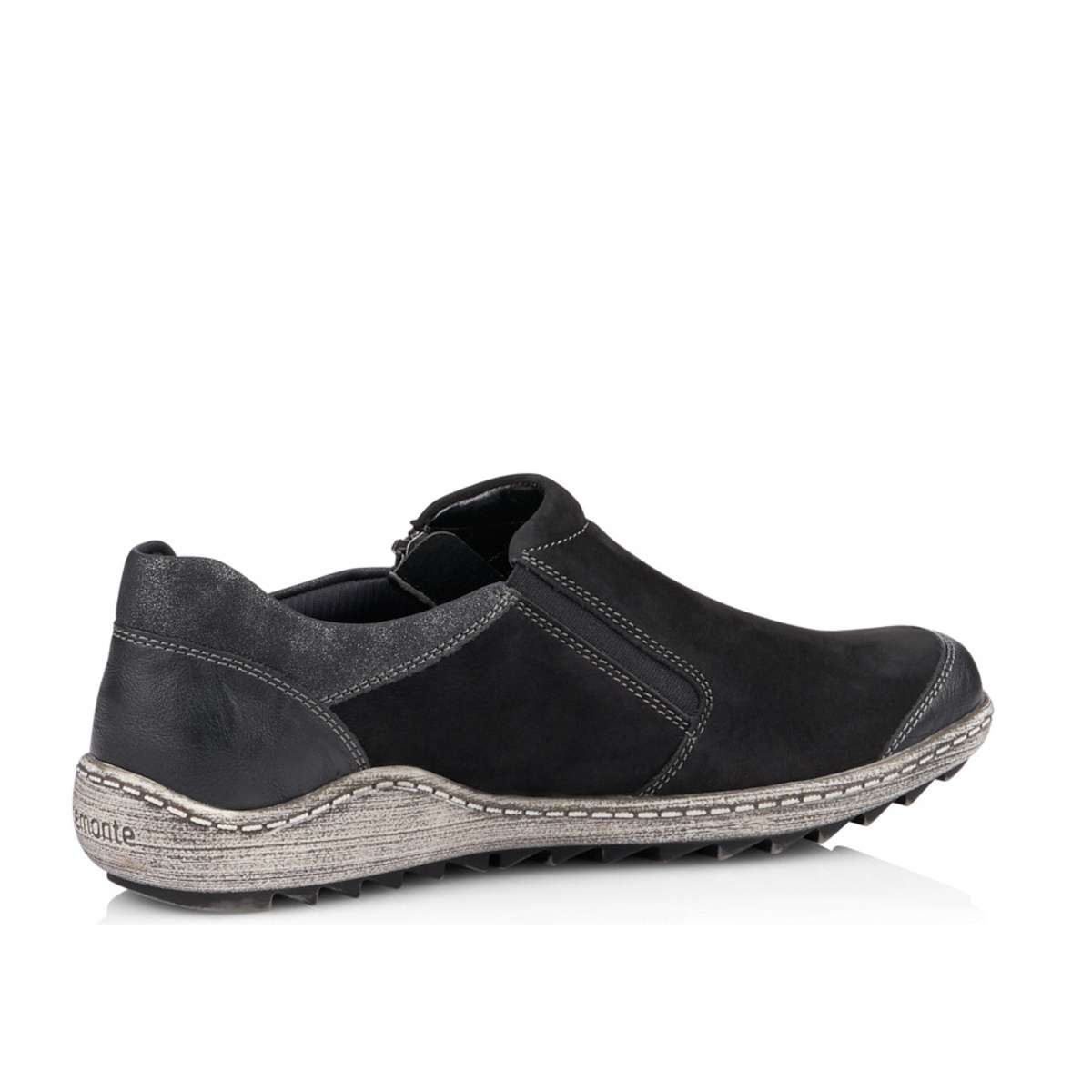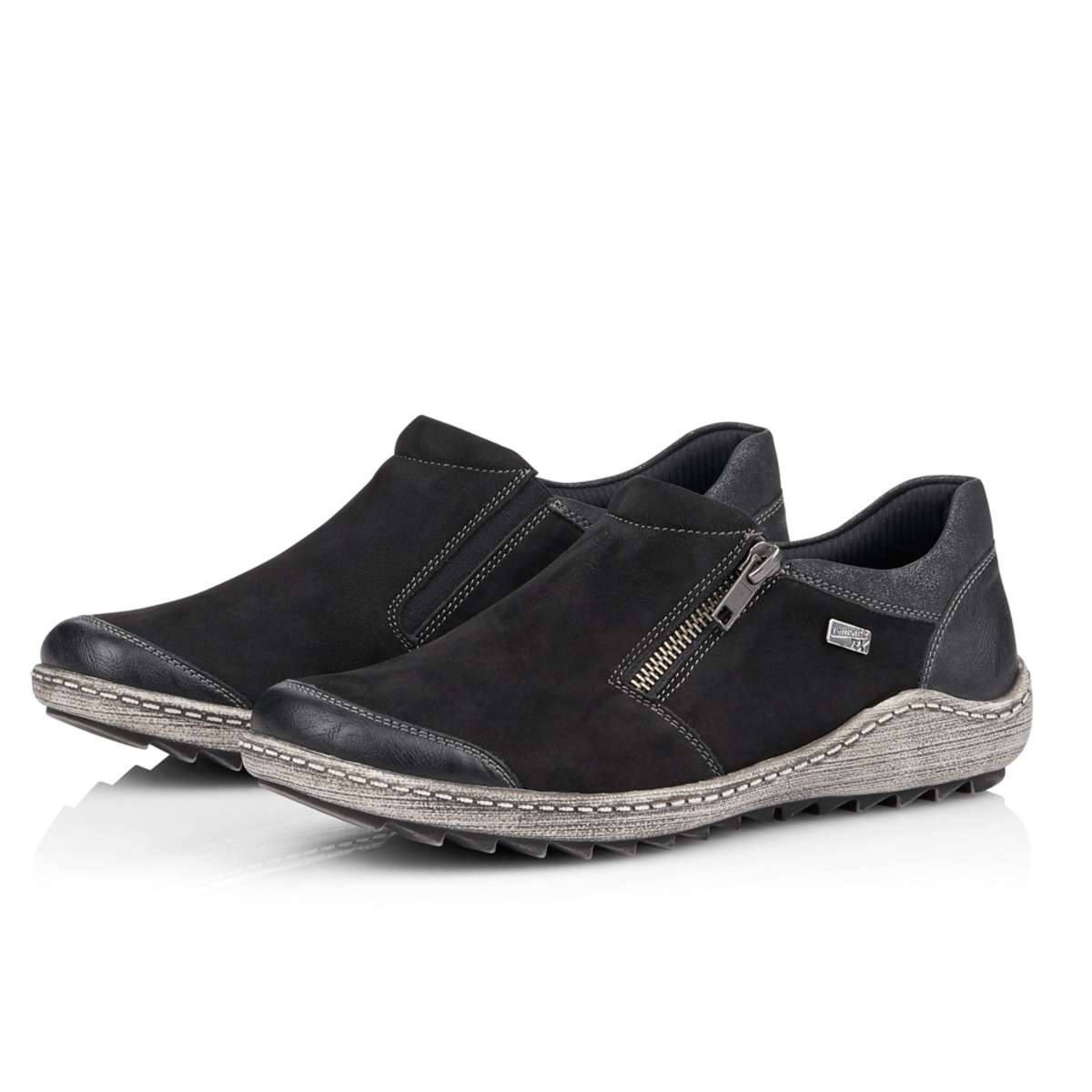 Tyto jednoduché a elegantní polobotky můžete nosit ke kalhotám i ke kraťasům. Snadno se obouvají díky gumičce na vnitřní straně a zipu na straně vnější. Navíc mají špičku i patu obšitou šedou nití, která ladí přímo s podešví. Díky jedinečné funkční vrstvě Rieker TEX je obuv nepromokavá, ale přesto prodyšná.