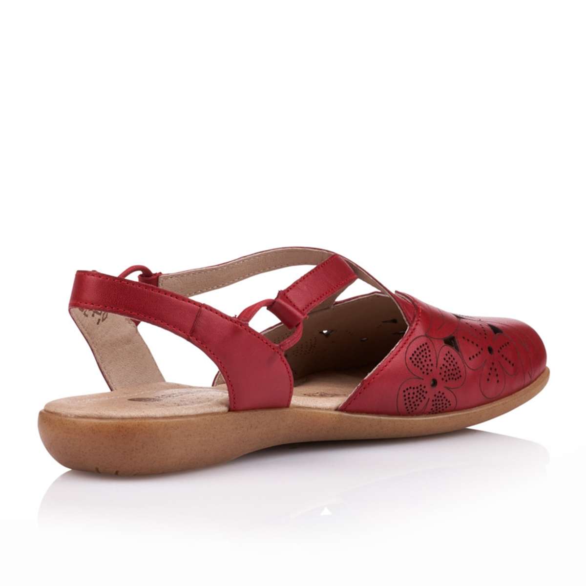 Dámská kožená polobotka s volnou patou v červené barvě s perforací a potiskem květin a lístků. Pro Vaše pohodlí jsou vsazeny po obou stranách pružné gumičky, které usnadní nazouvání. Tuto obuv oceníte jak na procházce městem, tak do práce. Unikátní stélka z paměťové pěny změkčí došlap a také se maximálně přizpůsobí tvaru Vašeho chodidla.