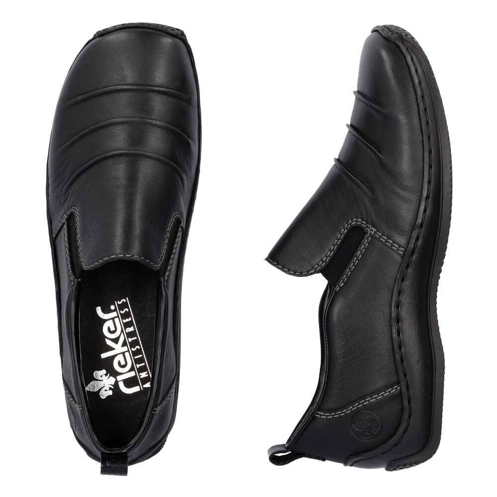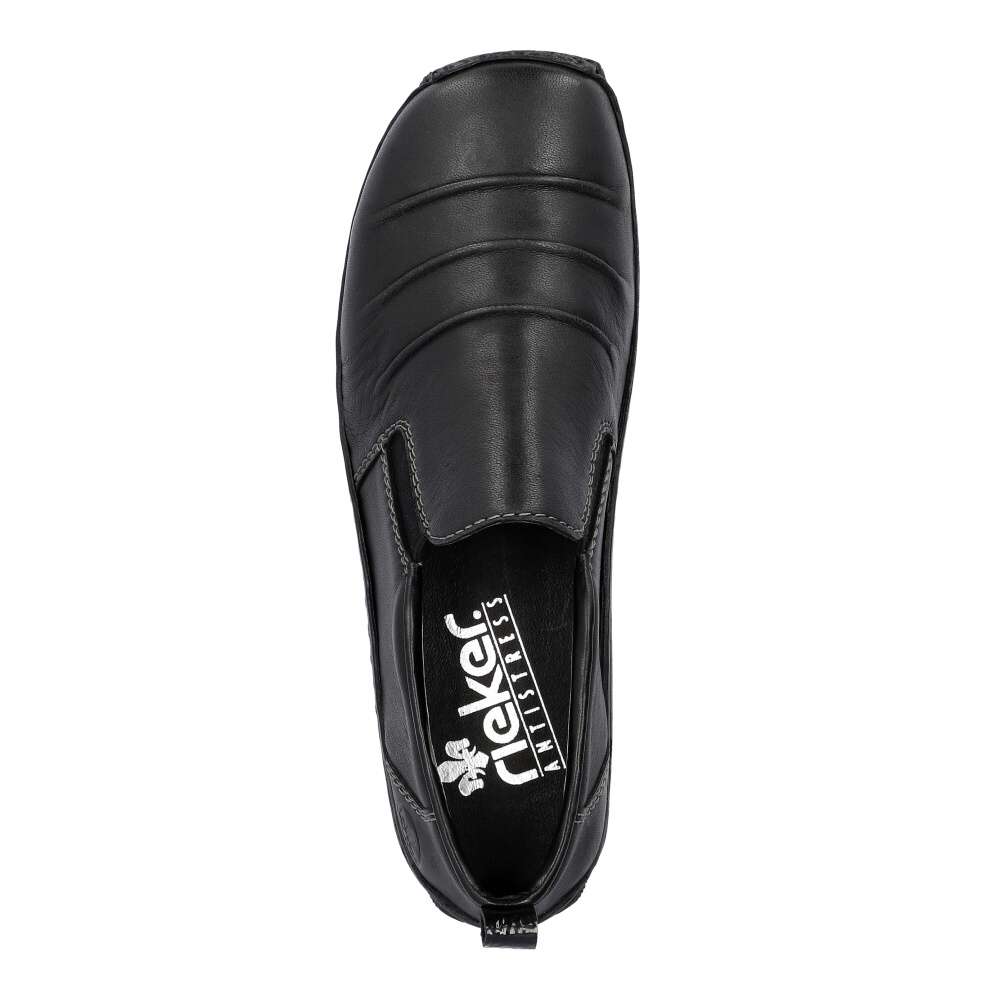 Jednoduchý vzhled těchto mokasin RIEKER vytváří obuv vhodnou snad ke všem outfitům. Kožený svršek černé barvy je doplněn designovým řasením pro vytvoření moderního vzhledu. Po stranách nártu jsou všity pružné gumičky, které usnadní obouvání. Kožená stélka a flexibilní podešev vytvoří dokonalý komfortní pocit při chůzi. Tento model bude skvělým společníkem jak na cestě do práce, tak na pochůzkách městem. Technologie: Antistress – podešev je díky této technologii lehká, flexibilní, absorbuje nárazy při došlapu a snadno se přizpůsobí každé noze.