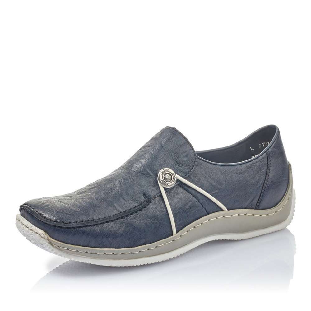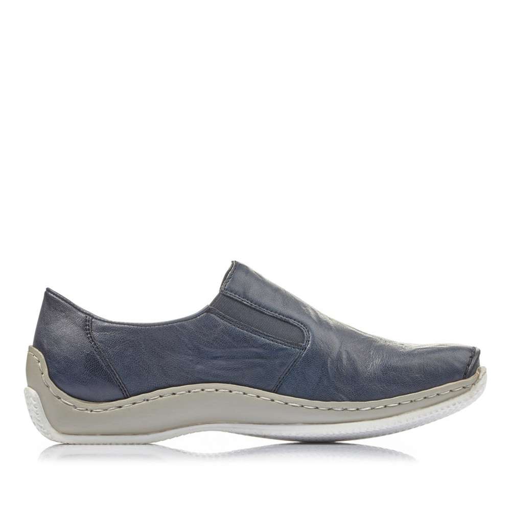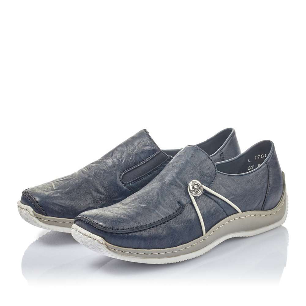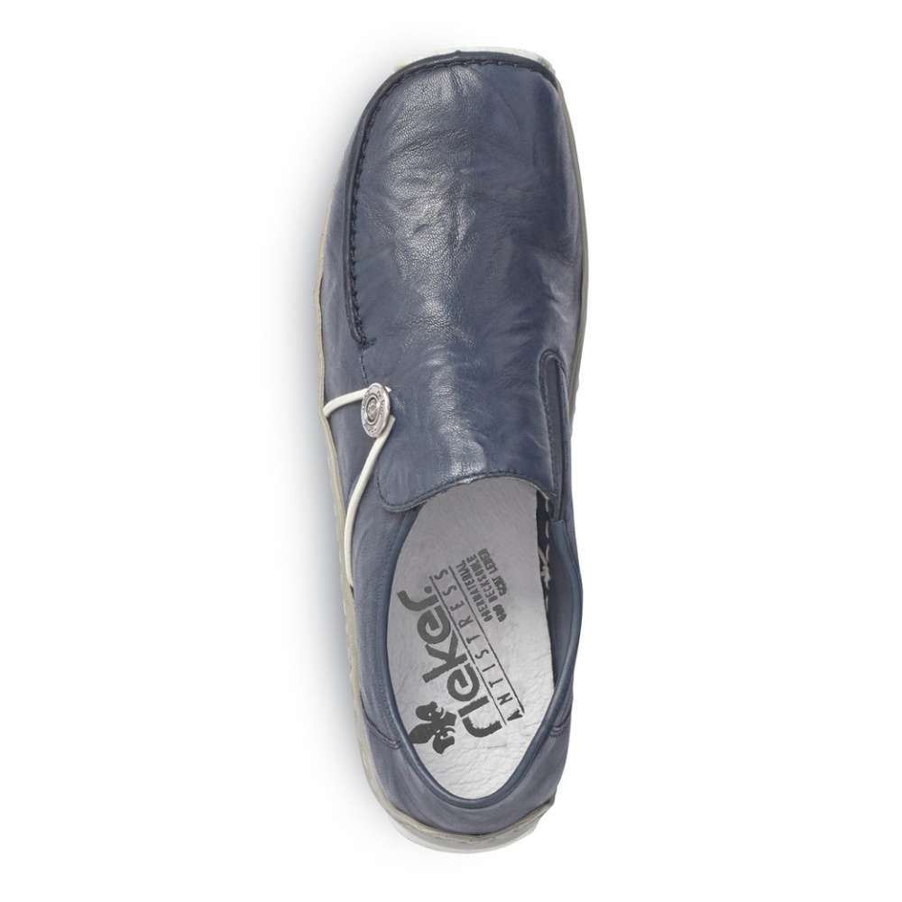 Svršek tmavě modré barvy je na špičce obuvi ozdoben výrazným švem a na vnější straně je zdobným prvkem kovové logo značky RIEKER, které je svázáno pružnou kulatou gumičkou. Snadné nazouvání a přizpůsobení dle požadavků zajistí všitá pružná gumička v oblasti nártu