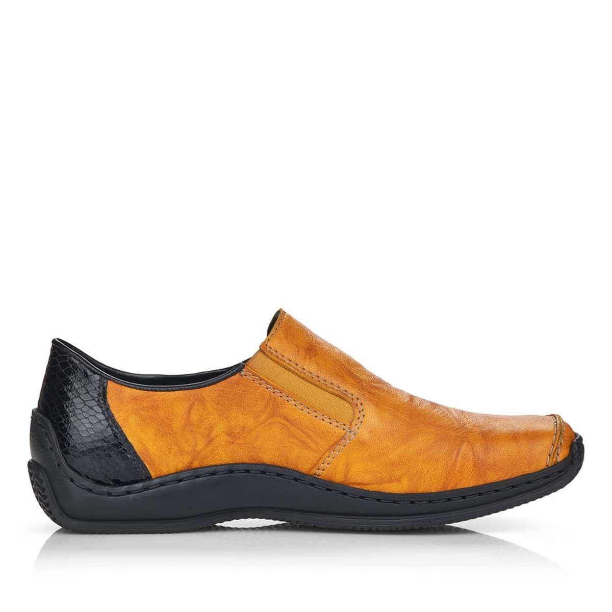 Svršek žluté barvy v kombinaci černého lesku za patou je na špičce obuvi ozdoben výrazným švem a na vnější straně je zdobným prvkem cvok s logem značky RIEKER, který je svázán pružnou kulatou gumičkou.