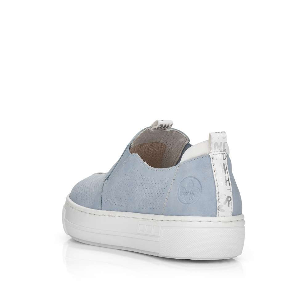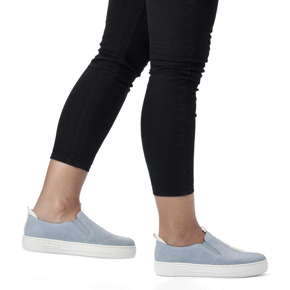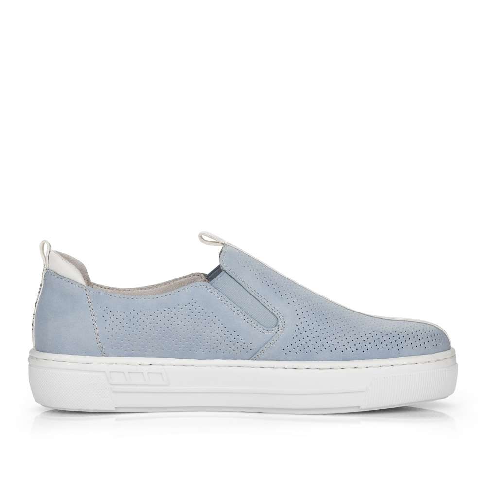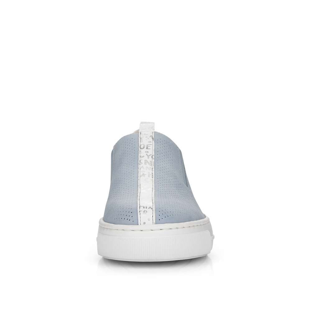 Ležérní mokasíny v bledě modrém odstínu s jemně perforovaným svrškem a decentním logem značky RIEKER v zadní části. Pružné gumičky po stranách a textilní poutka u horního okraje skvěle napomůžou Vašemu obutí. Jistě také oceníte měkkou stélku z přírodní usně, jenž dodá běžné chůzi pohodlnost a komfort. Ideální model na nákupy s kamarádkami nebo na výlet s rodinou. Technologie: Antistress – podešev je díky této technologii lehká, flexibilní, absorbuje nárazy při došlapu a snadno se přizpůsobí každé noze.