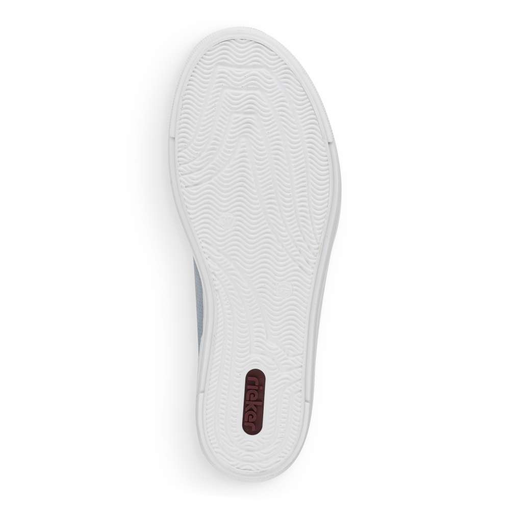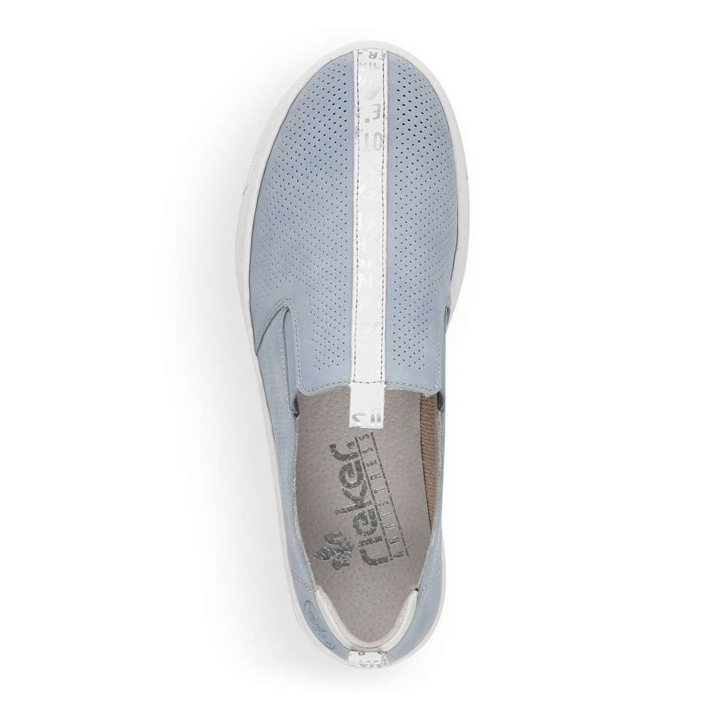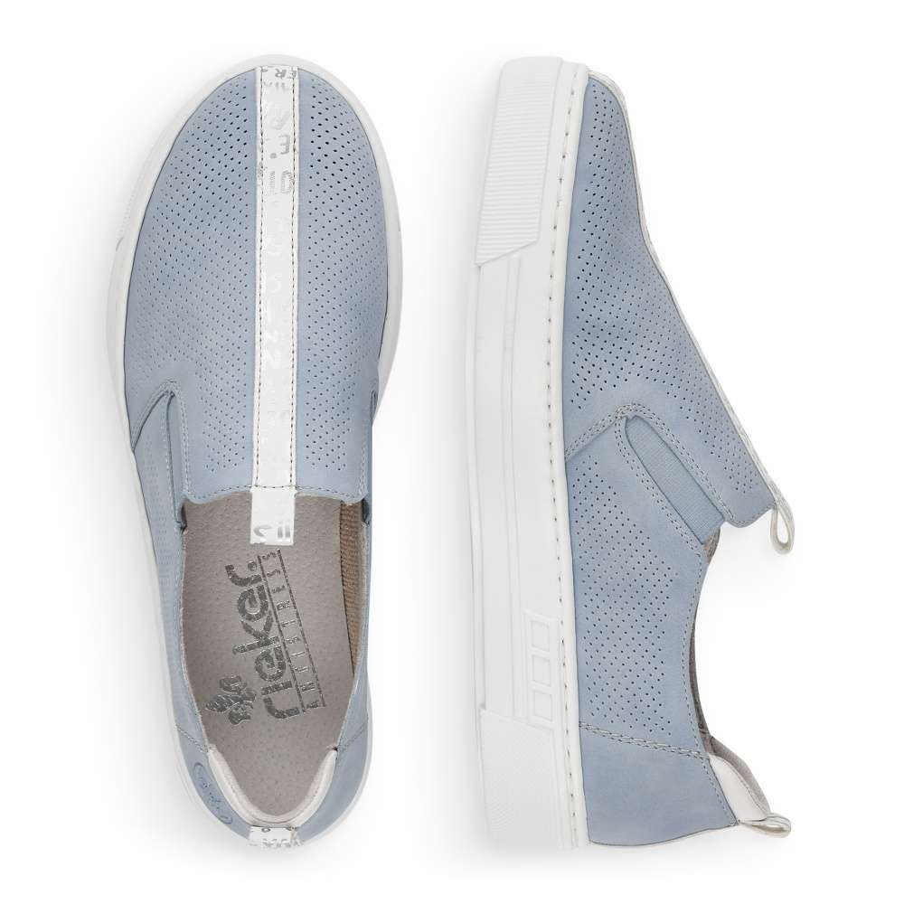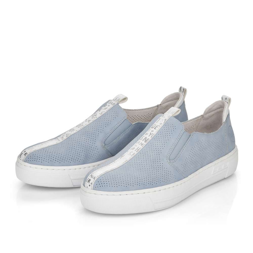 Ležérní mokasíny v bledě modrém odstínu s jemně perforovaným svrškem a decentním logem značky RIEKER v zadní části. Pružné gumičky po stranách a textilní poutka u horního okraje skvěle napomůžou Vašemu obutí. Jistě také oceníte měkkou stélku z přírodní usně, jenž dodá běžné chůzi pohodlnost a komfort. Ideální model na nákupy s kamarádkami nebo na výlet s rodinou. Technologie: Antistress – podešev je díky této technologii lehká, flexibilní, absorbuje nárazy při došlapu a snadno se přizpůsobí každé noze.