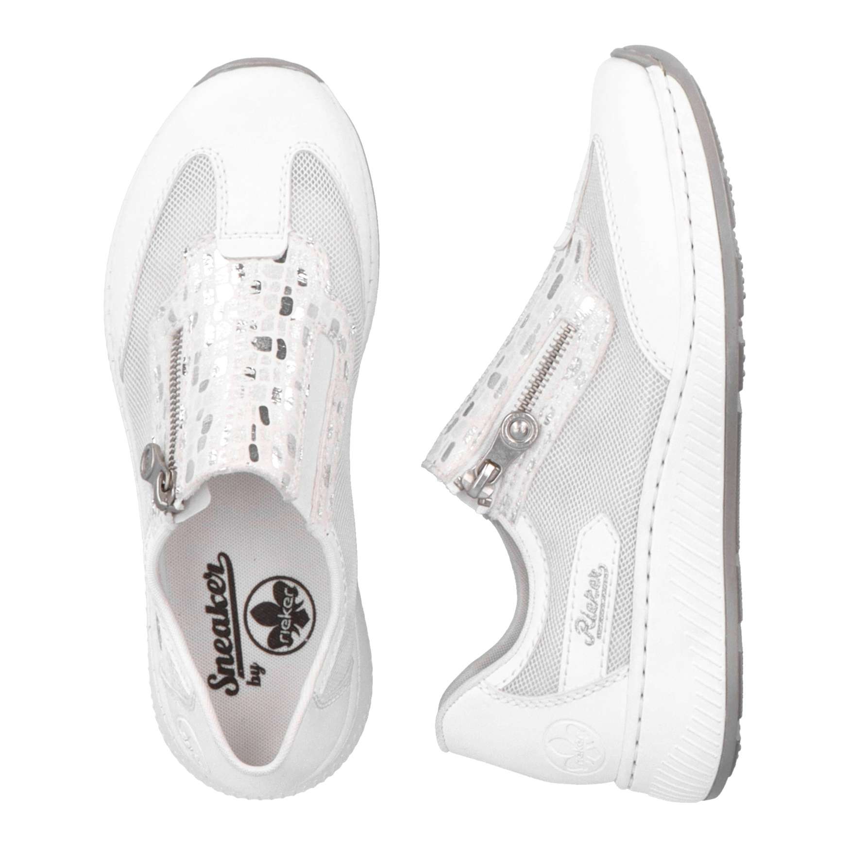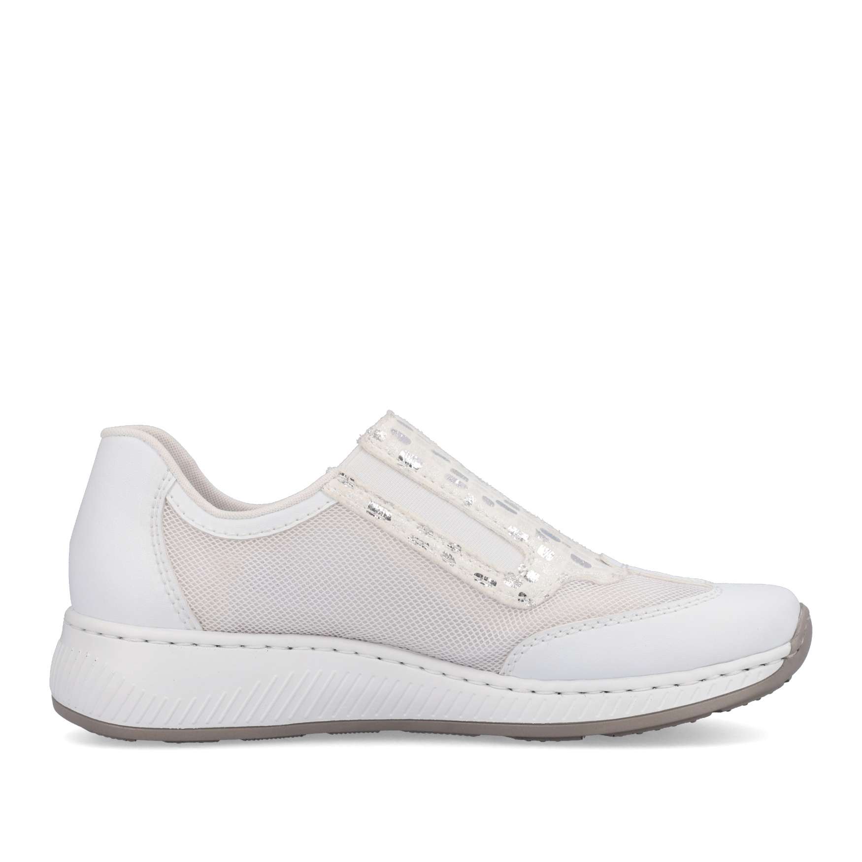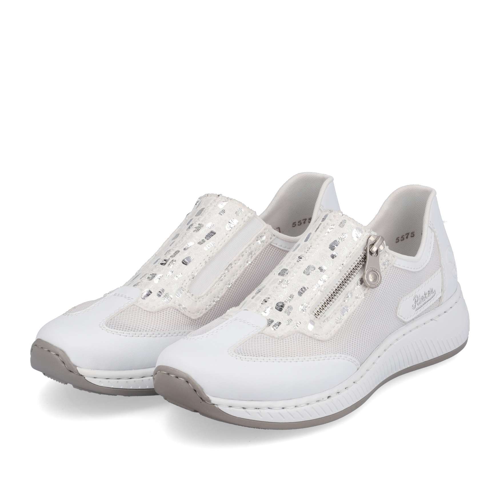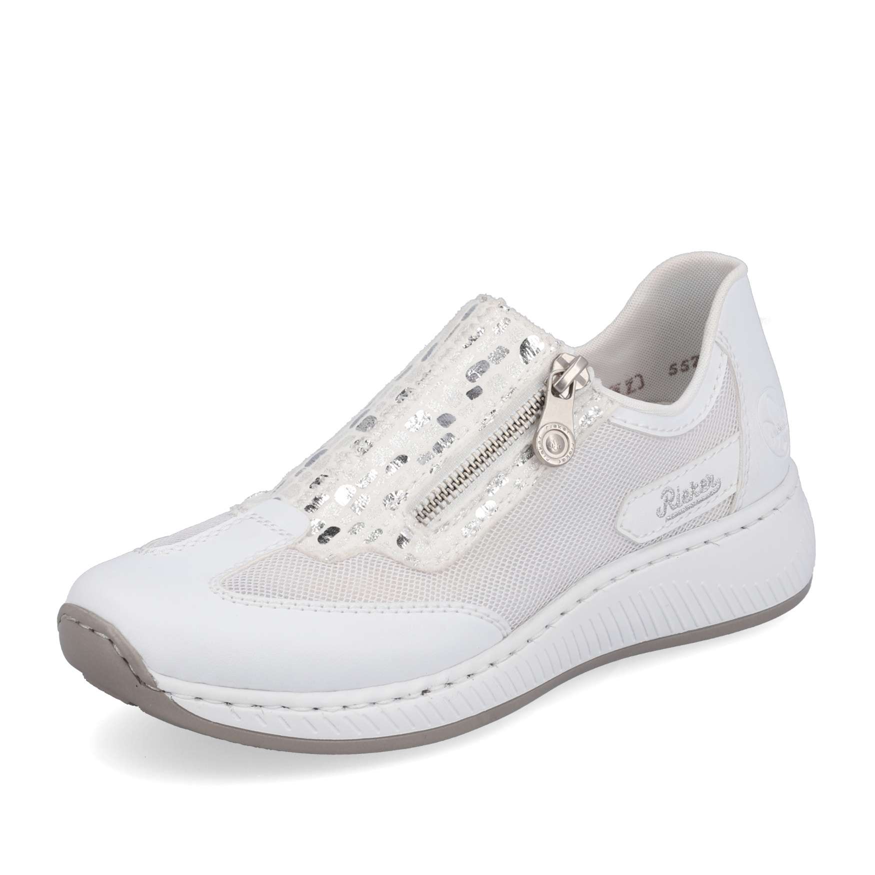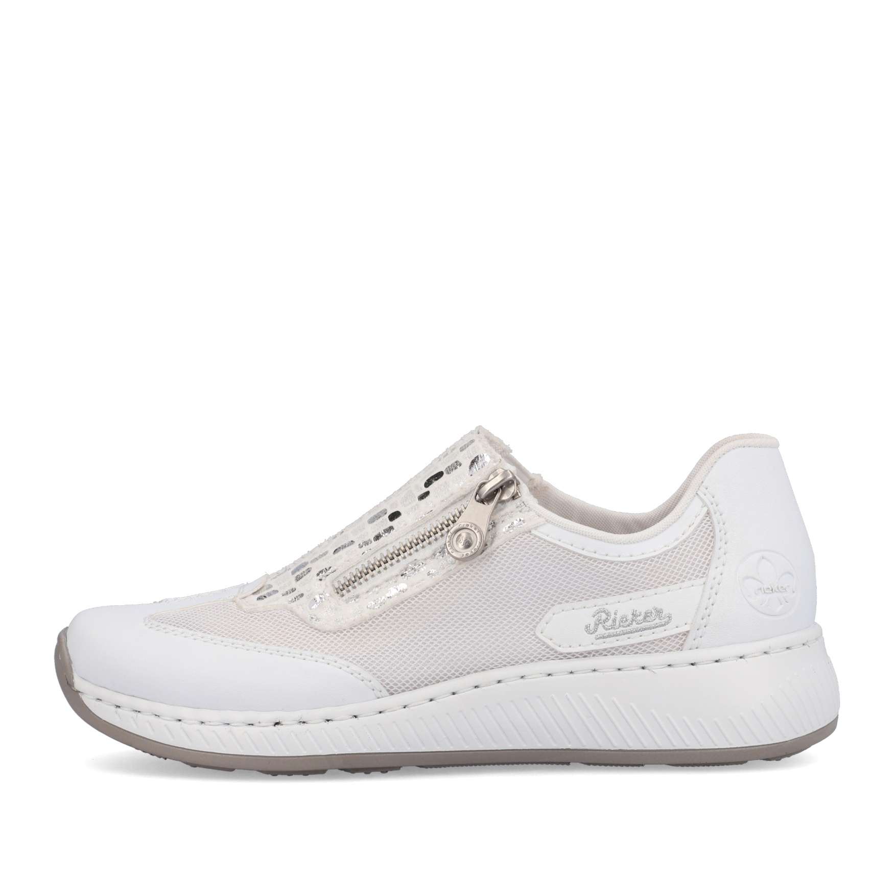Tento neotřelý designový kousek z dílny značky RIEKER musíte mít ve svém botníku! Bílý svršek je na nártu ozvláštněn částí s lesklým potiskem a po stranách nalezneme pružný textilní materiál, který činí obuv prodyšnou. Snadno a rychle obuv nazujete díky funkčnímu zipu a pružné gumičce. Měkká textilní stélka zajistí příslušný komfort a podešev svým šedým lemováním doladí vzhled obuvi k dokonalosti. Tenisky zaručeně oživí Vaše outfity na procházkách městem. Technologie: Antistress – podešev je díky této technologii lehká, flexibilní, absorbuje nárazy při došlapu a snadno se přizpůsobí každé noze.