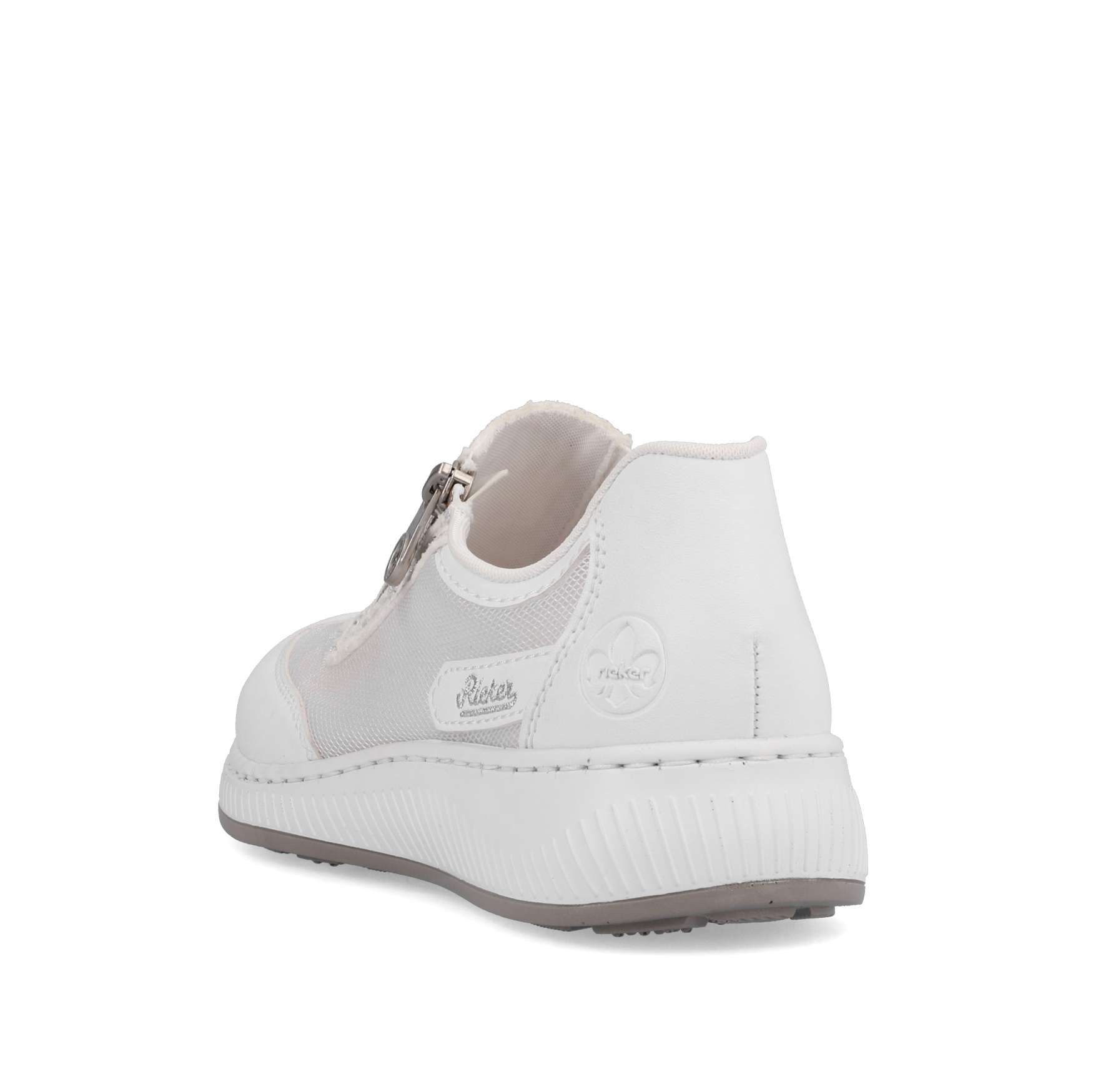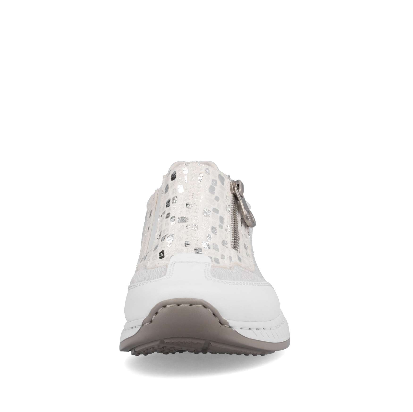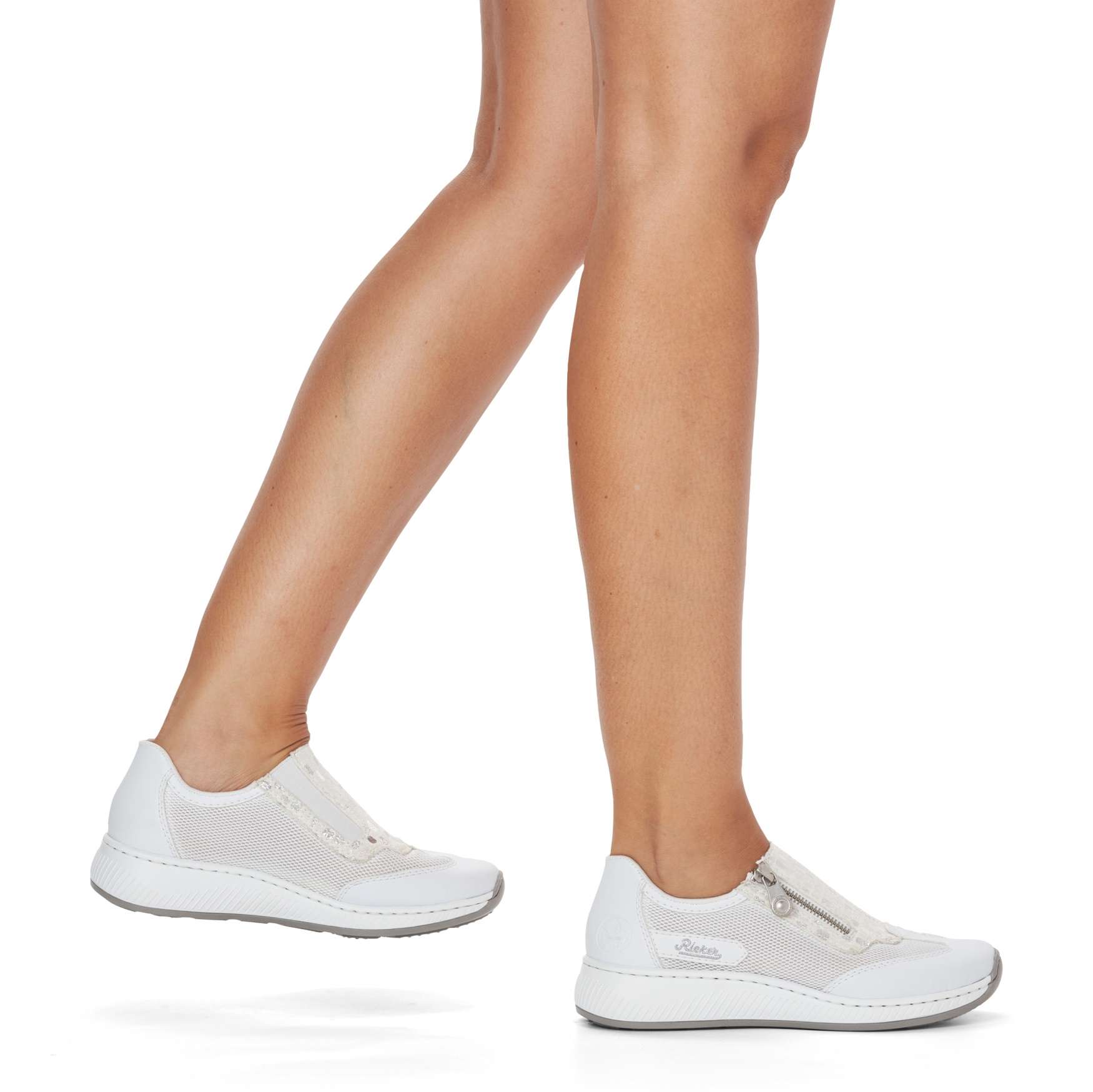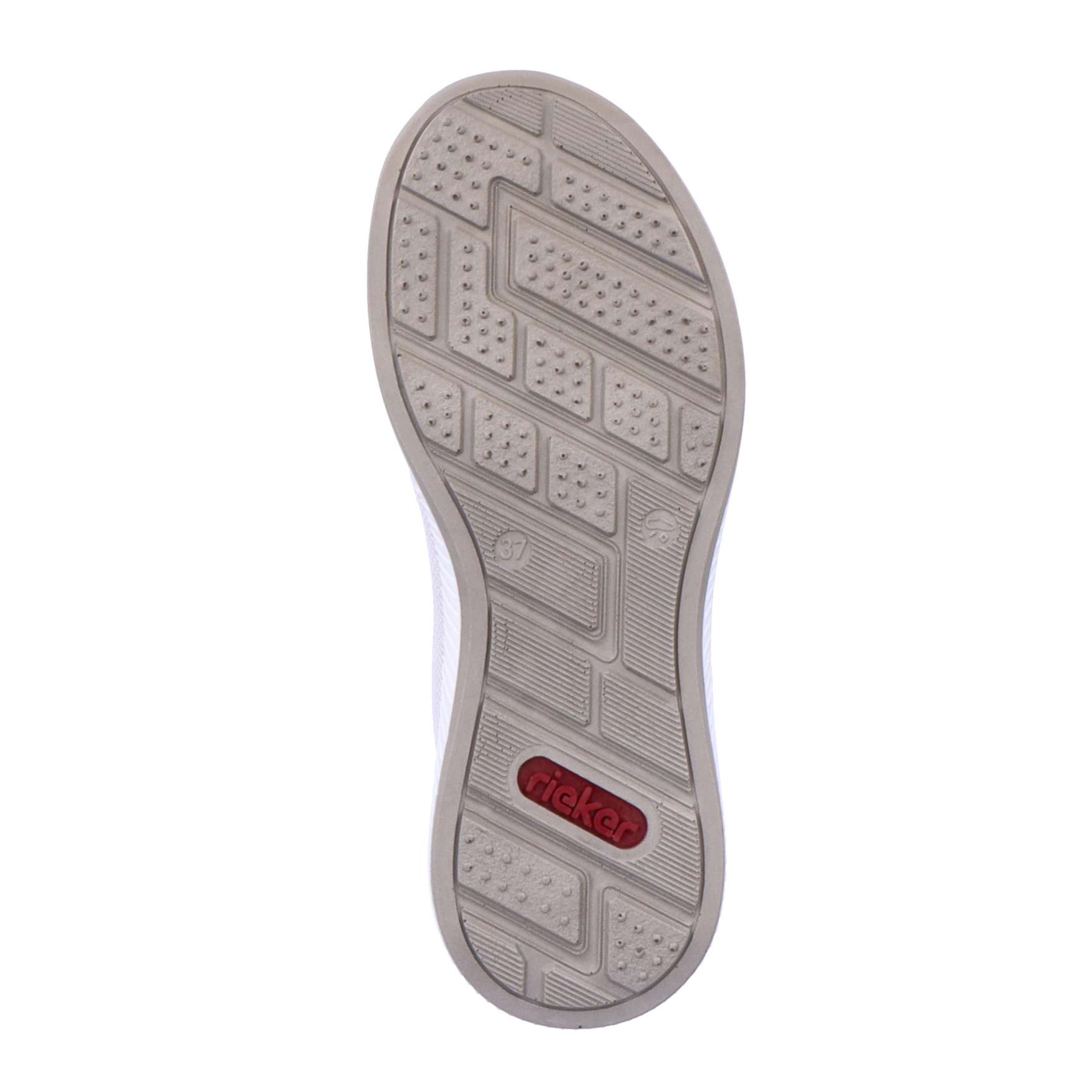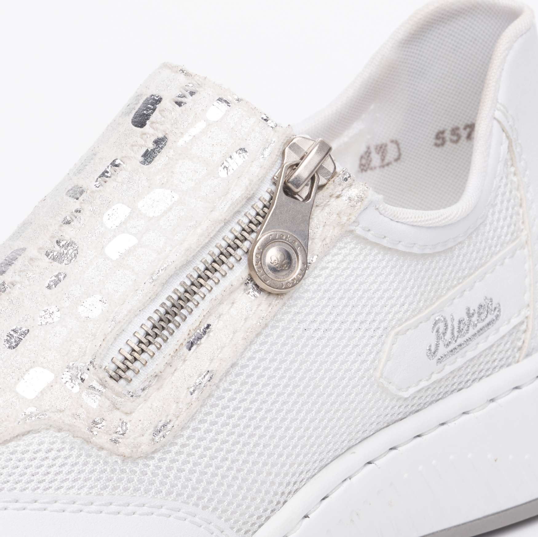 Tento neotřelý designový kousek z dílny značky RIEKER musíte mít ve svém botníku! Bílý svršek je na nártu ozvláštněn částí s lesklým potiskem a po stranách nalezneme pružný textilní materiál, který činí obuv prodyšnou. Snadno a rychle obuv nazujete díky funkčnímu zipu a pružné gumičce. Měkká textilní stélka zajistí příslušný komfort a podešev svým šedým lemováním doladí vzhled obuvi k dokonalosti. Tenisky zaručeně oživí Vaše outfity na procházkách městem. Technologie: Antistress – podešev je díky této technologii lehká, flexibilní, absorbuje nárazy při došlapu a snadno se přizpůsobí každé noze.