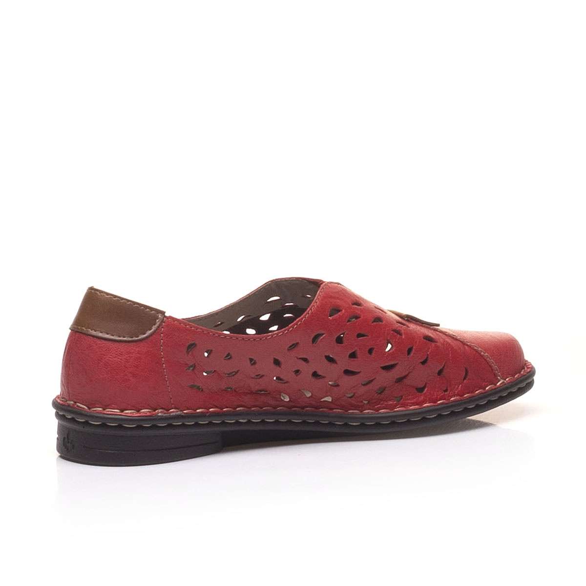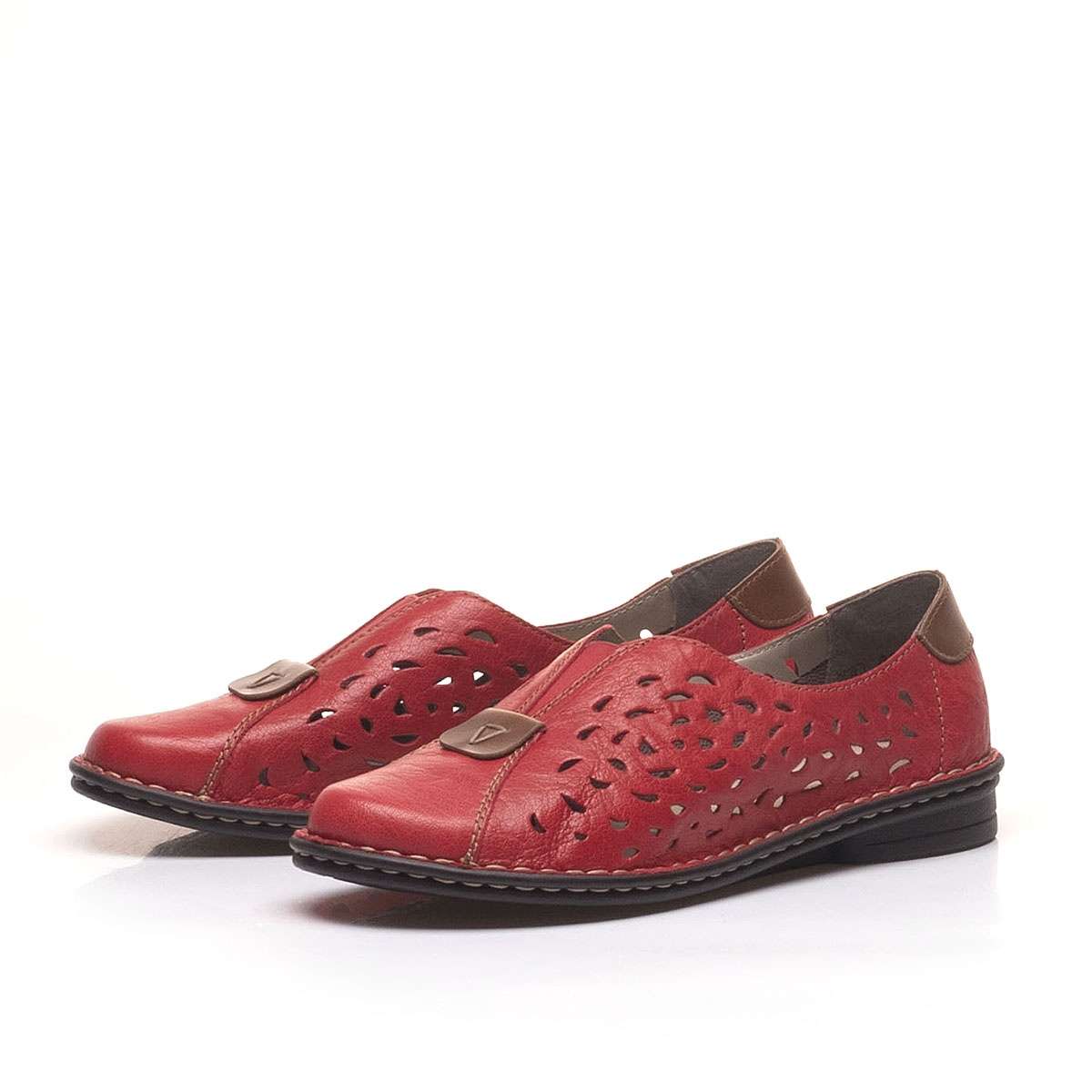 Červené výrazné mokasíny s perforací, oblou špičkou a hnědým detailem u špičky. Díky vsazené gumičce na nártu se lehce nazouvají a přizpůsobí se Vaší noze i většímu nártu.