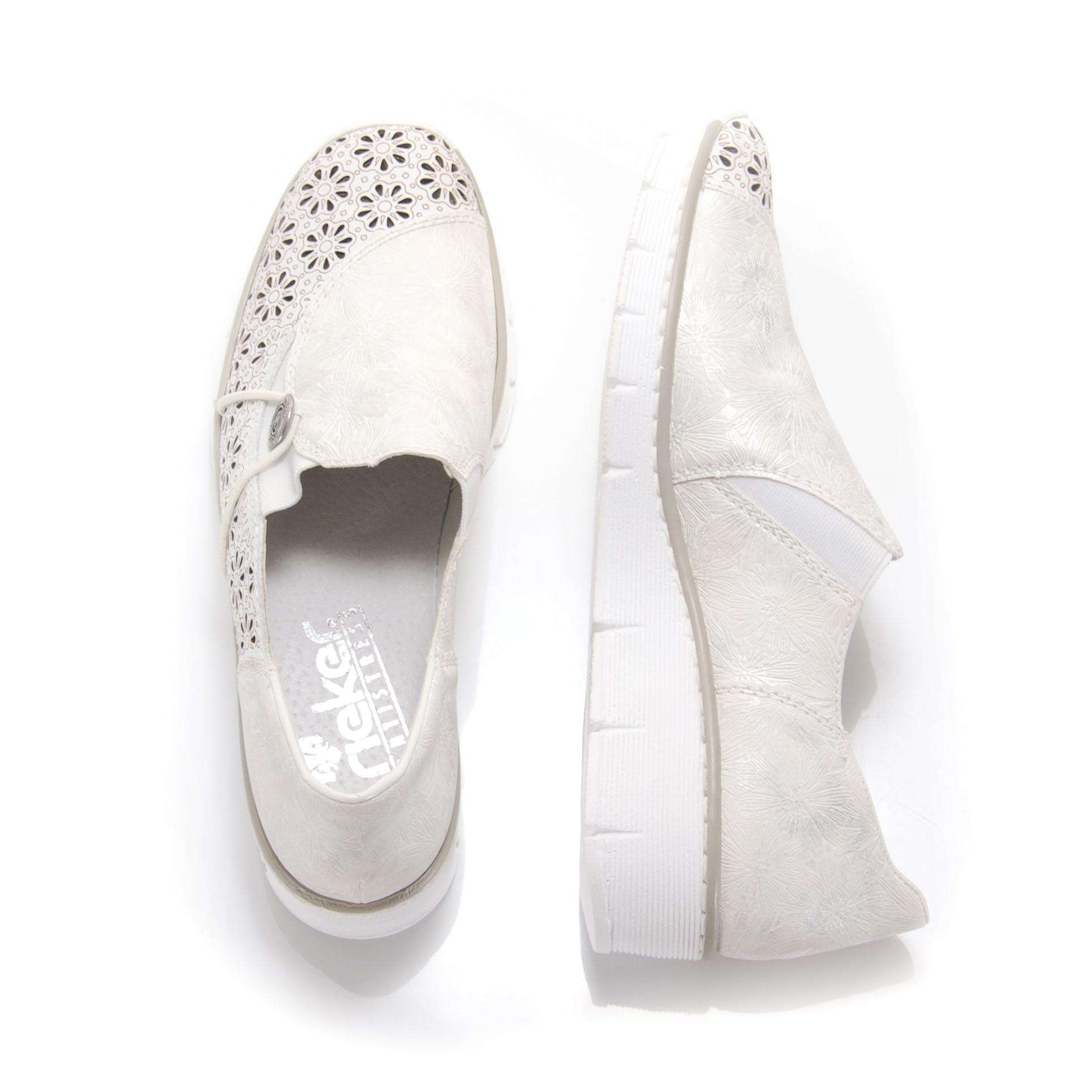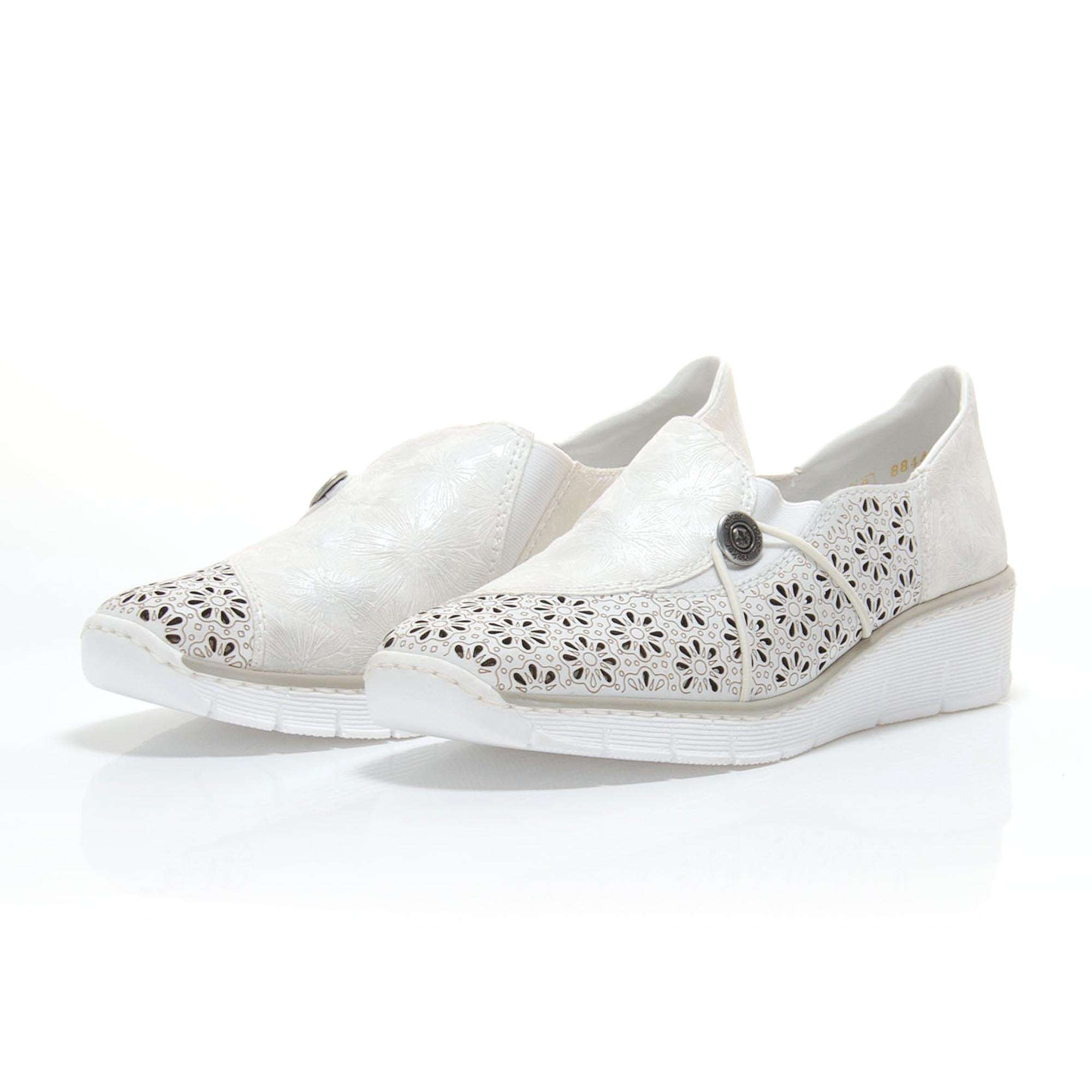 Dámské polobotky bílé barvy zdobené perforací ve tvaru květin a knoflíčkem na vnější straně. Na straně najdete vsazené gumičky, díky kterým je obouvání nejen rychlé ale také pohodlné. Tato obuv má nízký klínek, je vhodná pro celodenní nošení a využijete ji na mnoho příležitostí.