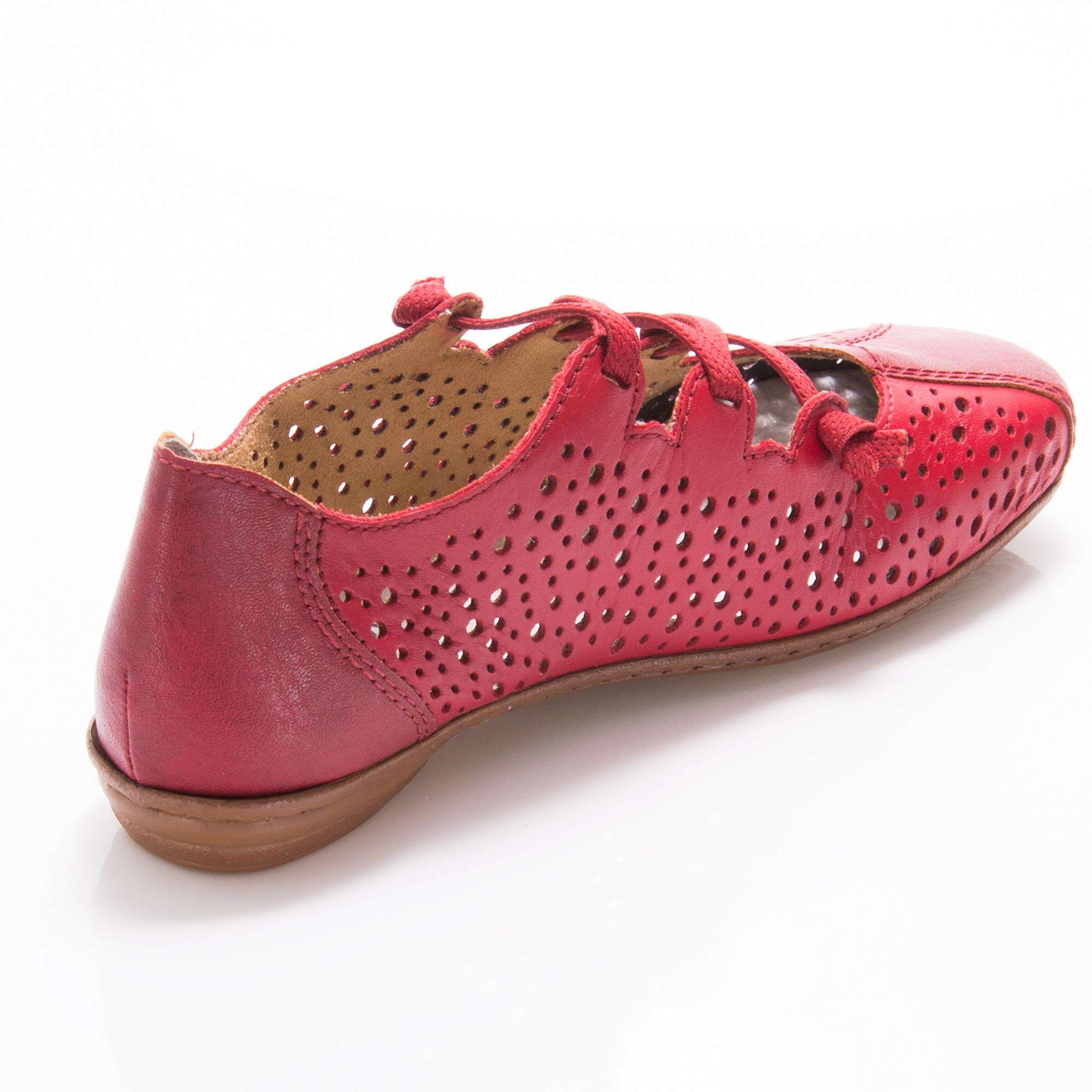 Dámské polobotky červené barvy s hladkým povrchem a kulatou špičkou jsou zdobeny perforací. Místo tkaniček je zde pružná gumička pro lepší přizpůsobení k Vaší noze. Tento model unosíte jak do práce k sukni, tak na běžné pochůzky městem či na nákupy.