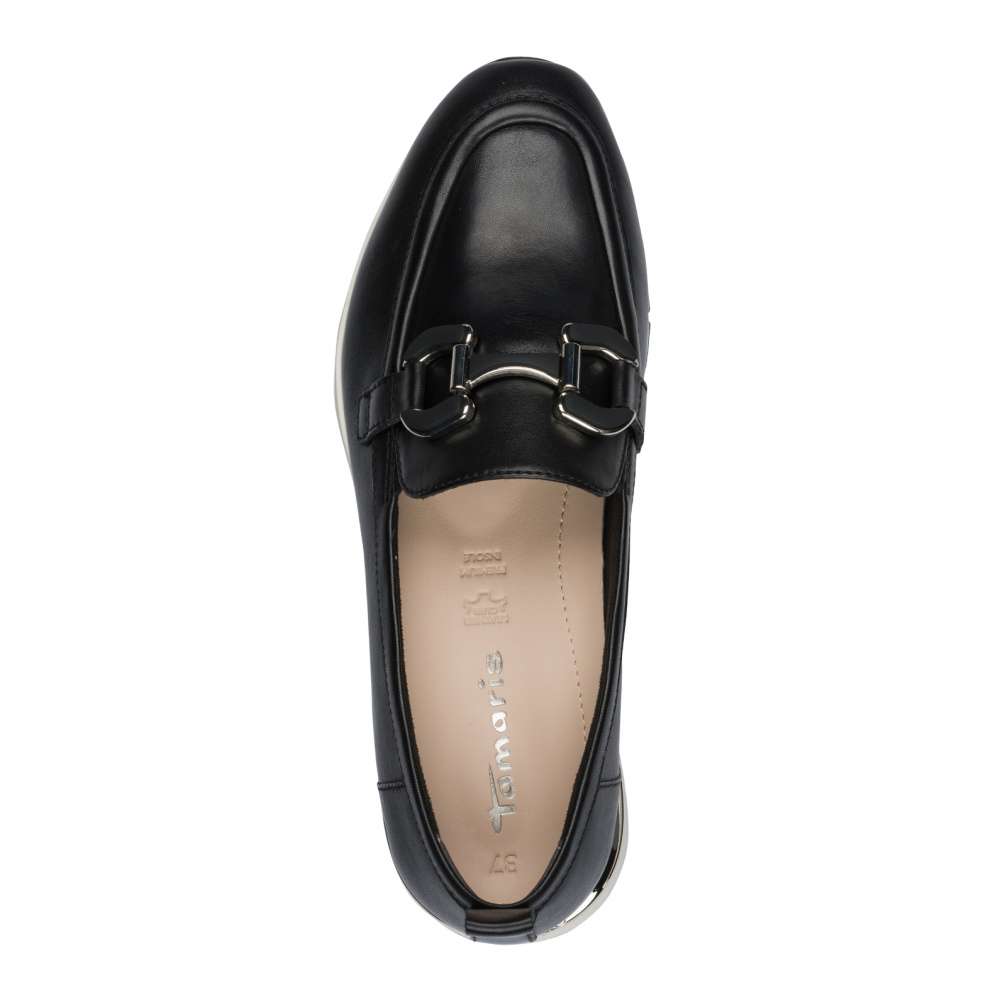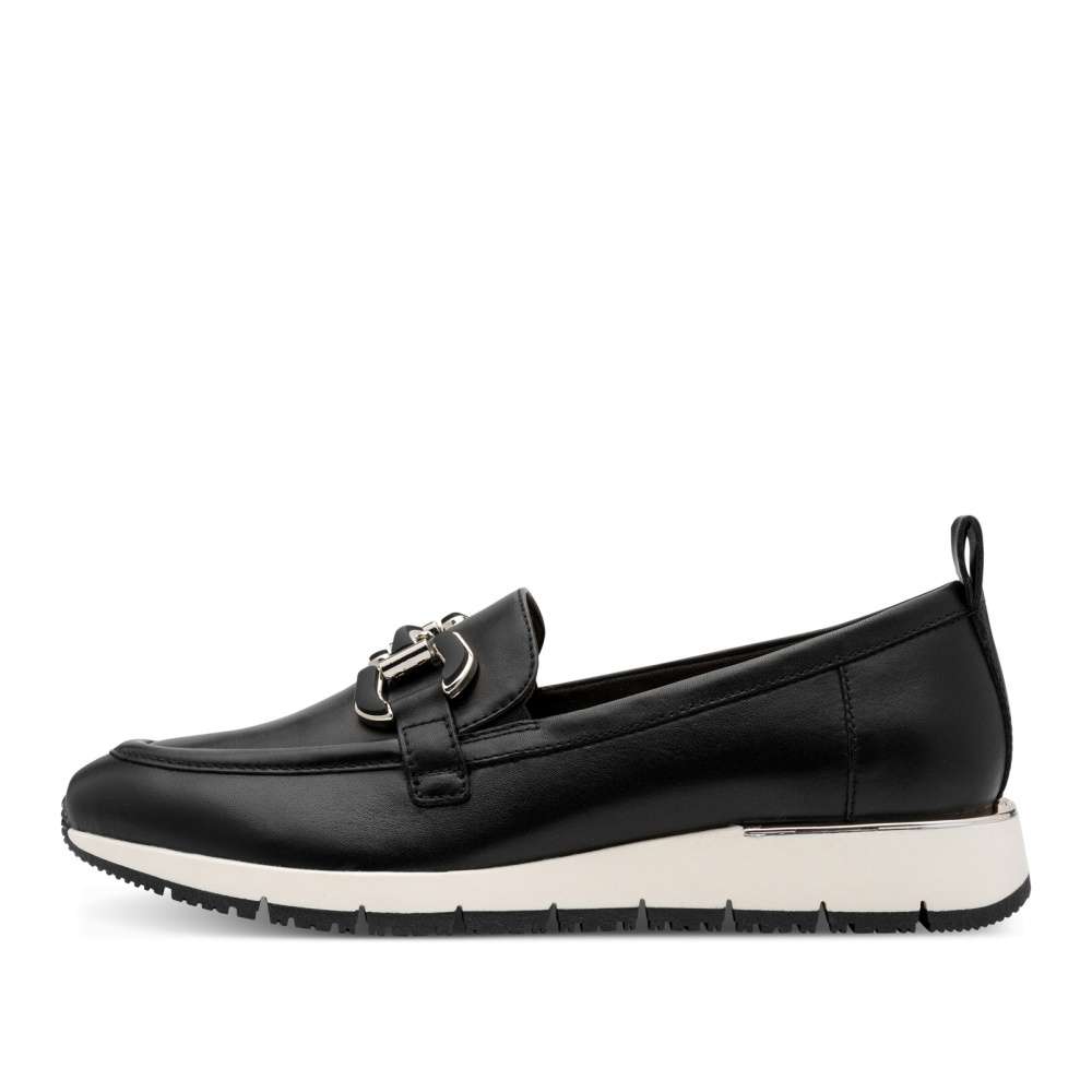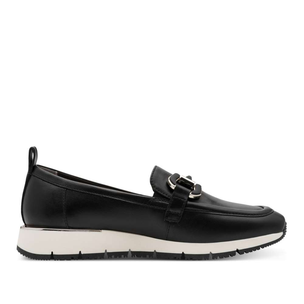 Kožené mokasíny Tamaris jsou dokonalým ztělesněním módního pohodlí. Černý kožený svršek zdobí výrazná spona na nártu a atraktivitu vzhledu zvýrazňuje i barevný kontrast se svetlou podešví. Kožená stélka zajistí příjemný pocit při každém kroku a podešev poskytne oporu každého kroku. Tento model Tamaris není jen obuví – je vyjádřením vytříbeného vkusu a sebevědomé elegance ženy, která ví, že skutečný luxus spočívá v detailech.