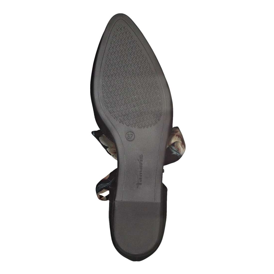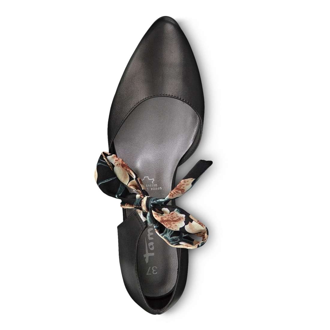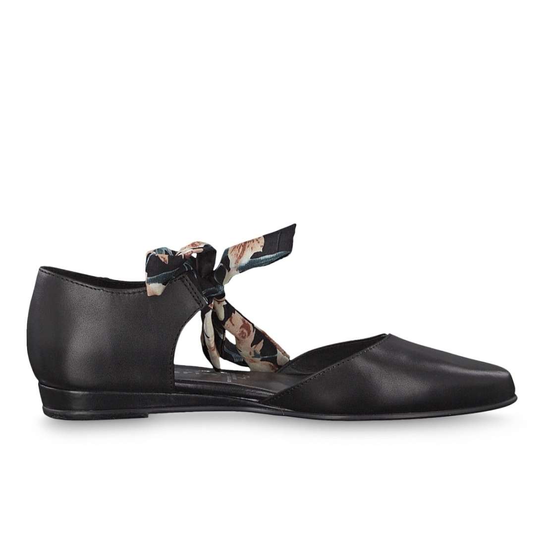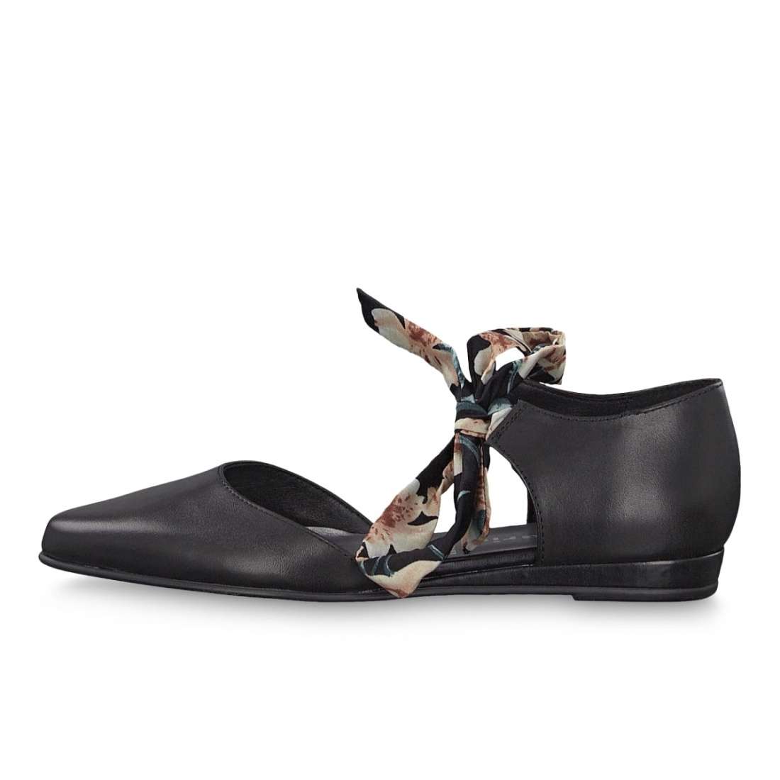 Dámské kožené mokasíny černé barvy se zdobnou textílií květinového vzoru, která slouží k upevnění mokasín na noze. Po bocích jsou mokasíny vykrojené. Celkový vzhled mokasín je nevšední a elegantní. Tuto obuv unosíte jak do práce, tak na procházky i vzácné příležitosti.