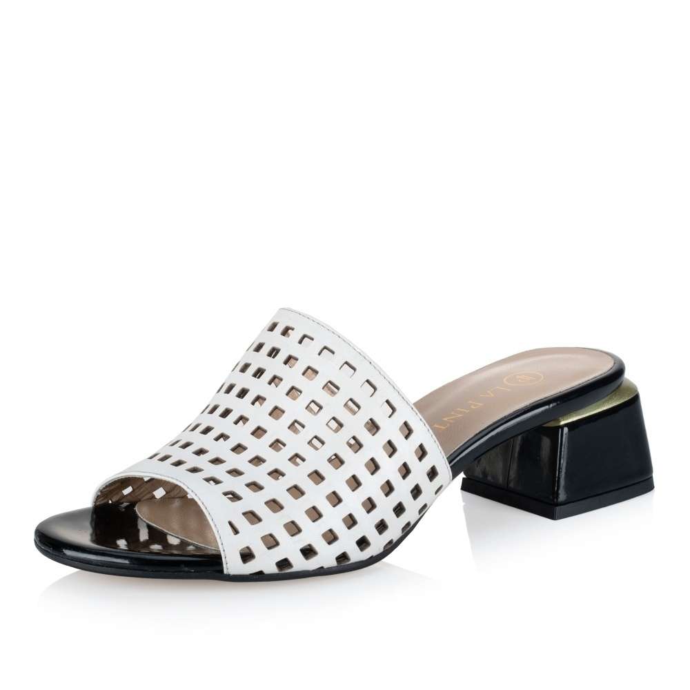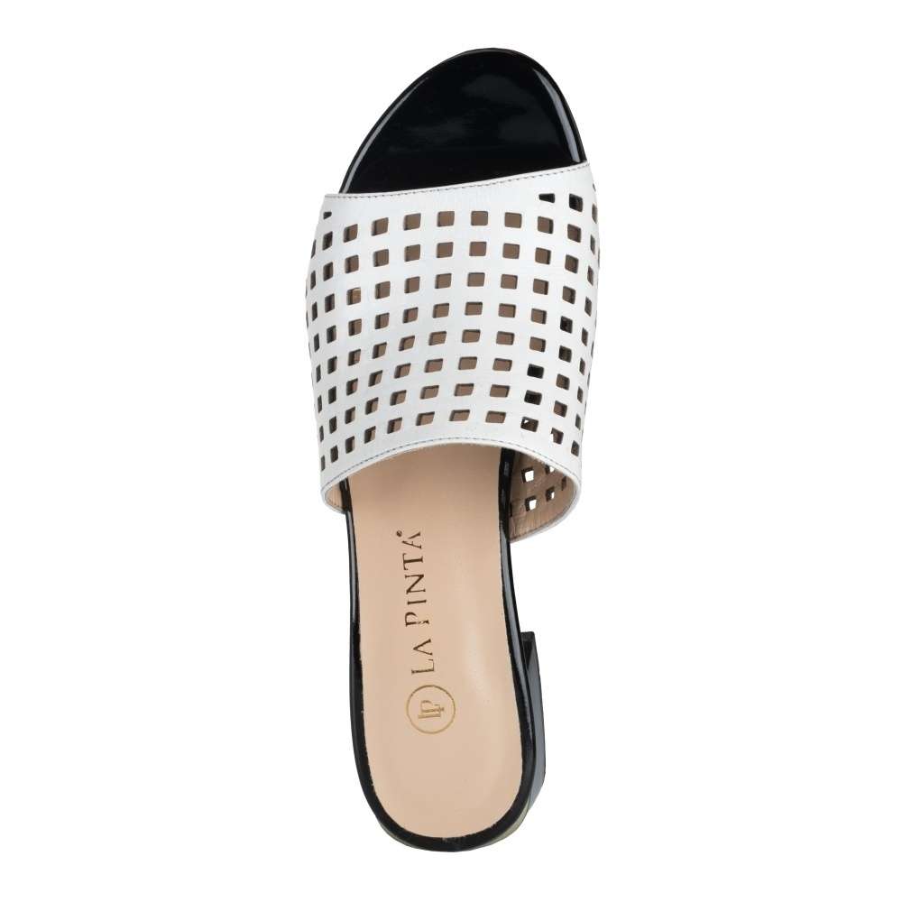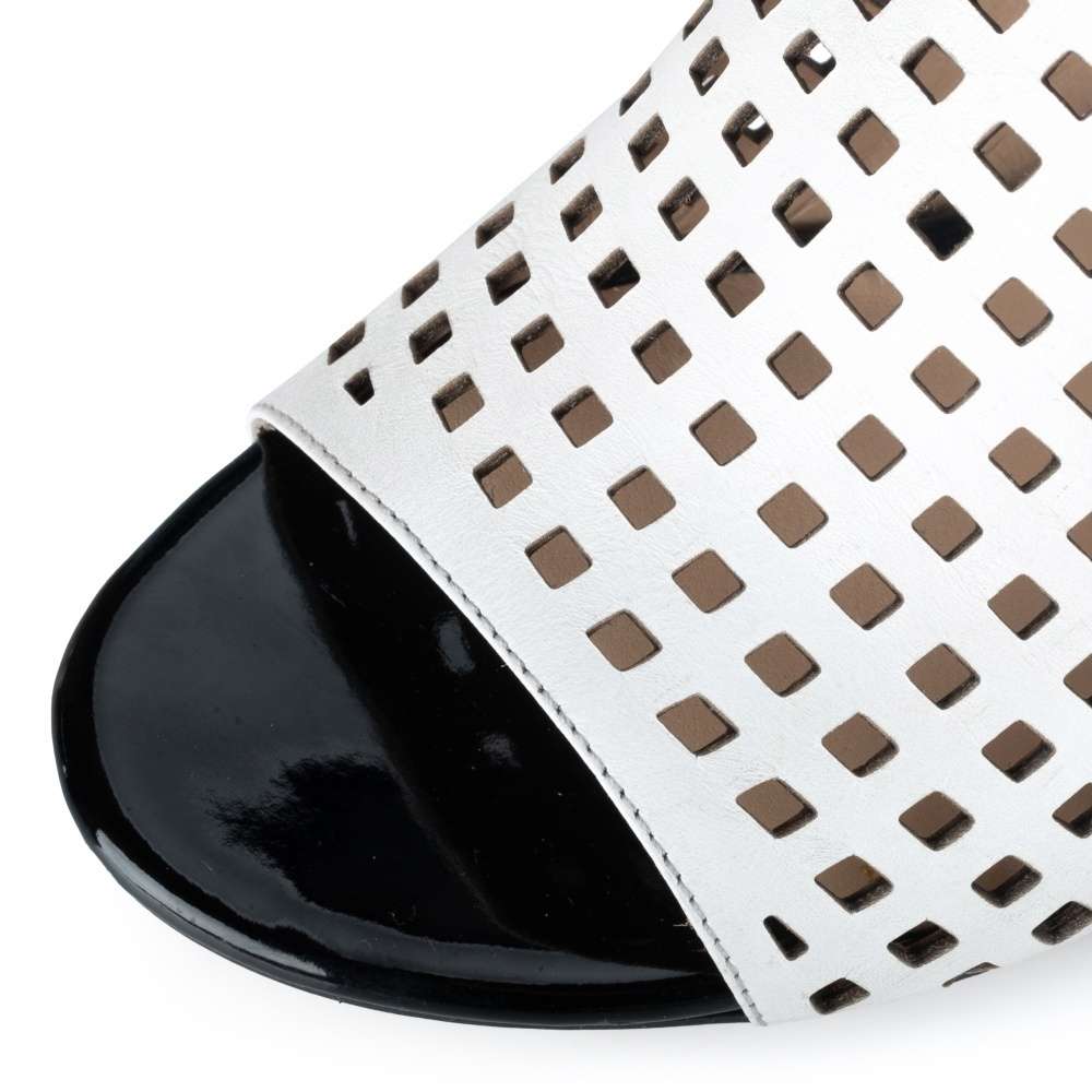 Detailní informace Nádherné nazouváky IBERIUS s bílým svrškem zdobeným perforací ve tvaru čtverců jsou elegantní doplňkem pro různé příležitosti. Jejich nízký podpatek v lesklém provedení má lemování zlatým páskem, který dodává obuvi luxusní vzhled. Kožená měkká stélka dodává pohodlí a pocit luxusu každému kroku. Tato kombinace stylu a kvality je ideální pro každodenní nošení i pro speciální události.