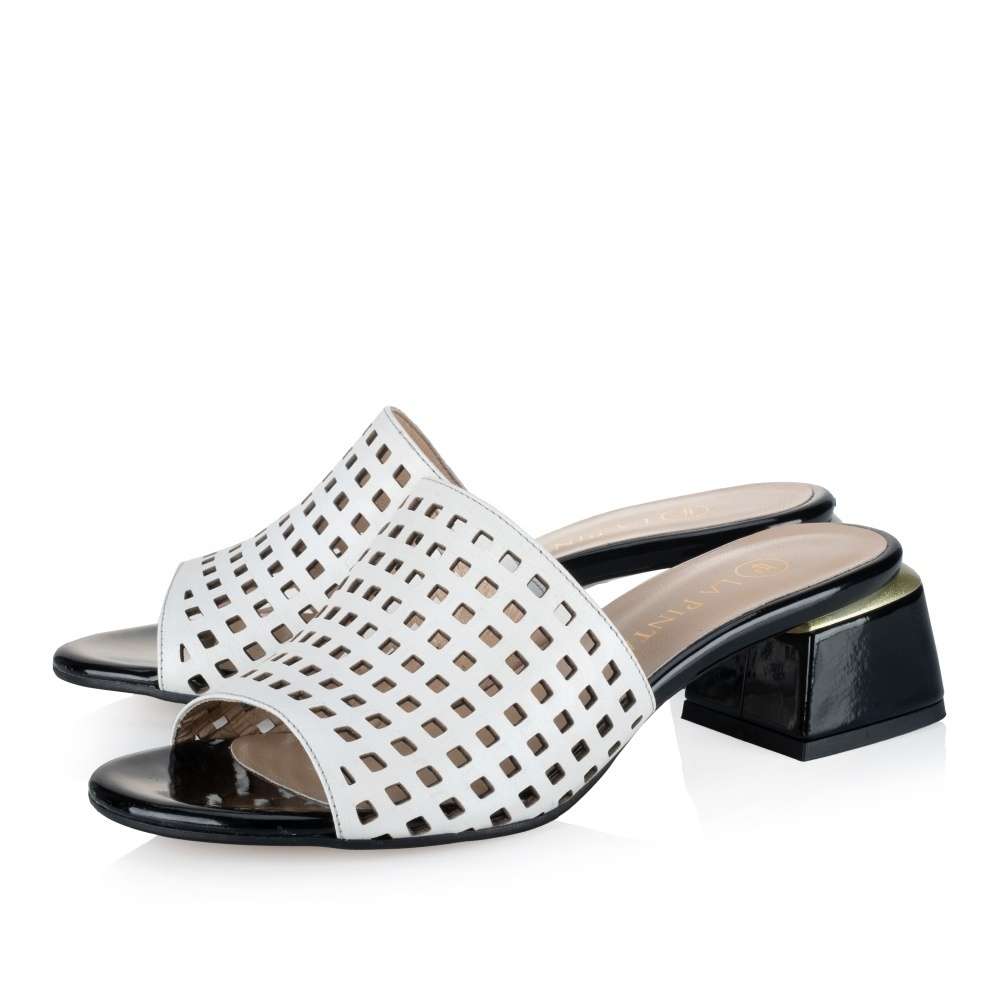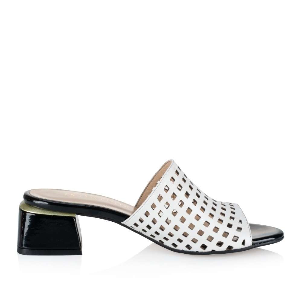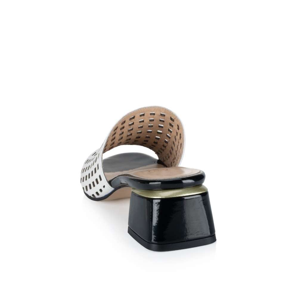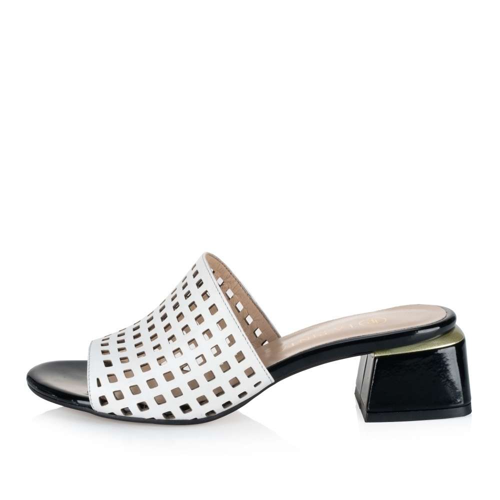 Nádherné nazouváky IBERIUS s bílým svrškem zdobeným perforací ve tvaru čtverců jsou elegantní doplňkem pro různé příležitosti. Jejich nízký podpatek v lesklém provedení má lemování zlatým páskem, který dodává obuvi luxusní vzhled. Kožená měkká stélka dodává pohodlí a pocit luxusu každému kroku. Tato kombinace stylu a kvality je ideální pro každodenní nošení i pro speciální události.