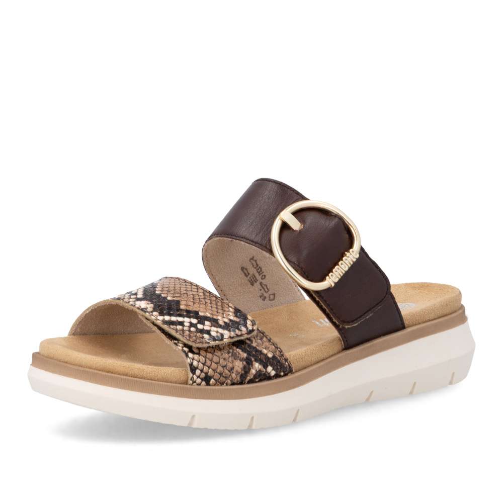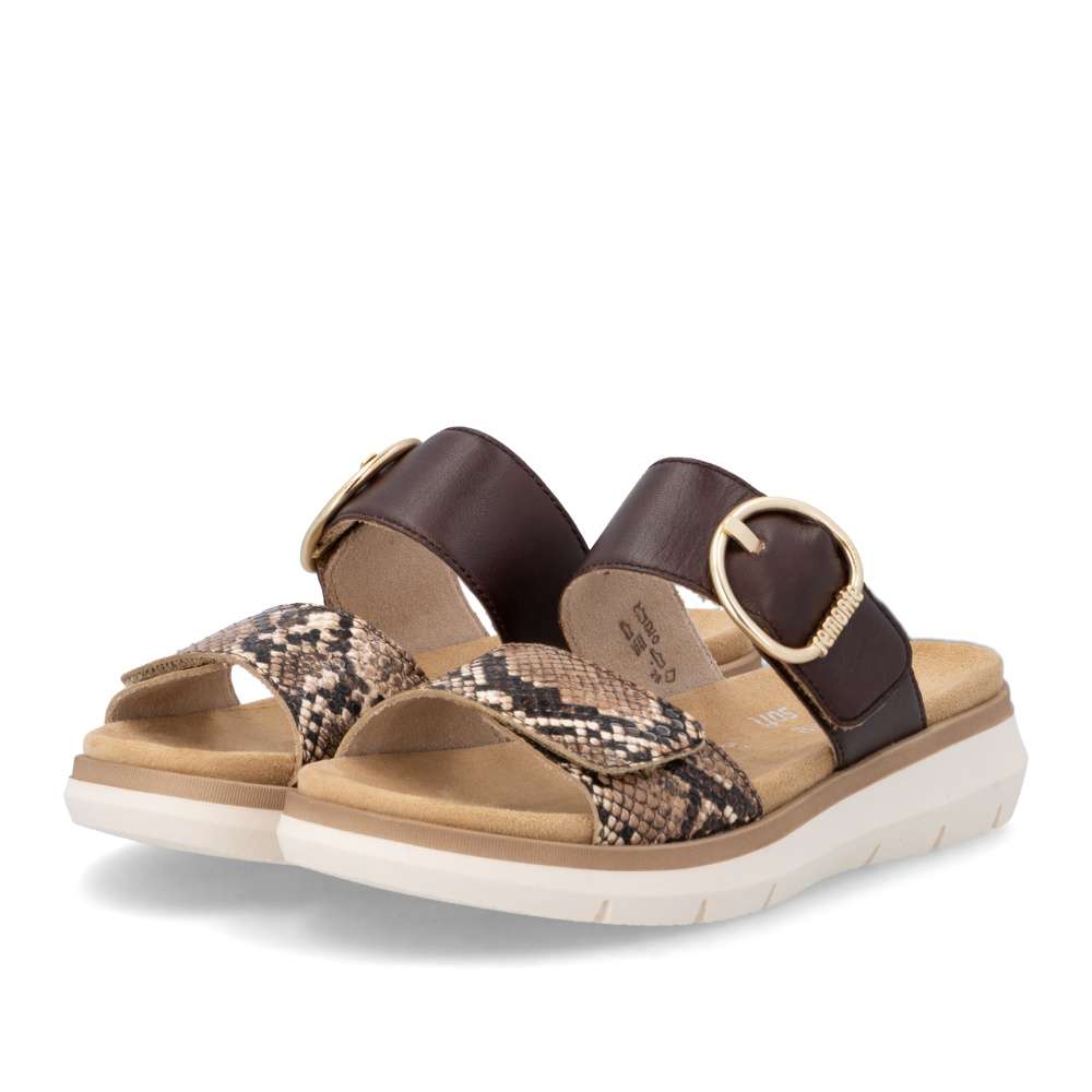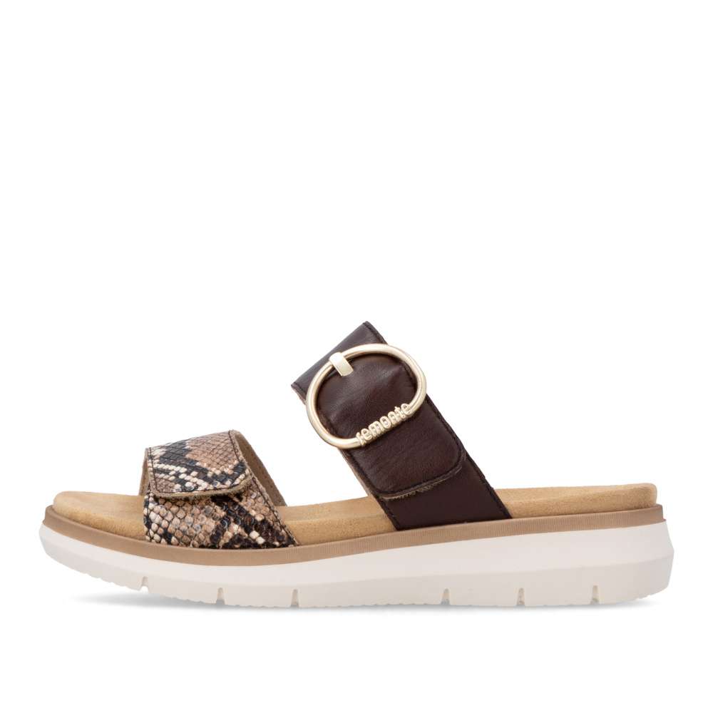 Obuv REMONTE představuje prémiovou řadu značky RIEKER, která se vyznačuje vysokou kvalitou použitých materiálů a precizním zpracováním. Tyto nazouváky RIEKER jsou více než jen obuv – jsou výrazem stylu a komfortu pro moderní ženu, která si cení atraktivního designu a kvalitního zpracování. Působivá kombinace hnědého pásku a pásku se zvířecím vzorem vytváří vizuálně sofistikovaný kontrast, který dodává modelu jedinečný charakter. Výrazná spona u kotníku zdobená logem značky působí jako prestižní detail, který zvyšuje luxusní vzhled celého modelu. Pásky jsou pečlivě navrženy s důrazem na funkčnost i estetiku. Praktické suché zipy umožňují přesné přizpůsobení tvaru chodidla. Textilní stélka je vyjímatelná a přizpůsobí se konturám chodidla a extra komfort přináší širší střih bot. Podešev nazouváků je navržena s ohledem na optimální oporu, stabilitu a flexibilitu. Každý krok v těchto pantoflích je pohodlný, sebevědomý a stylový, čímž se stávají nepostradatelnou součástí vašeho šatníku a dokonalým společníkem během horkých letních dnů.