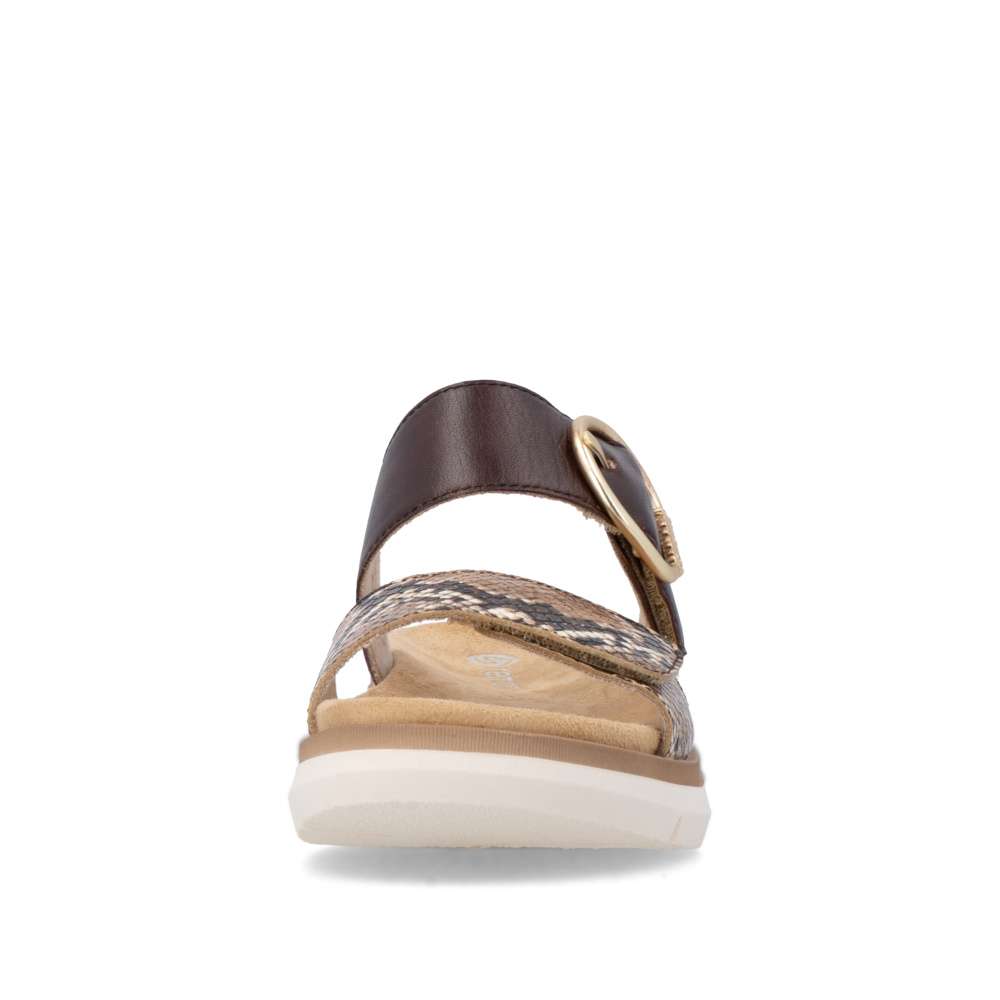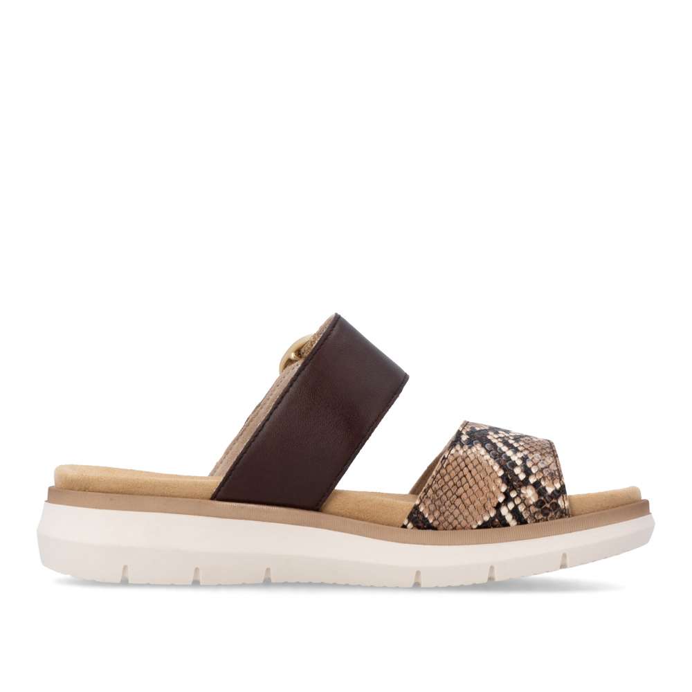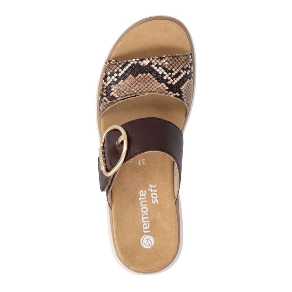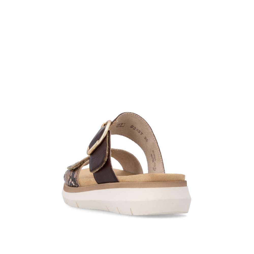 Obuv REMONTE představuje prémiovou řadu značky RIEKER, která se vyznačuje vysokou kvalitou použitých materiálů a precizním zpracováním. Tyto nazouváky RIEKER jsou více než jen obuv – jsou výrazem stylu a komfortu pro moderní ženu, která si cení atraktivního designu a kvalitního zpracování. Působivá kombinace hnědého pásku a pásku se zvířecím vzorem vytváří vizuálně sofistikovaný kontrast, který dodává modelu jedinečný charakter. Výrazná spona u kotníku zdobená logem značky působí jako prestižní detail, který zvyšuje luxusní vzhled celého modelu. Pásky jsou pečlivě navrženy s důrazem na funkčnost i estetiku. Praktické suché zipy umožňují přesné přizpůsobení tvaru chodidla. Textilní stélka je vyjímatelná a přizpůsobí se konturám chodidla a extra komfort přináší širší střih bot. Podešev nazouváků je navržena s ohledem na optimální oporu, stabilitu a flexibilitu. Každý krok v těchto pantoflích je pohodlný, sebevědomý a stylový, čímž se stávají nepostradatelnou součástí vašeho šatníku a dokonalým společníkem během horkých letních dnů.