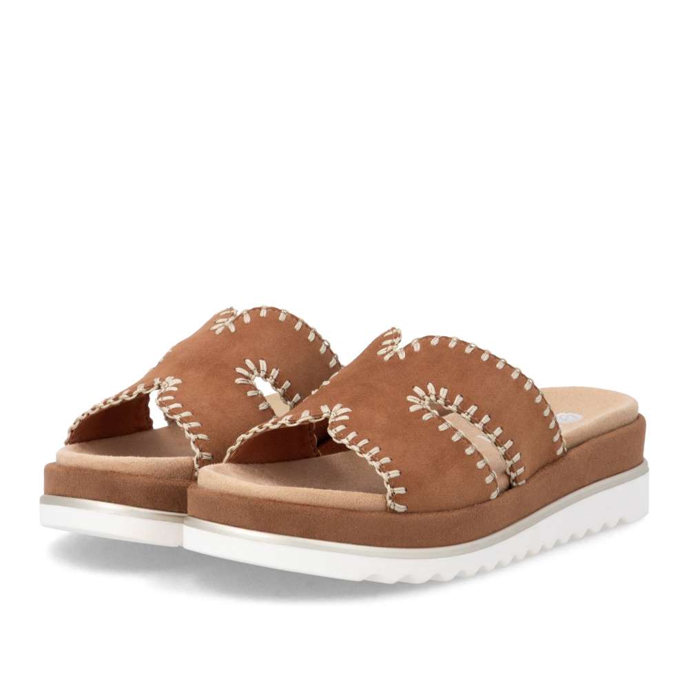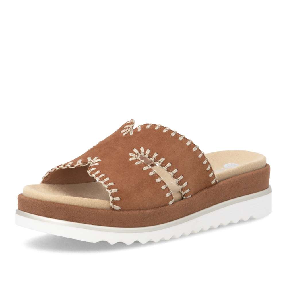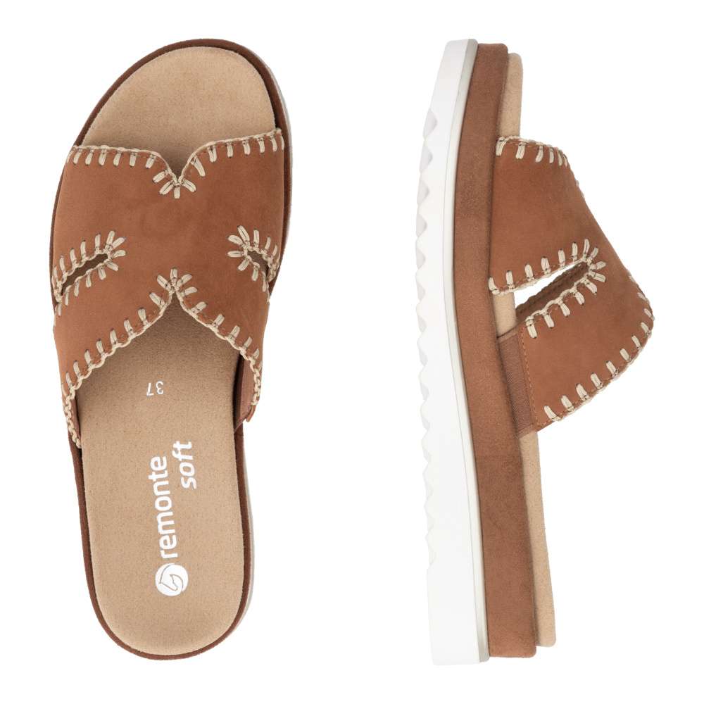 Obuv REMONTE představuje prémiovou řadu značky RIEKER, která se vyznačuje vysokou kvalitou použitých materiálů a precizním zpracováním. Nazouváky se stylovým hnědým koženým svrškem a efektním prošíváním po obvodu představují ideální kombinaci moderního designu a pohodlí. Prošívání nejen zvýrazňuje vzhled obuvi, ale dodává jí i jemný luxusní detail, který ocení každá žena dbající na styl. Vyjímatelná textilní stélka je tvarována tak, aby poskytovala pohodlí během celého dne a zároveň usnadnila údržbu obuvi. Potřebnou oporu každým krokem poskytne vyšší podešev a svým trendovým vzhledem vytváří výrazný vizuální efekt. Působí stylově a zároveň zvýrazňuje charakter tohoto modelu, čímž se stává skutečným doplňkem letního outfitu. Tyto nazouváky RIEKER spojují komfort, styl a lehkost každého kroku, díky čemuž se stanou vaším spolehlivým společníkem během celého léta.