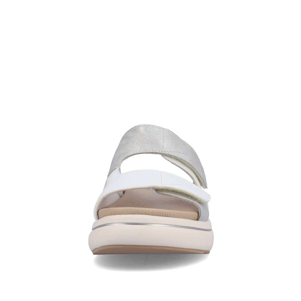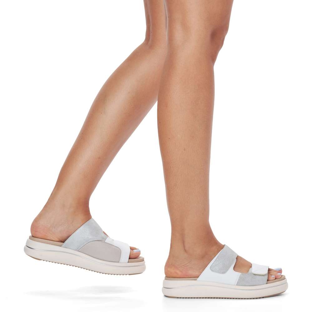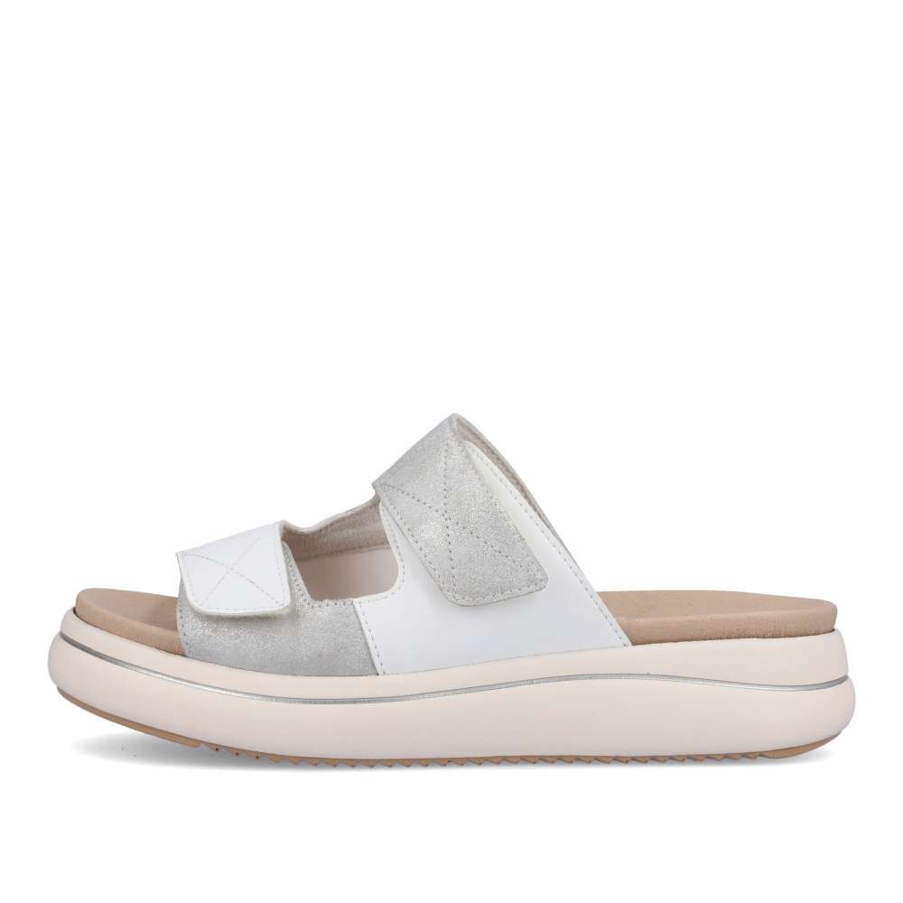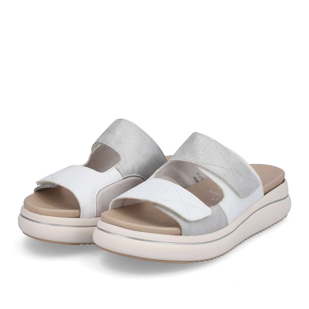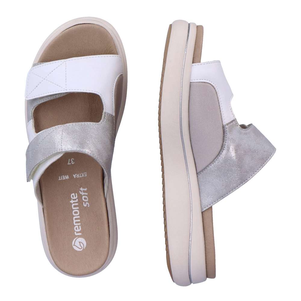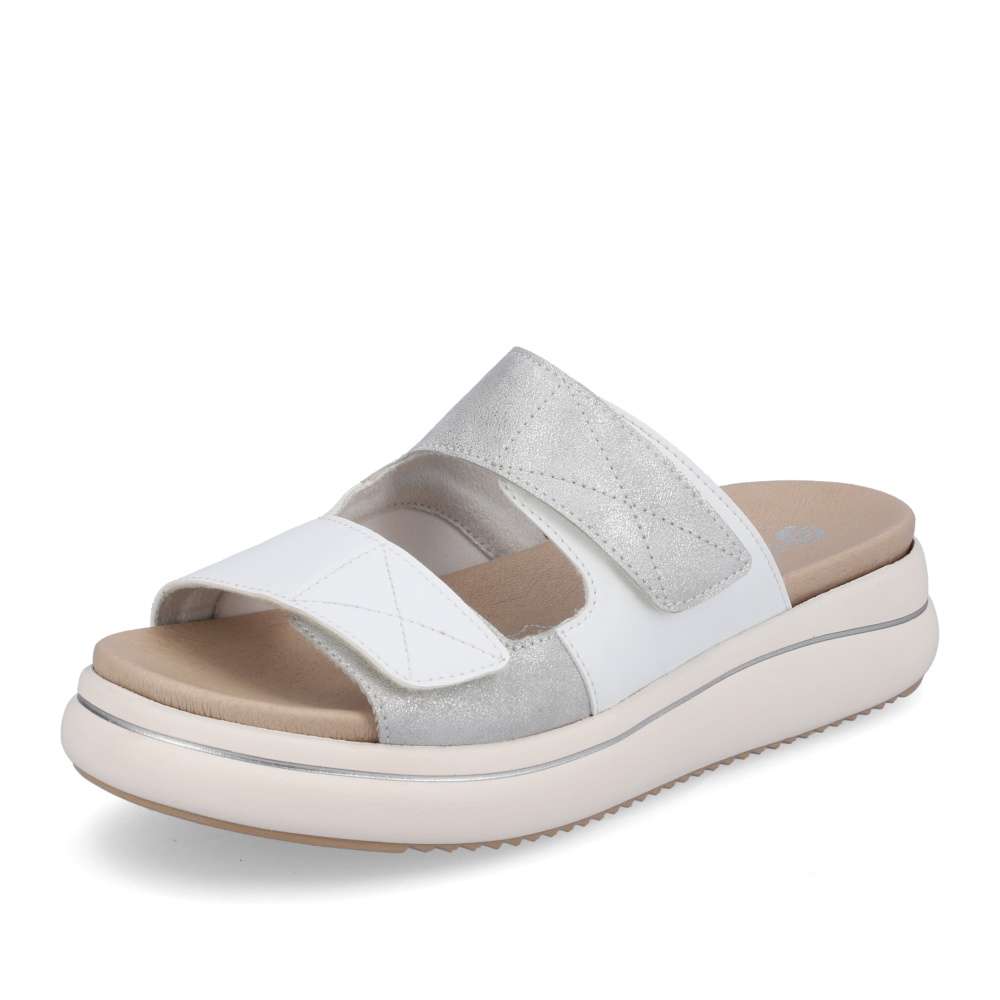 Detailní informace Obuv REMONTE – jedná se o vyšší řadu značky RIEKER, tato obuv se vyznačuje vynikající kombinací svrchních materiálů. Bílý svršek je zdoben částí s metalickými odlesky, což dodá vzhledu originální design. Pantofle jsou na suchý zip, a tak si můžete délku pásků přizpůsobit podle svých představ. S koženou vyjímatelnou stélkou se budete cítit pohodlně na každém vašem kroku a vhodná je i pro širší chodilo. Dopřejte si tento model ještě dnes.