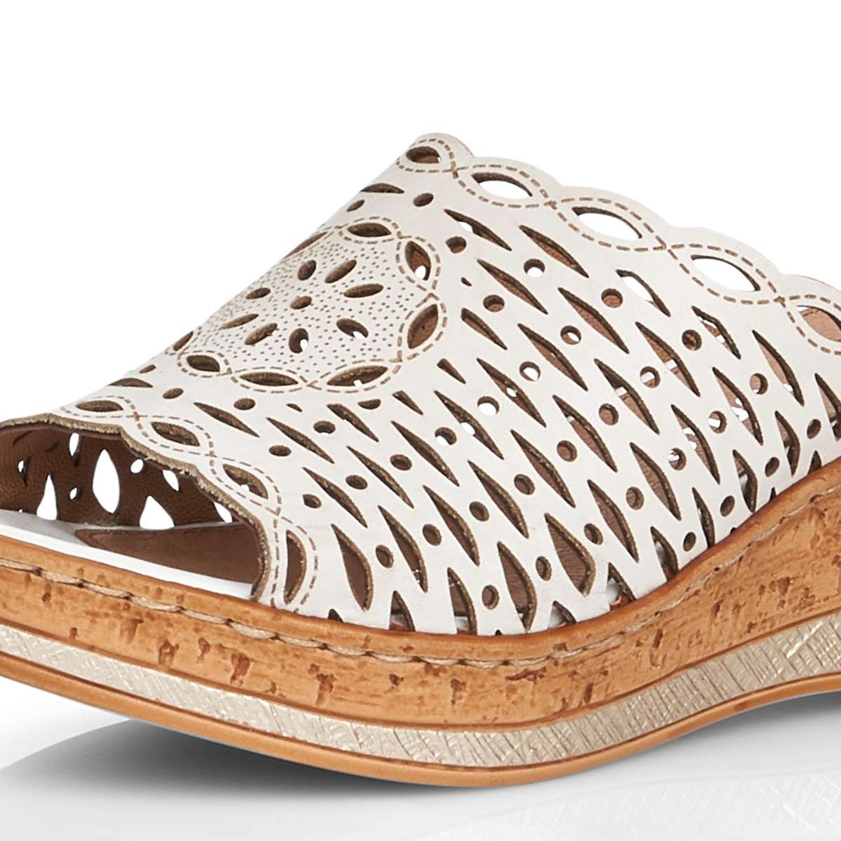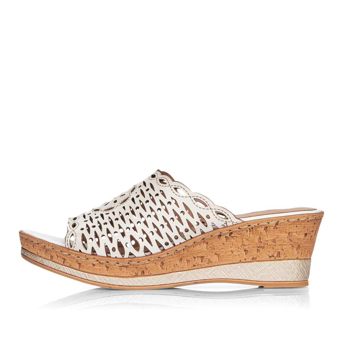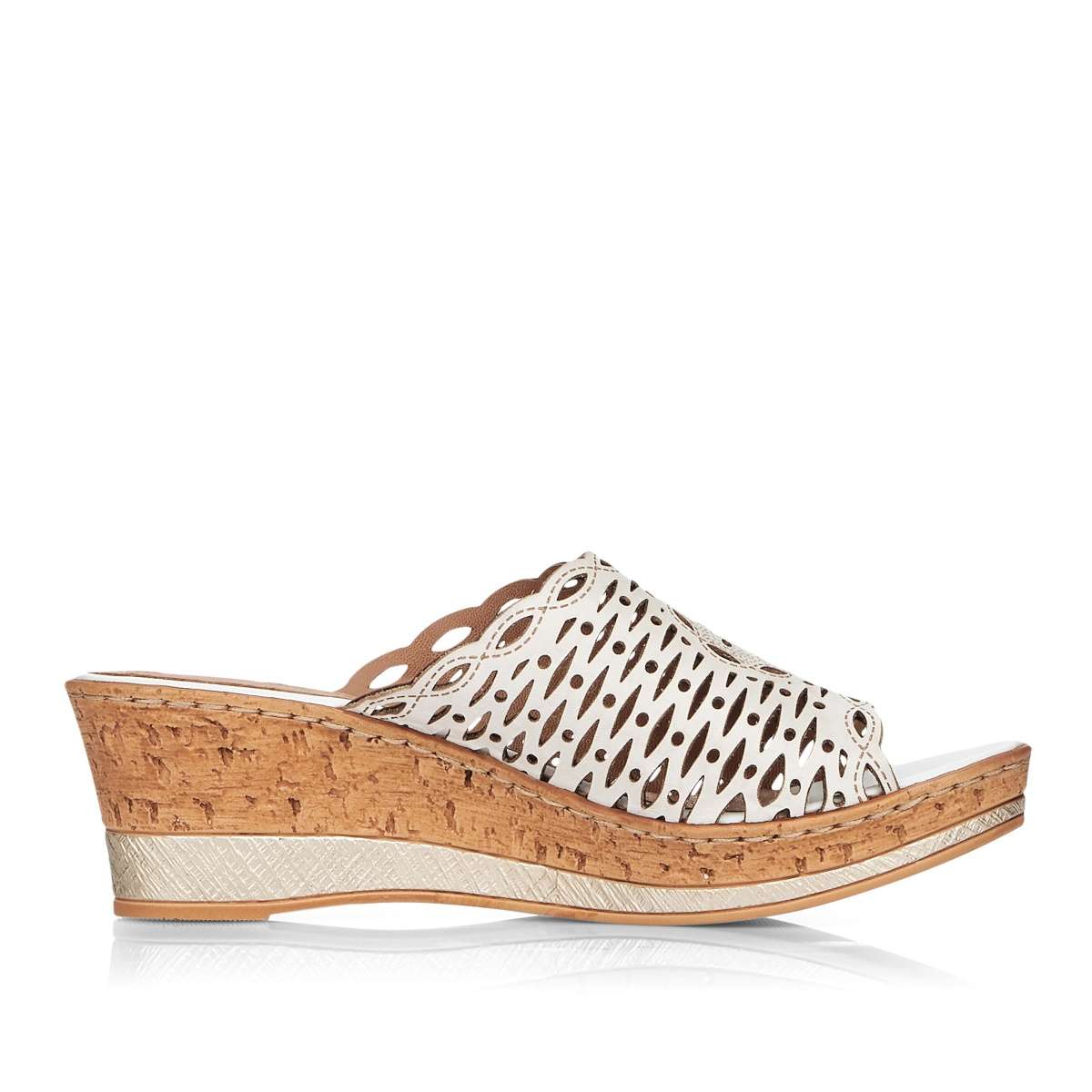Dámské letní nazouváky značky REMONTE (vyšší řada značky Rieker) s ozdobnou perforací a imitací korku v podešvi.
