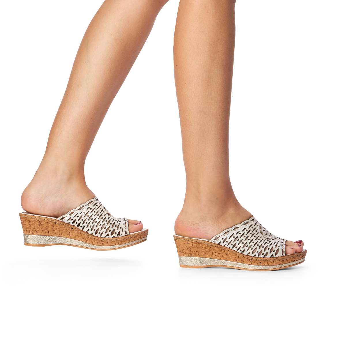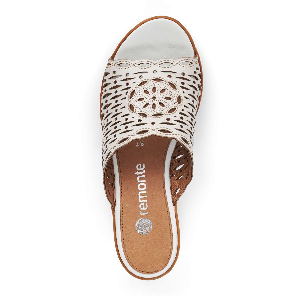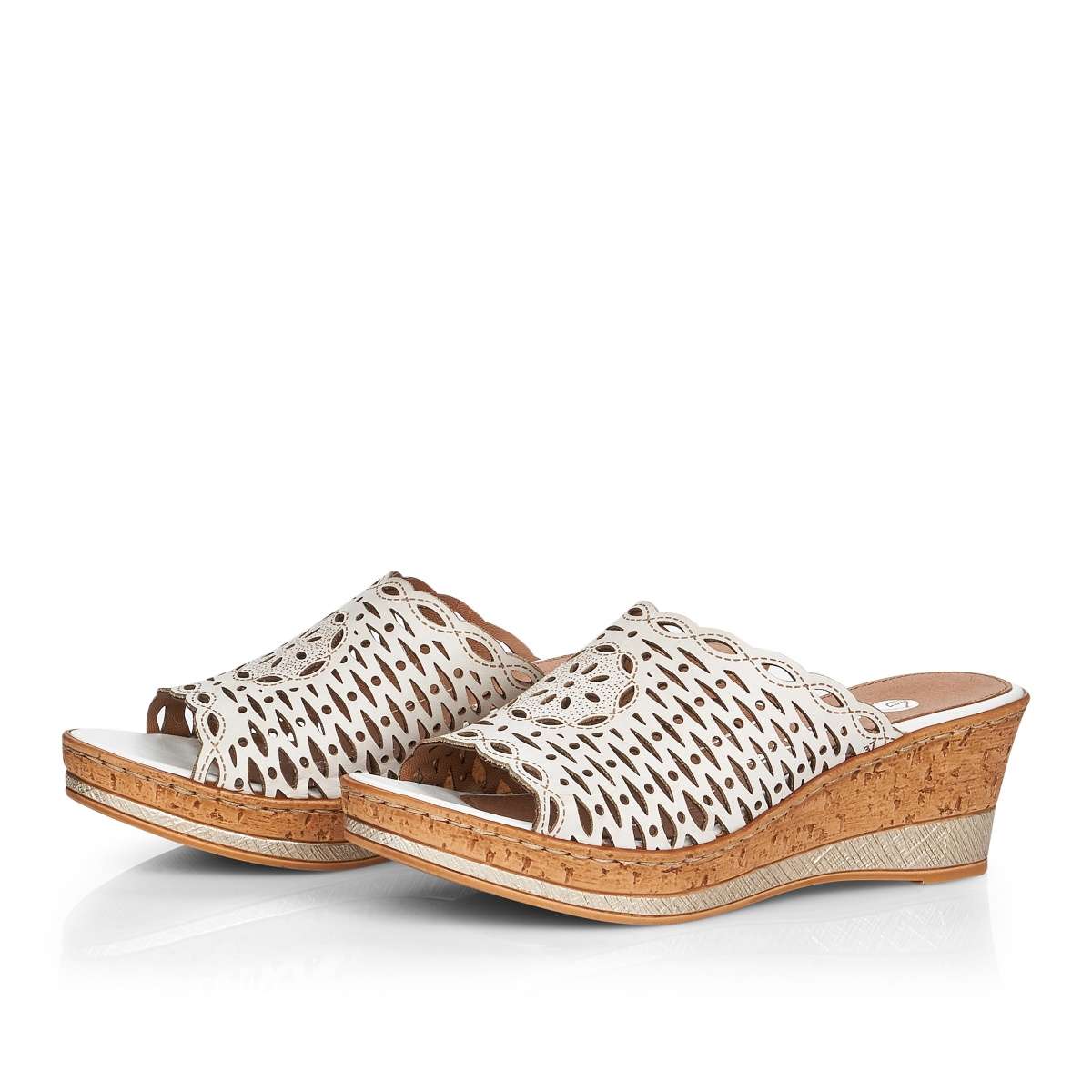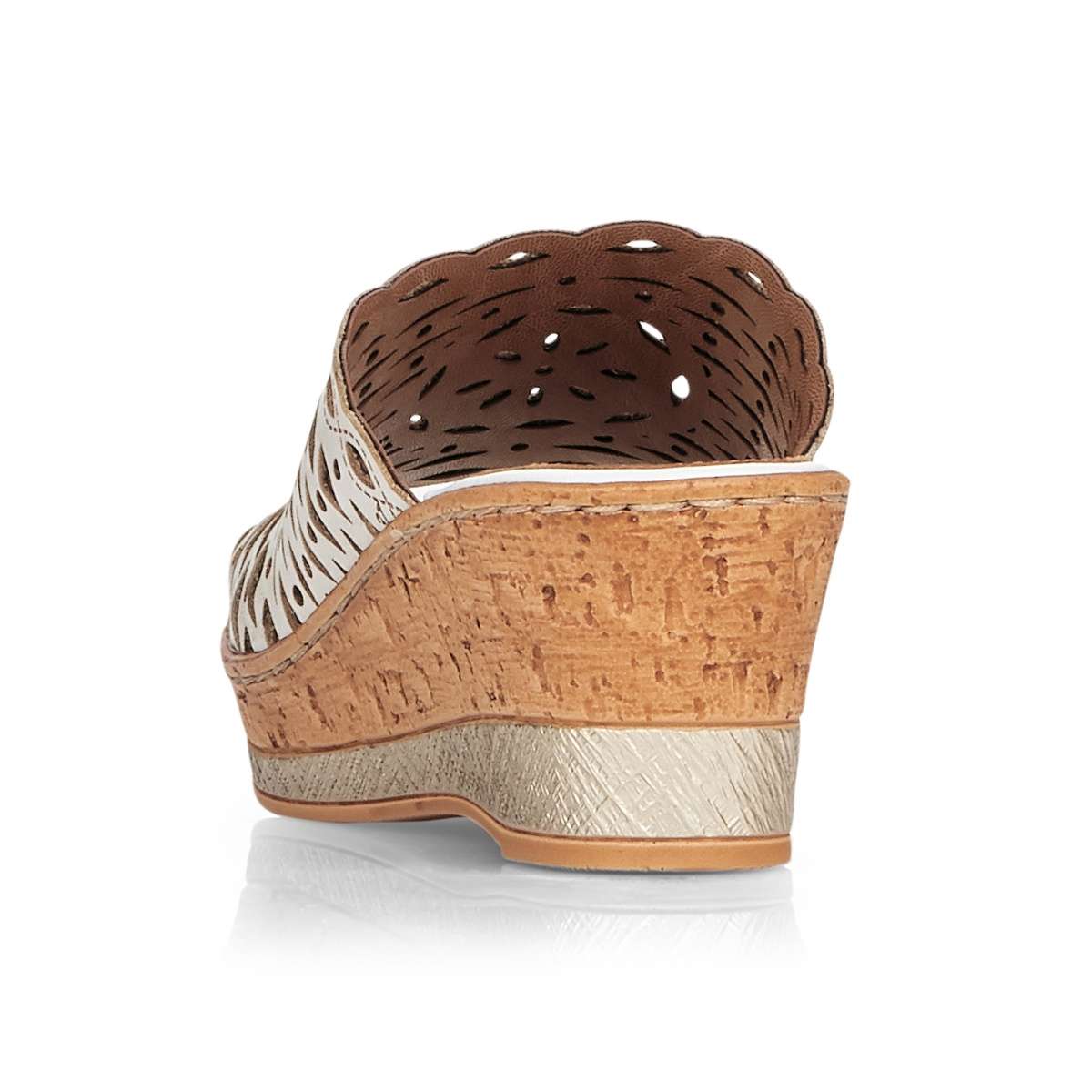 Dámské letní nazouváky značky REMONTE (vyšší řada značky Rieker) s ozdobnou perforací a imitací korku v podešvi.