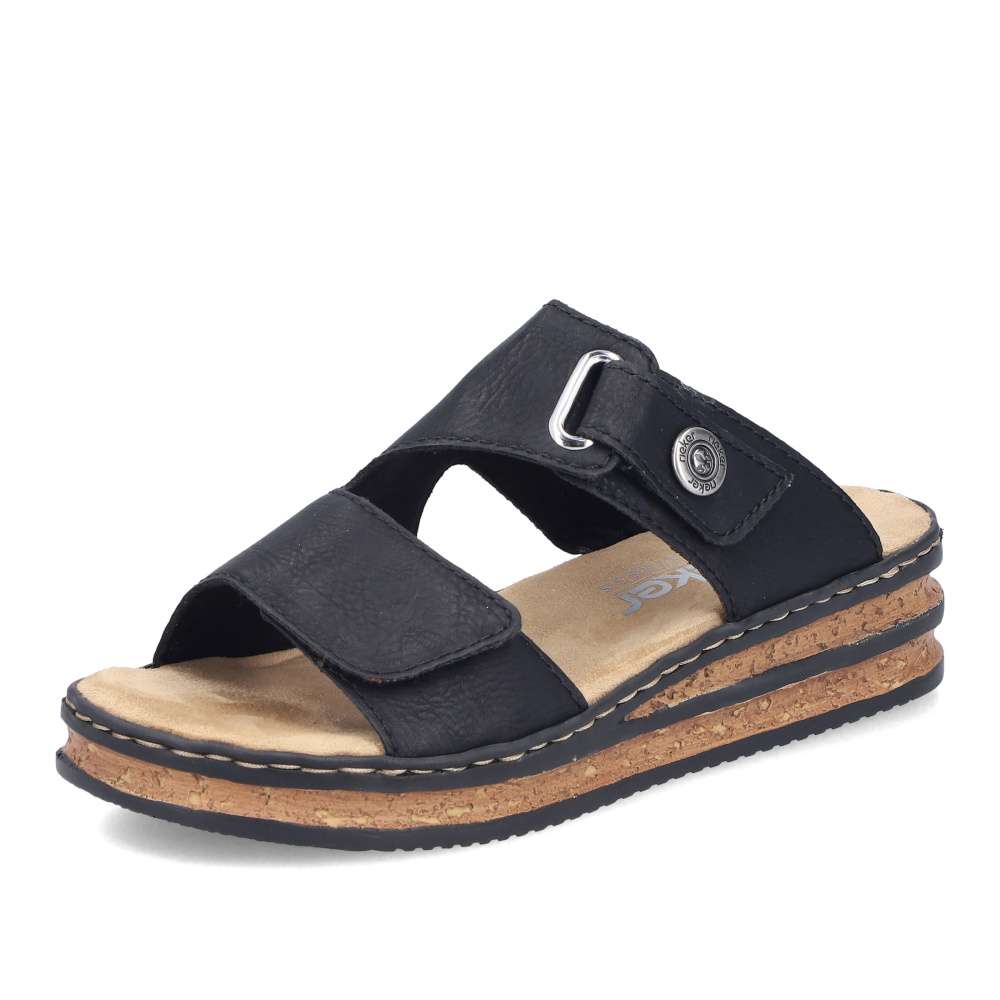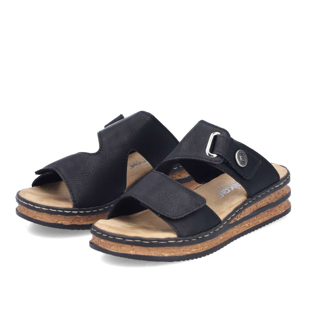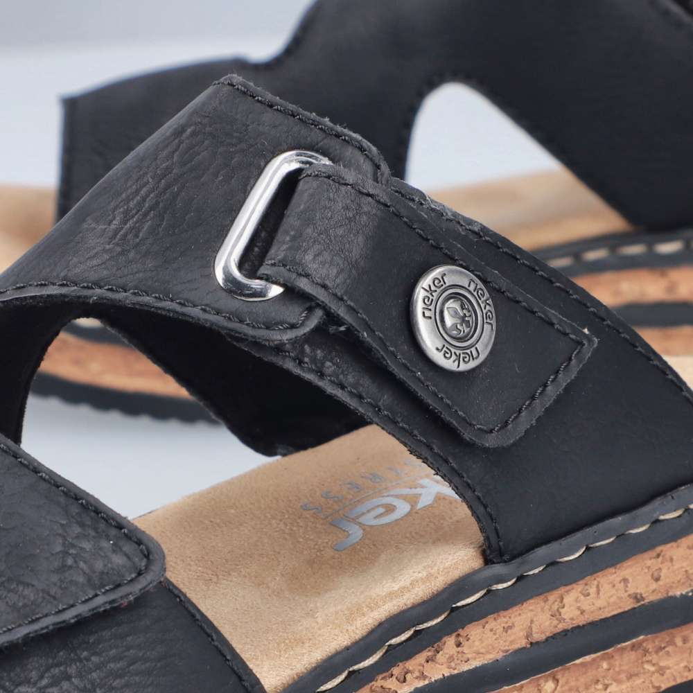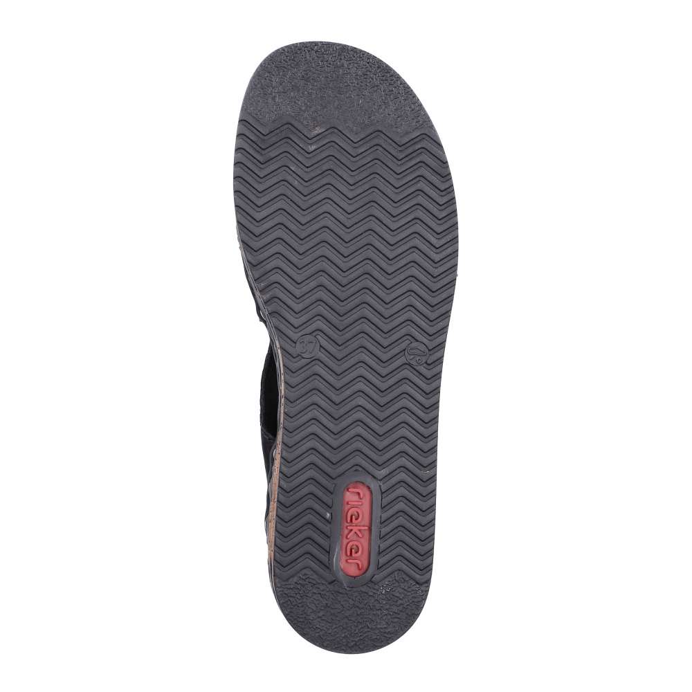 Nazouváky Rieker v působivě nadčasovém stylu jsou ideální volbou pro ženy, které hledají pohodlí a moderní design v jednom. Černý svršek dekorovaný logem značky působí univerzálně a snadno se kombinuje s různými outfity – od letních šatů až po ležérní kalhoty. Oba pásky svršku jsou opatřeny praktickým suchým zipem, díky kterému si nazouváky jednoduše přizpůsobíte podle tvaru chodidla. Příjemná textilní stélka poskytuje měkkost a komfort při každém kroku, zatímco vyšší klínový podpatek v trendy stylu opticky prodlouží postavu a zároveň zajistí stabilitu. Tento model je skvělou volbou pro každodenní nošení i letní příležitosti, kdy chcete vypadat stylově a cítit se pohodlně.