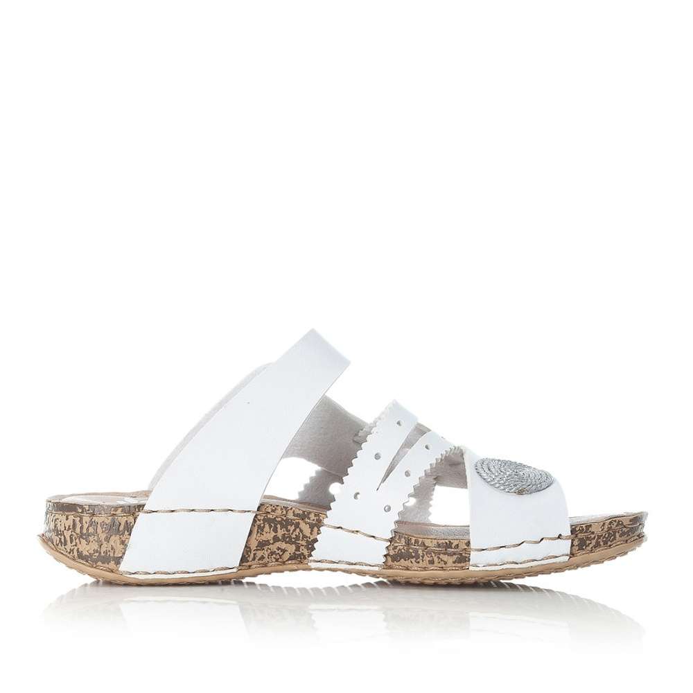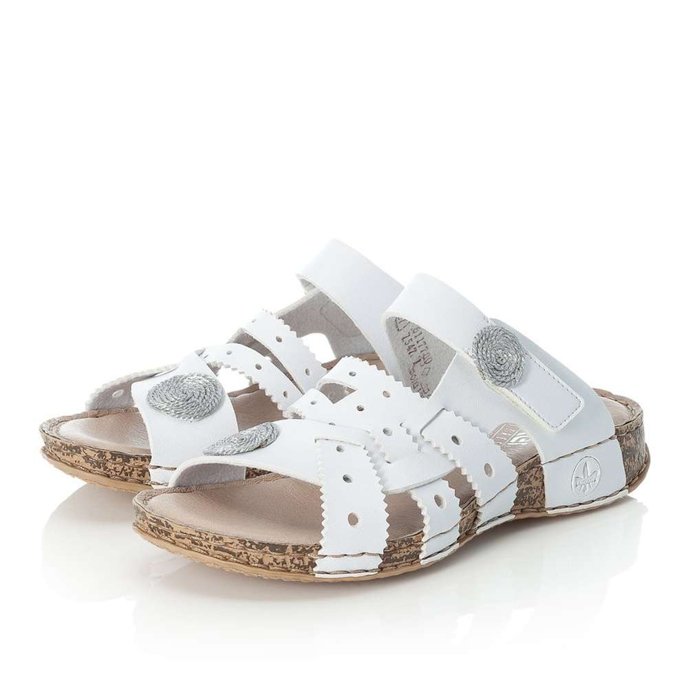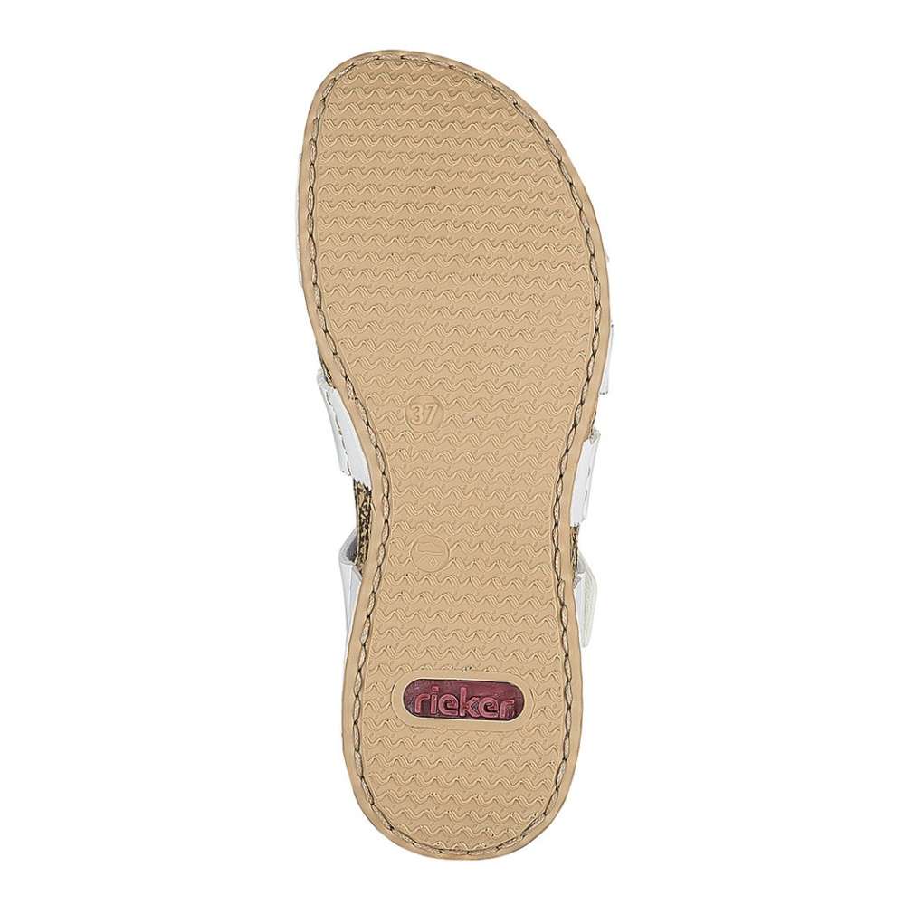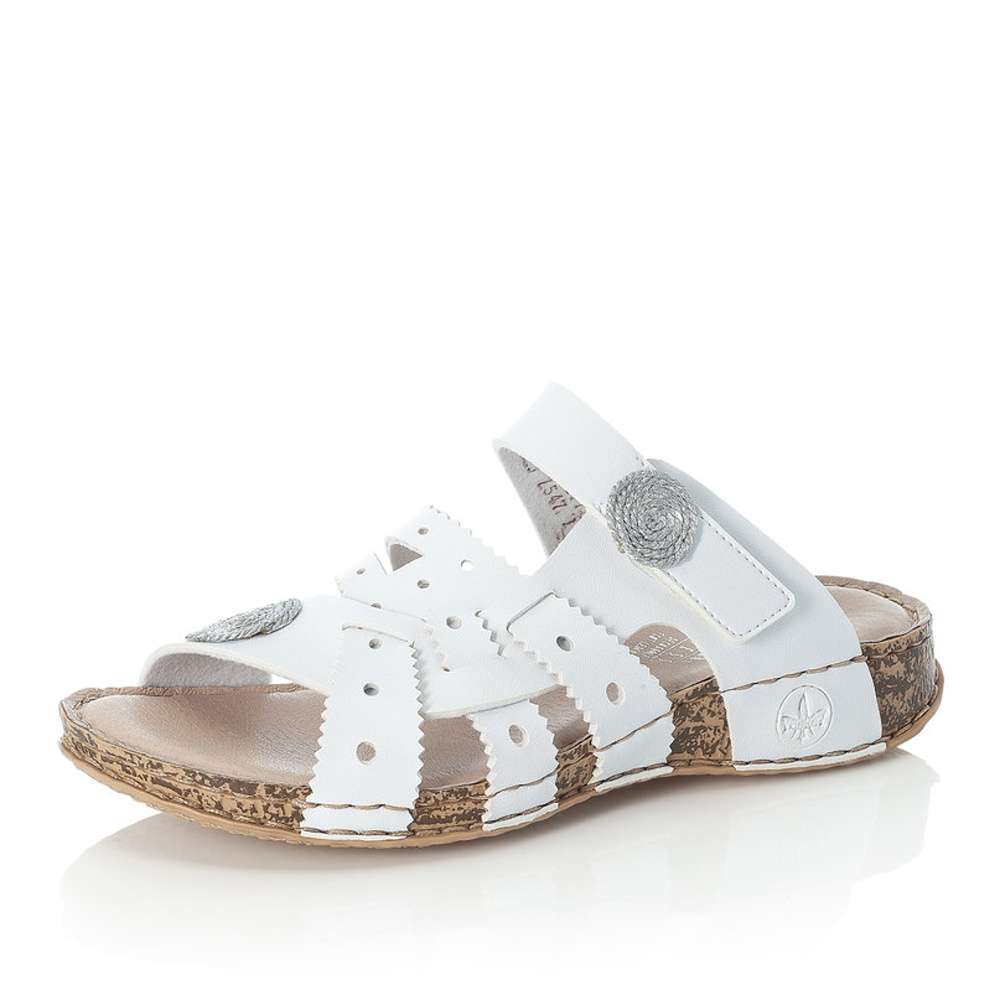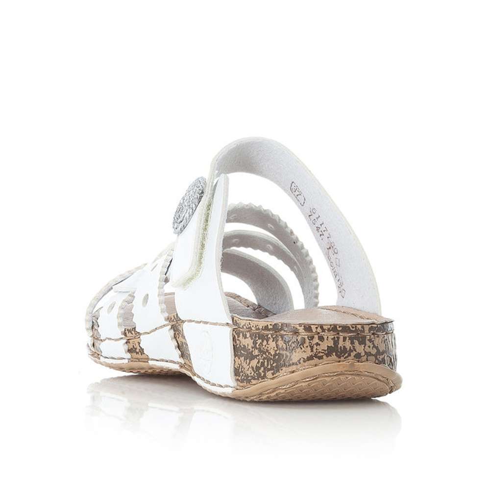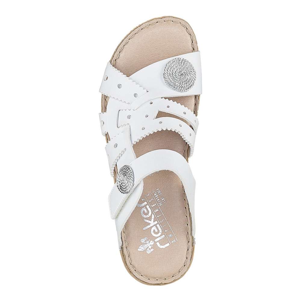 Svršek bílé barvy je složen z designově propletených pásků a ozdoben je perforací a stříbrnými textilními aplikacemi. Nártový pásek si můžete pohodlně nastavit díky zapínání na suchý zip.