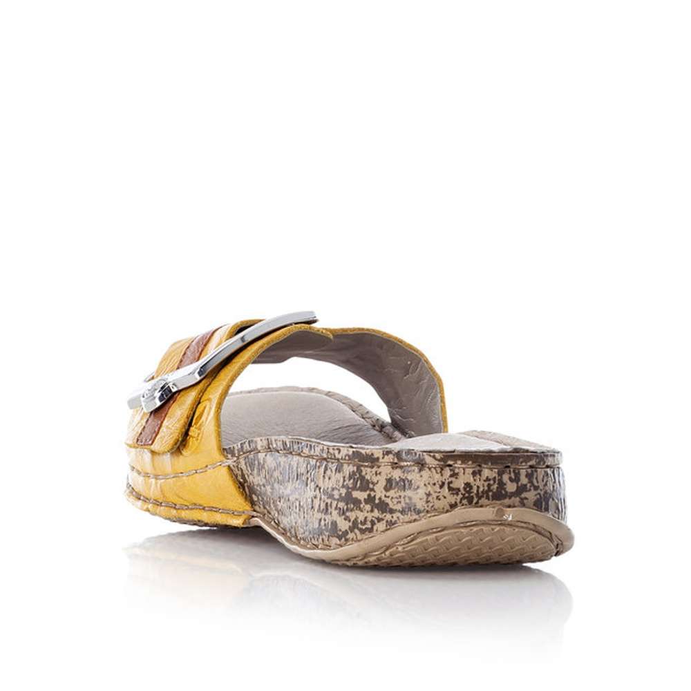 Širší pásek je vyrobený z pravé hladké kůže a je decentně ozdoben hnědým tenkým proužkem. Velká stříbrná spona slouží k nastavení obuvi přímo dle Vašich požadavků.