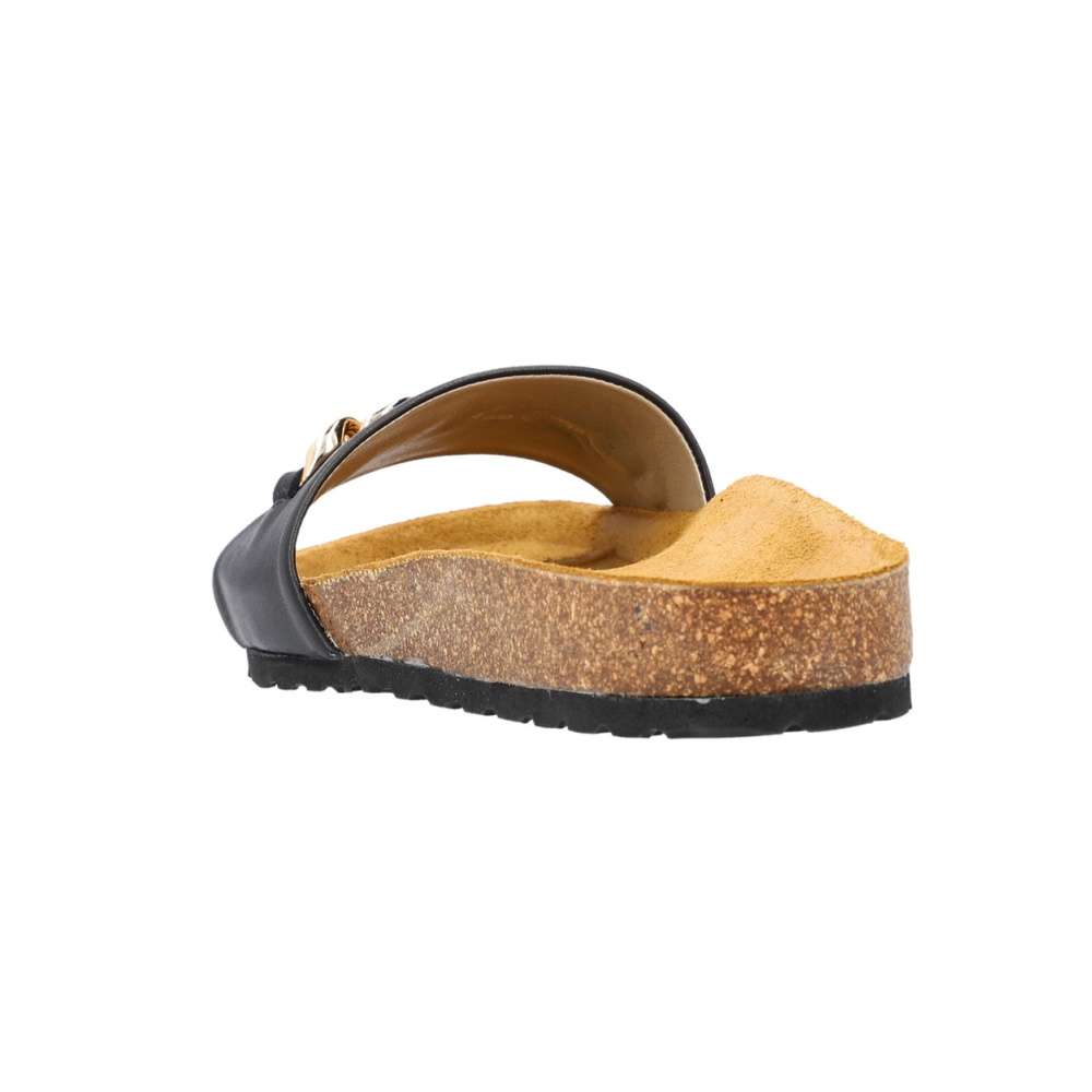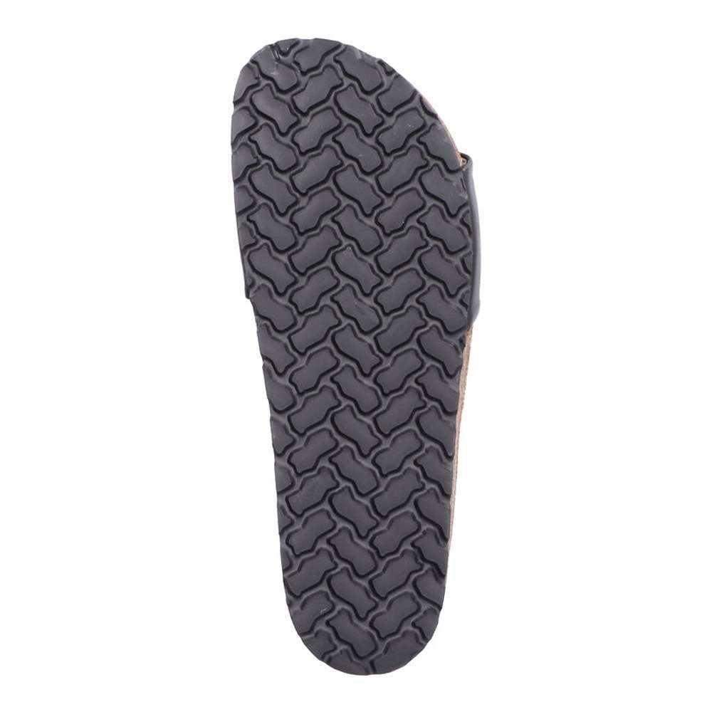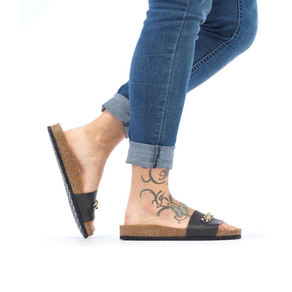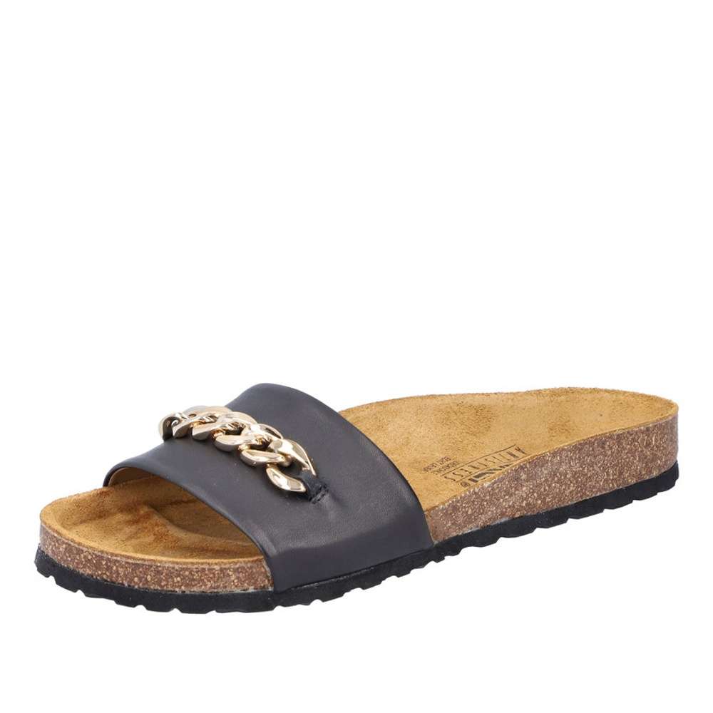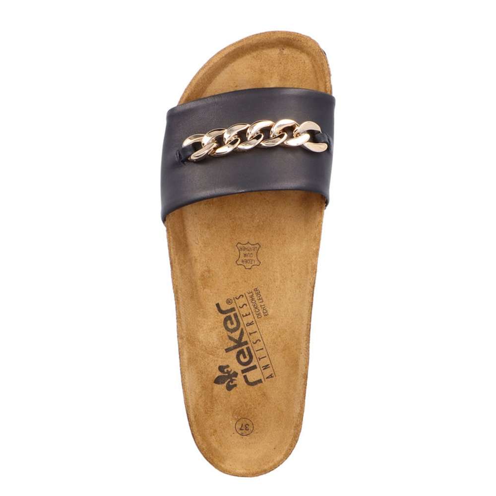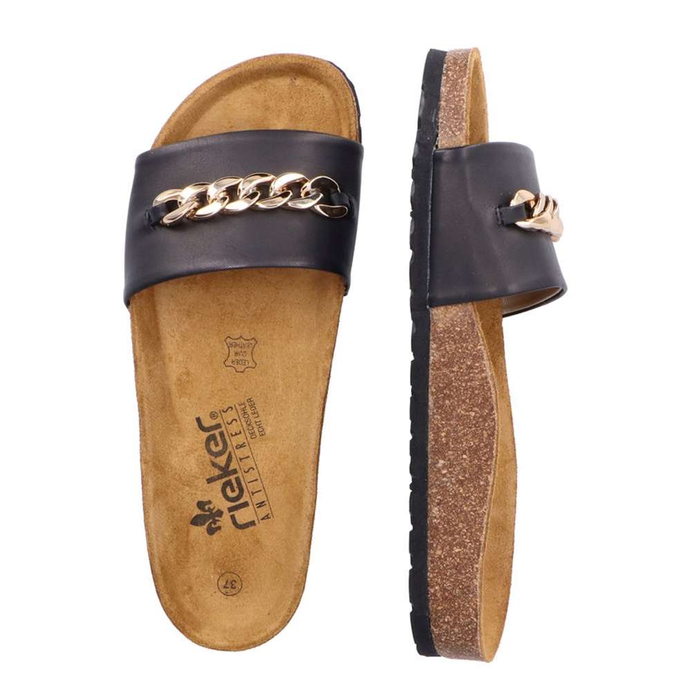 Dámské kožené nazouváky značky RIEKER budou tou správnou volbou. Širší hladký pásek černé barvy je vyroben z pravé kůže a ozdoben je velkou zlatavou aplikací. Tvarovaná kožená stélka Vám zajistí pocit pohodlí po celý den. Tyto nazouváky si pohodlně můžete vzít jak do práce, tak i třeba na večerní procházku po pobřeží. Technologie: Antistress – podešev je díky této technologii lehká, flexibilní, absorbuje nárazy při došlapu a snadno se přizpůsobí každé noze.
