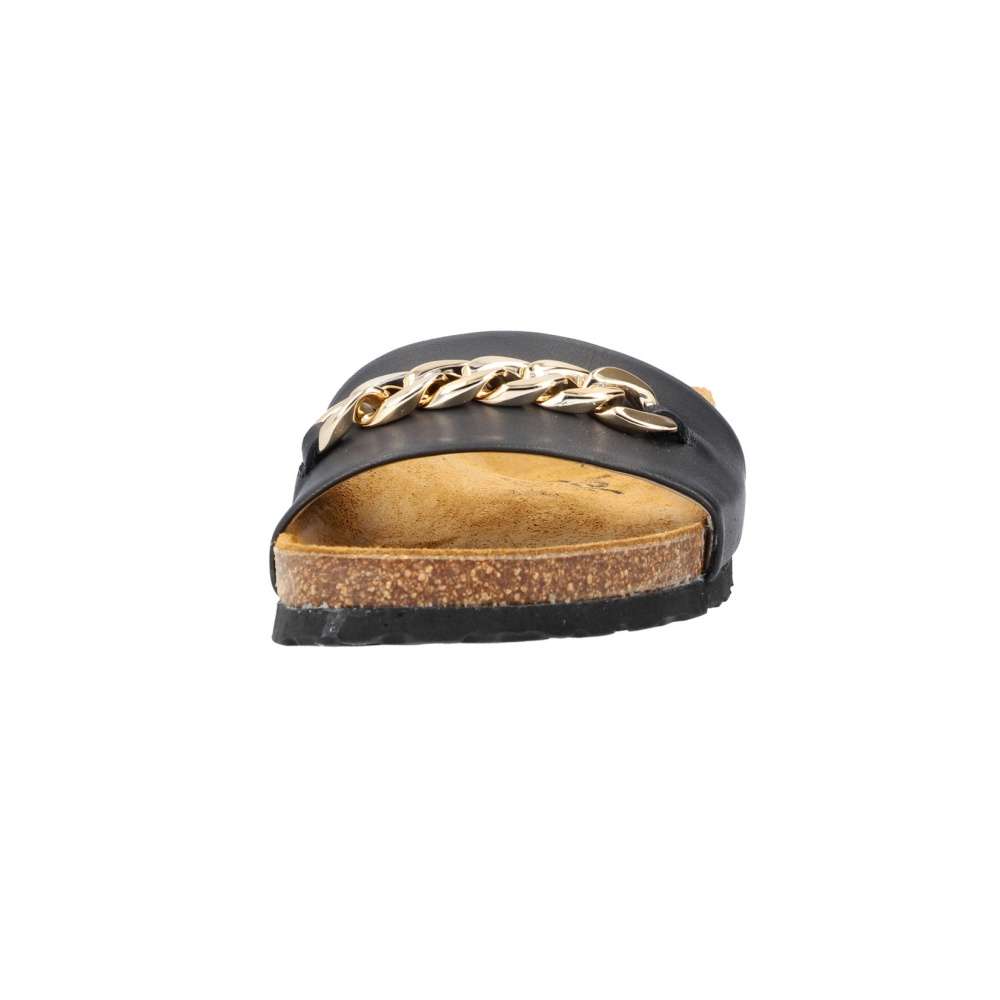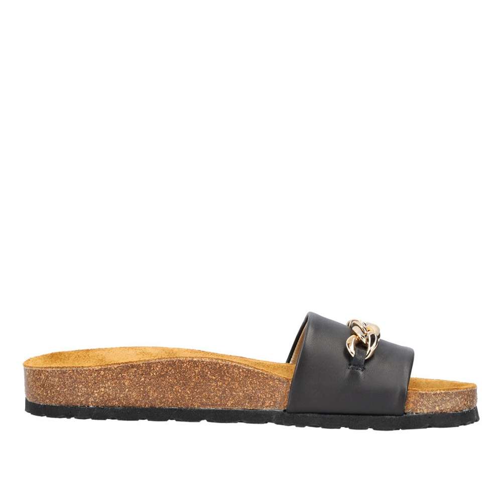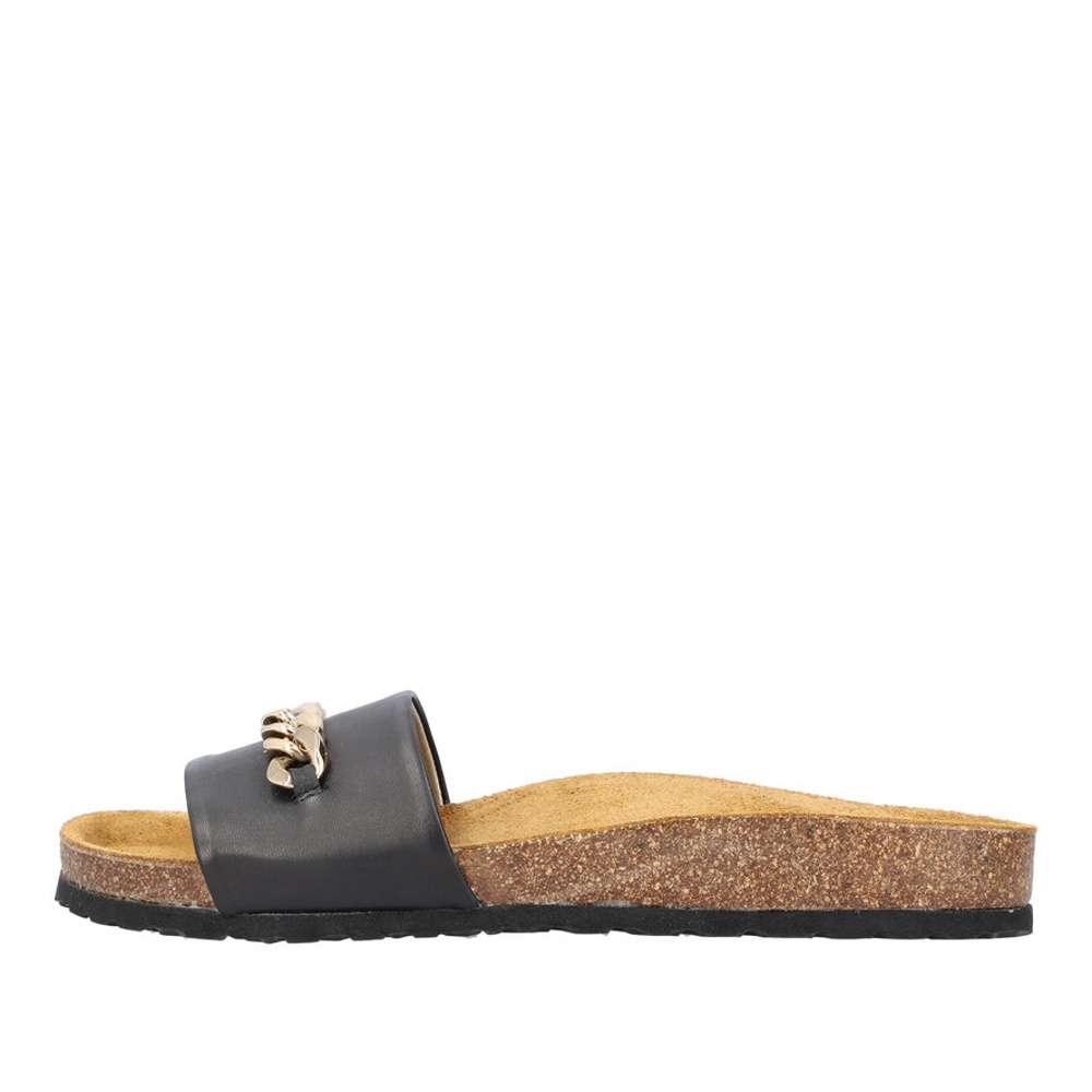 Detailní informace Dámské kožené nazouváky značky RIEKER budou tou správnou volbou. Širší hladký pásek černé barvy je vyroben z pravé kůže a ozdoben je velkou zlatavou aplikací. Tvarovaná kožená stélka Vám zajistí pocit pohodlí po celý den. Tyto nazouváky si pohodlně můžete vzít jak do práce, tak i třeba na večerní procházku po pobřeží.