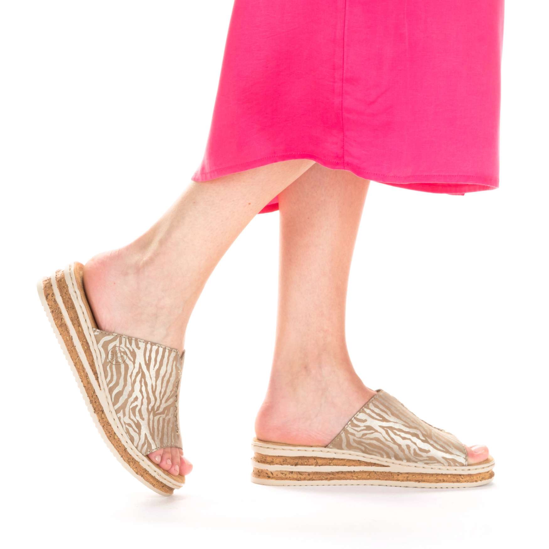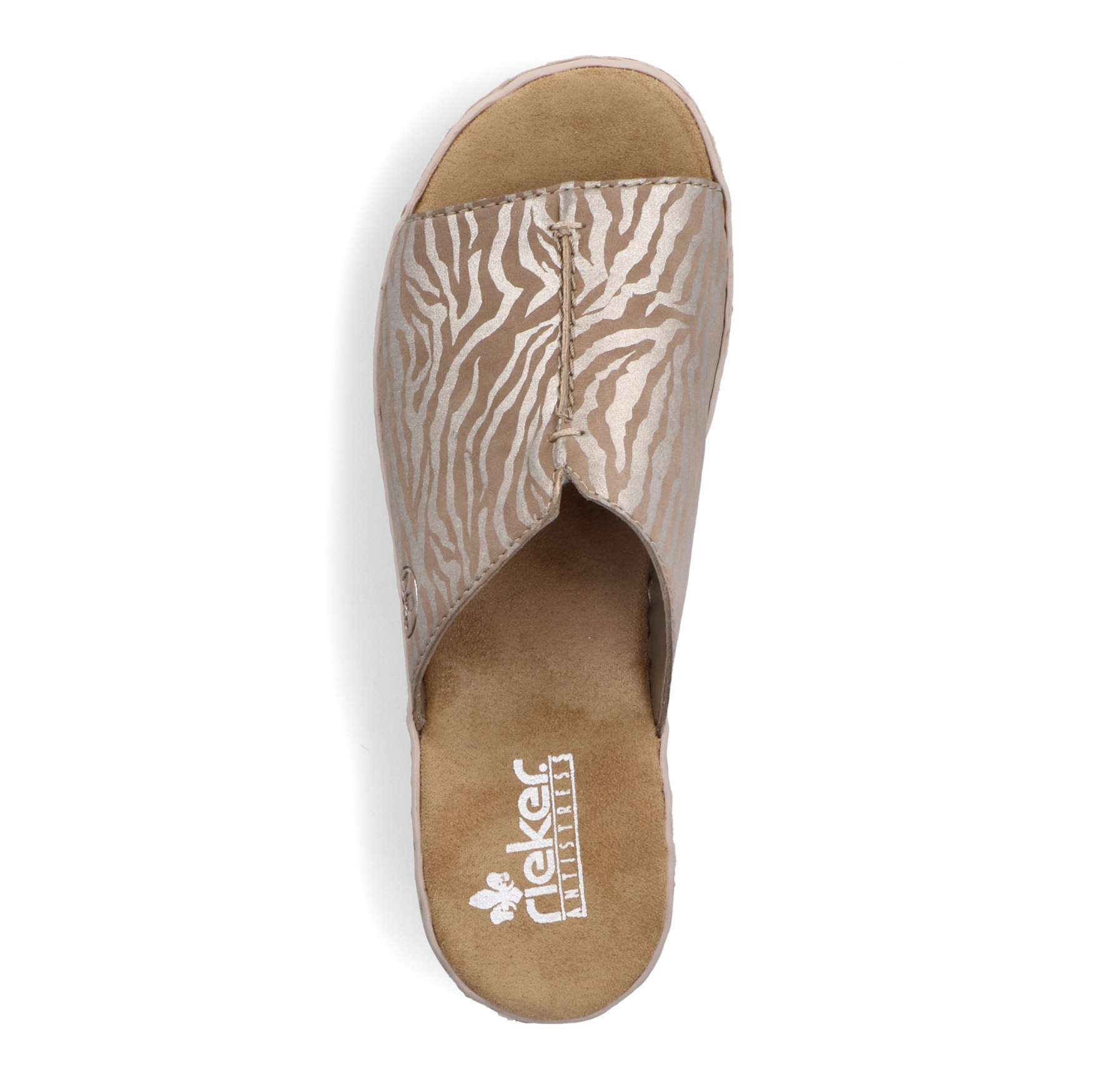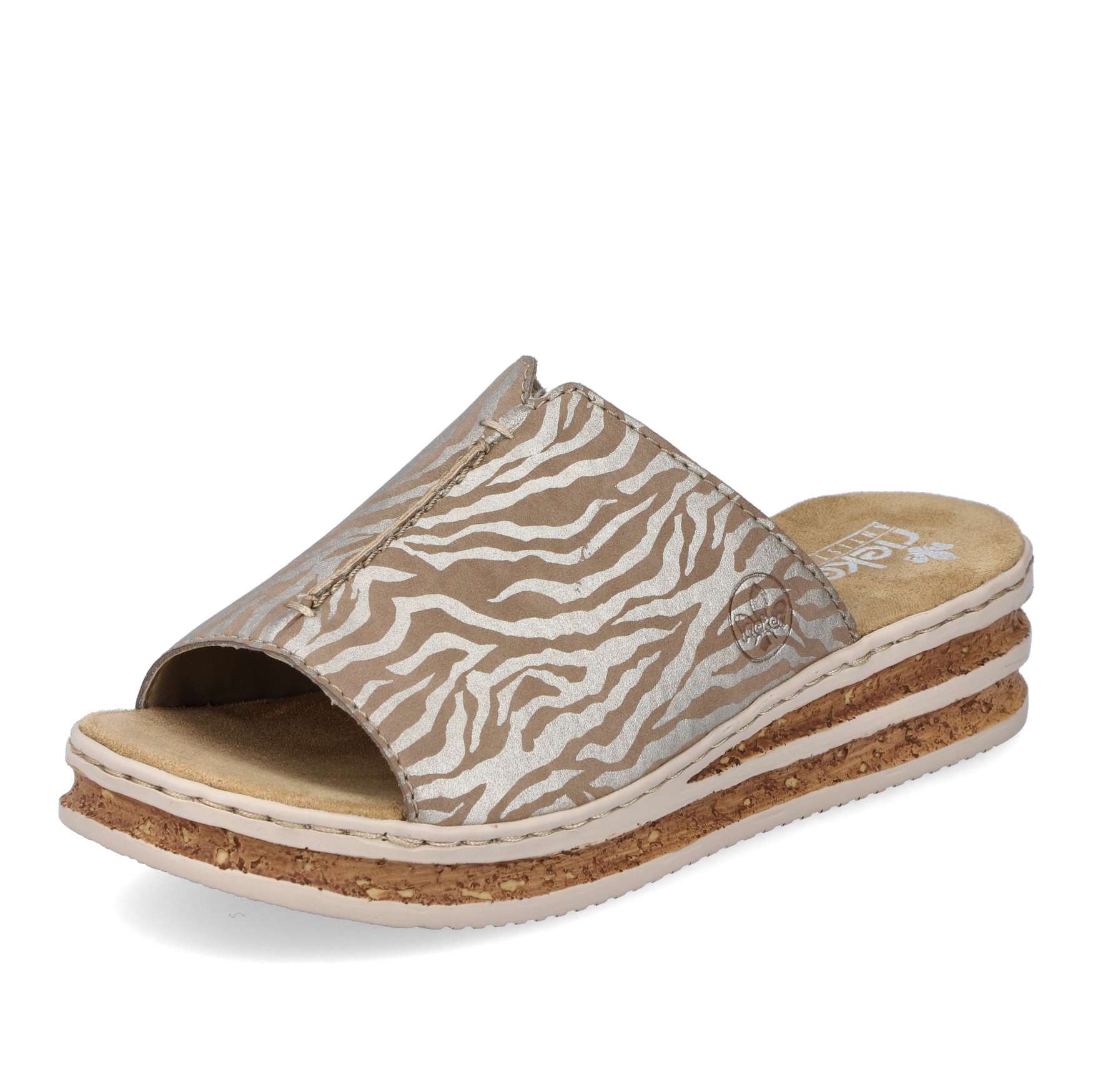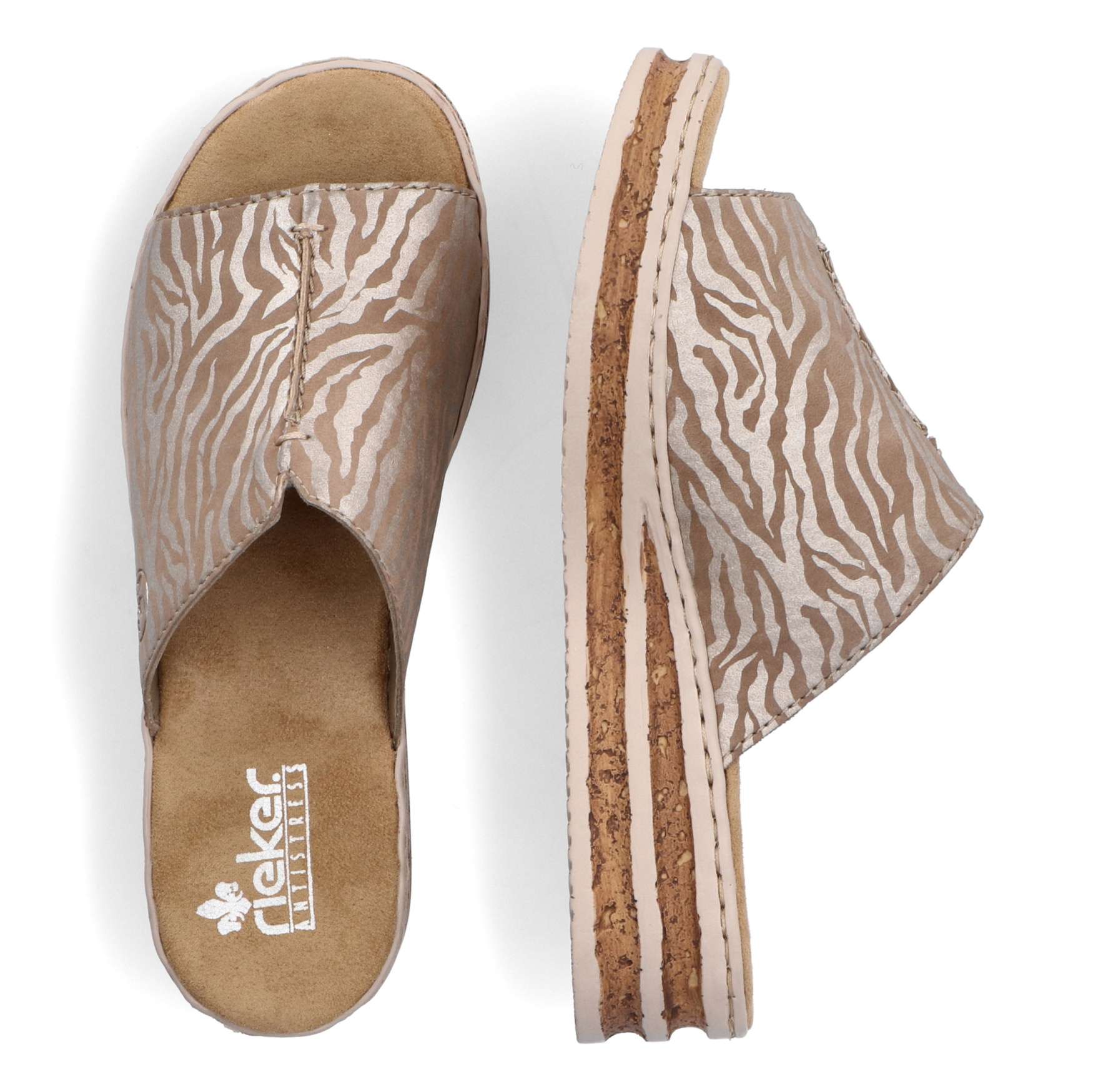 Jednoduchost je heslo, kterým se řídili designéři při vytváření tohoto modelu nazouváků značky RIEKER. Široký nártový pásek je ozdoben výrazným šitím, vykrojením a vytlačeným logem značky. Měkká stélka je vyrobena z příjemného materiálu, který Vám zajistí pohodlí na každém kroku. Podešev ve spojení korku a černých pruhů doladí vzhled sandálů k dokonalosti. Tyto nazouváky budou skvěle vypadat s dlouhými sukněmi či šaty. Technologie: Antistress – podešev je díky této technologii lehká, flexibilní, absorbuje nárazy při došlapu a snadno se přizpůsobí každé noze.