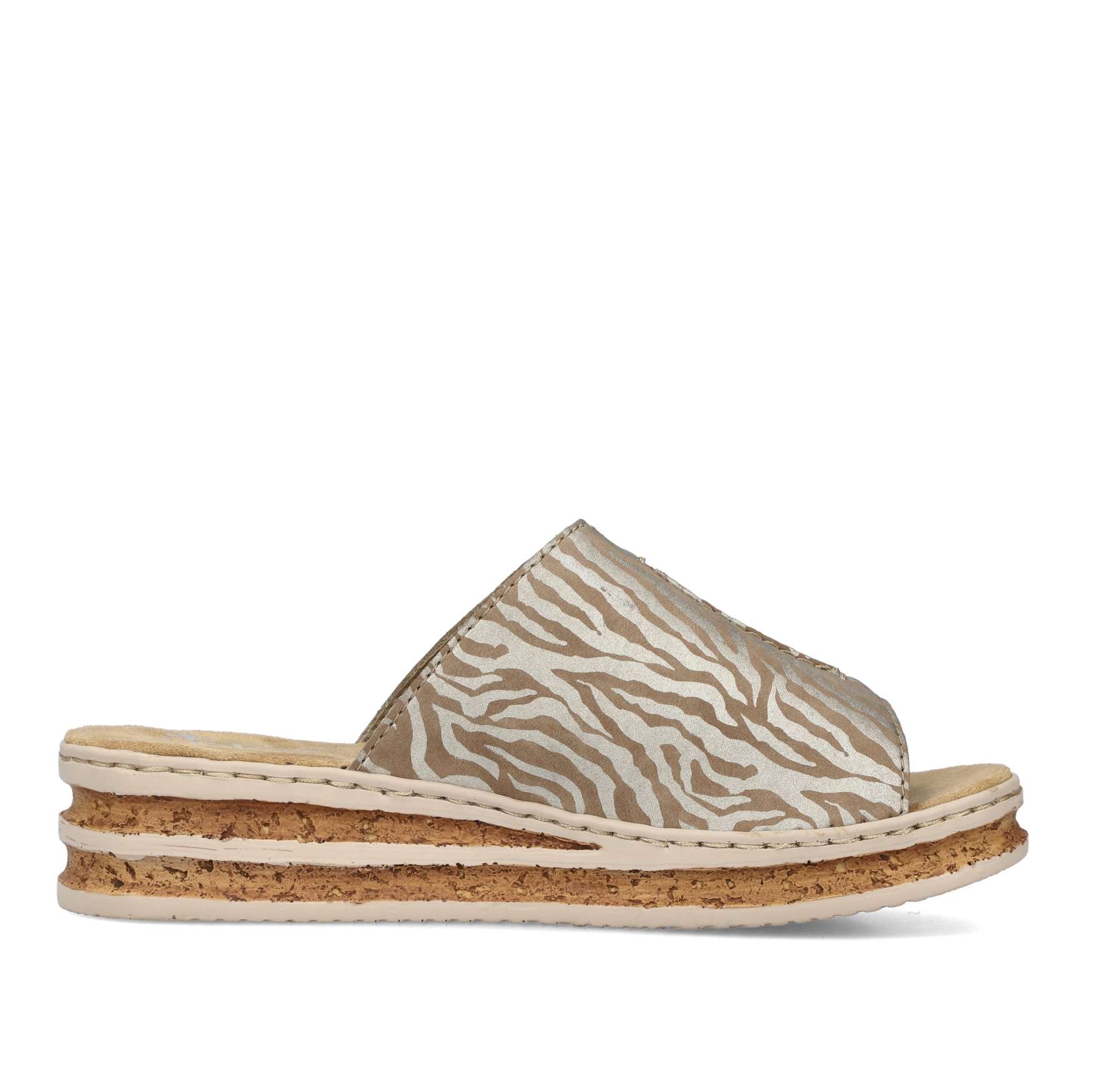 Detailní informace Jednoduchost je heslo, kterým se řídili designéři při vytváření tohoto modelu nazouváků značky RIEKER. Široký nártový pásek je ozdoben výrazným šitím, vykrojením a vytlačeným logem značky. Měkká stélka je vyrobena z příjemného materiálu, který Vám zajistí pohodlí na každém kroku. Podešev ve spojení korku a černých pruhů doladí vzhled sandálů k dokonalosti. Tyto nazouváky budou skvěle vypadat s dlouhými sukněmi či šaty.