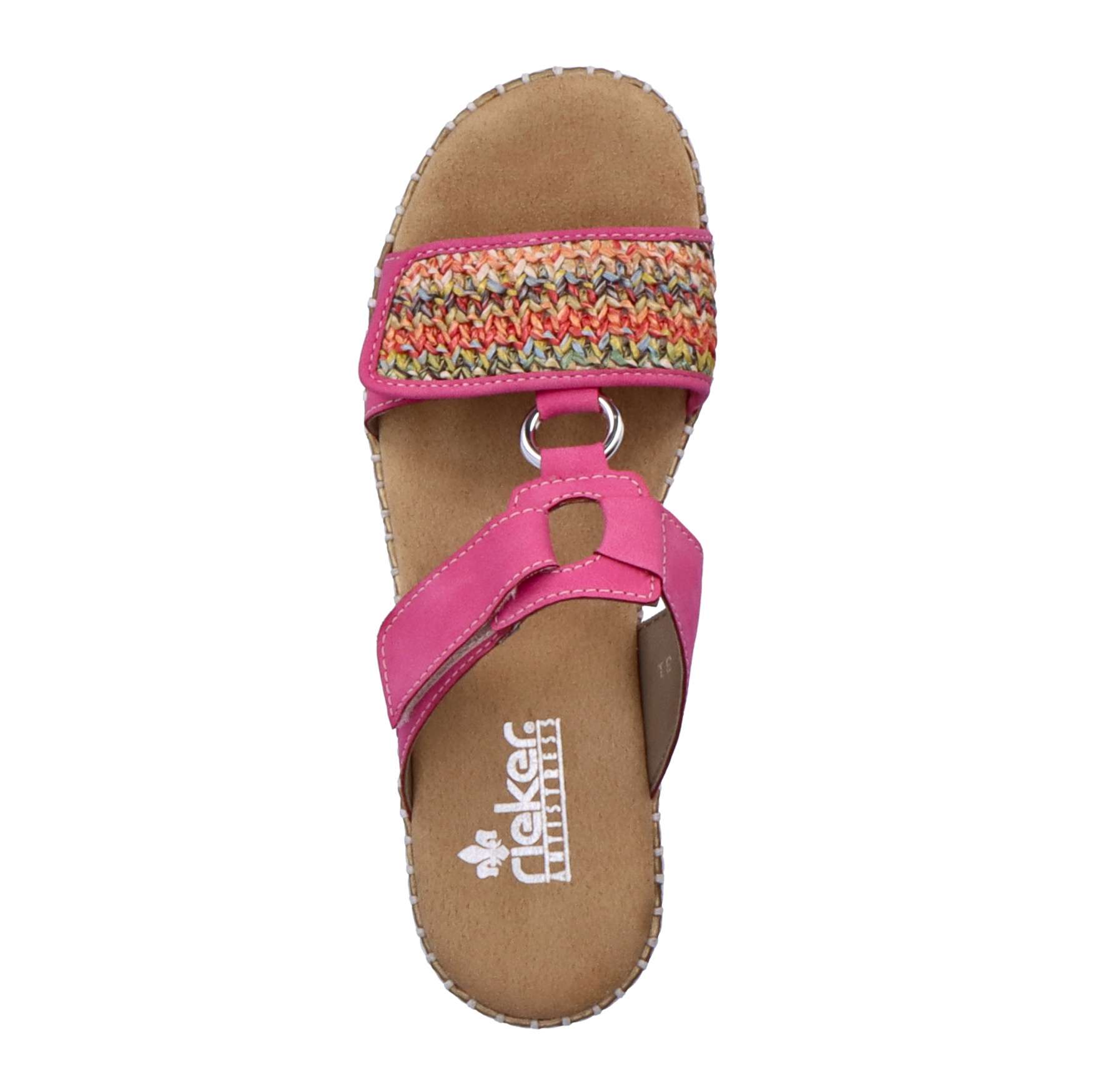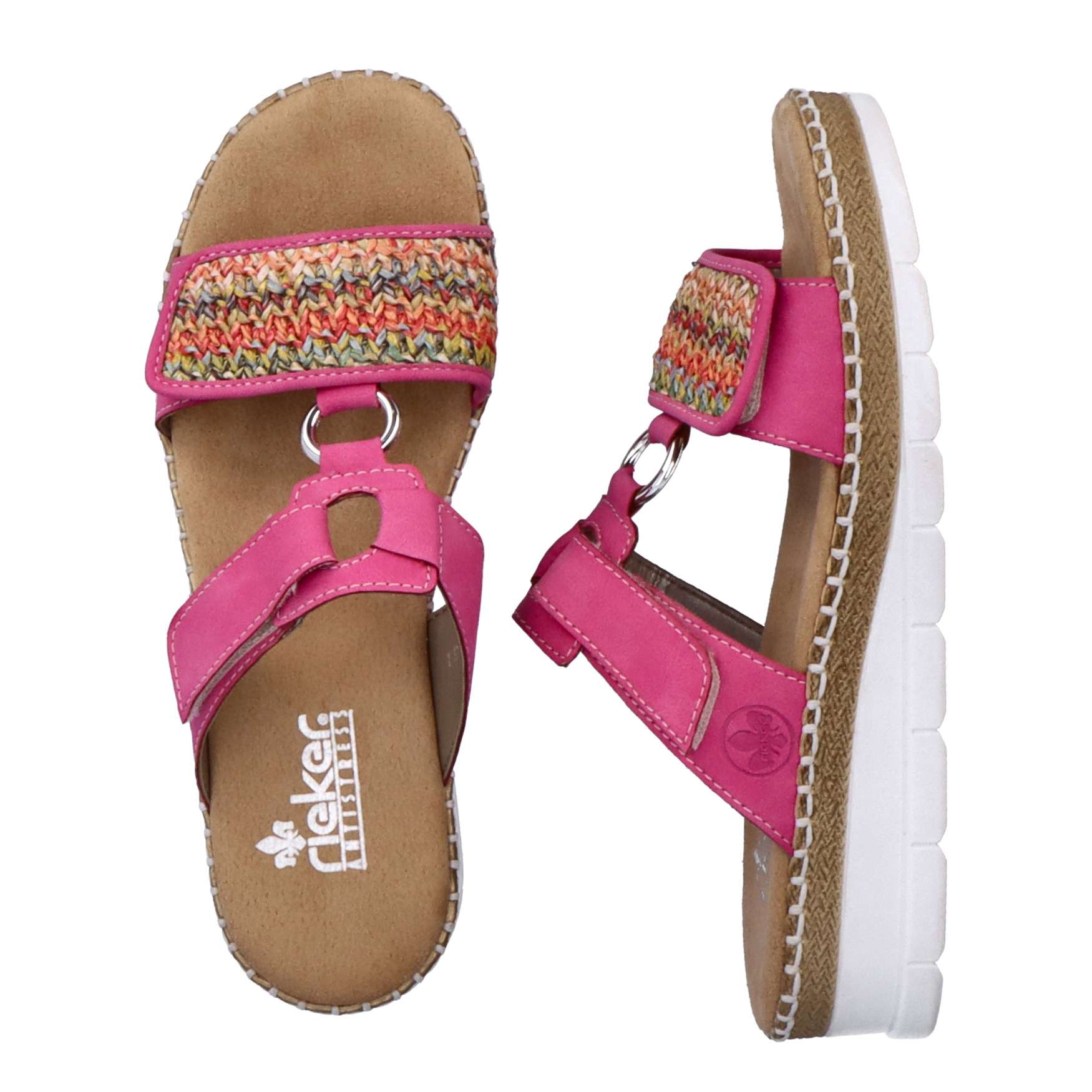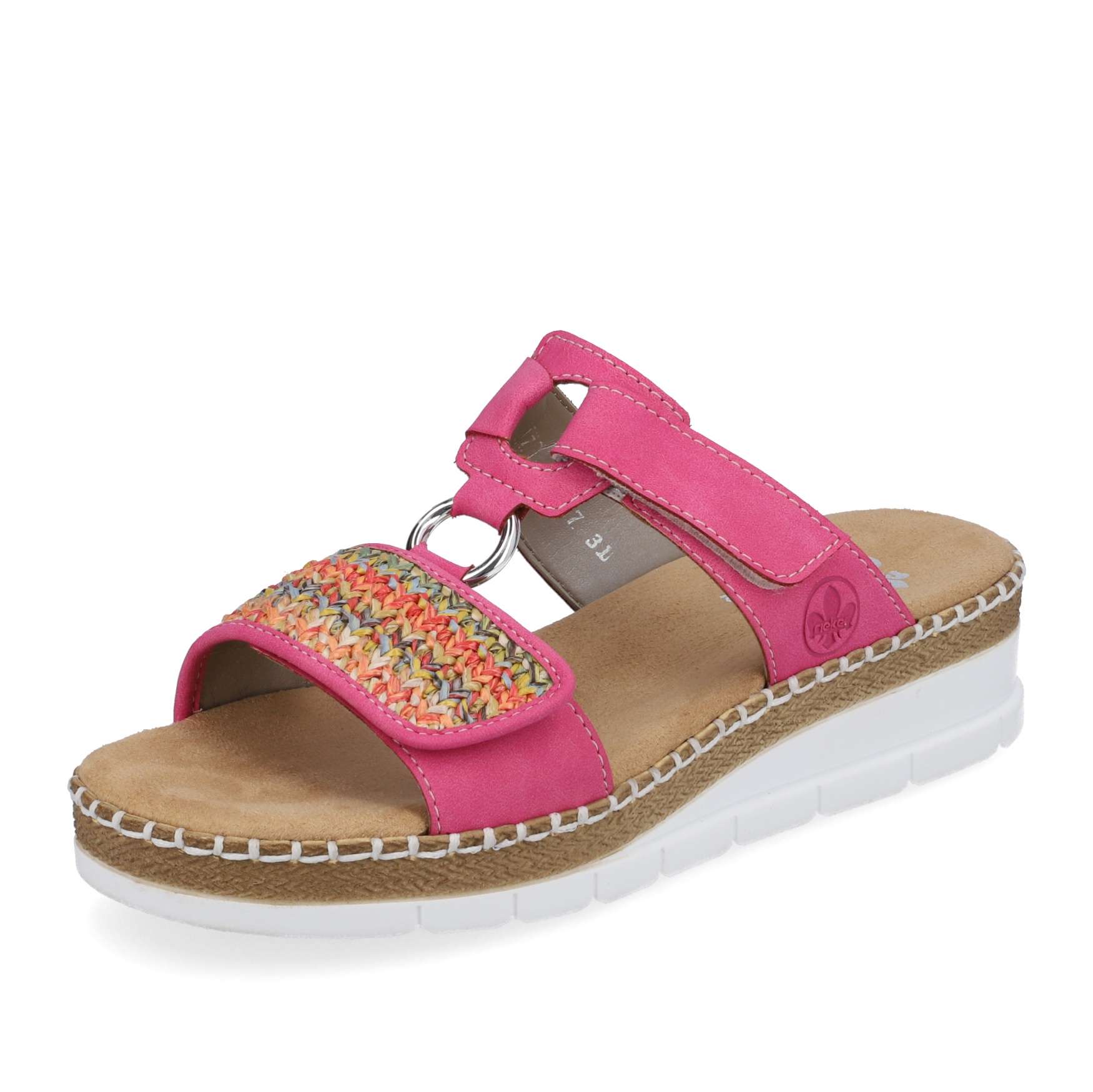 Nepřehlédnutelný model pantoflí značky RIEKER bude vynikat na Vašich opálených nohou. Svršek má přední pásek zdobený pleteným vzorem, stříbrná aplikace spojuje přední a zadní část, kterou lze díky zapínání na suchý zip nastavit podle potřeb. Měkká stélka je vyrobena z příjemného materiálu a podešev svojí kontrastní barvou a prošitím, které je pro tuto značku typické, doladí celkový vzhled obuvi. Je jen na Vás, jestli se v nich vydáte na procházku městem nebo do práce, vždy budou skvělým doplňkem.