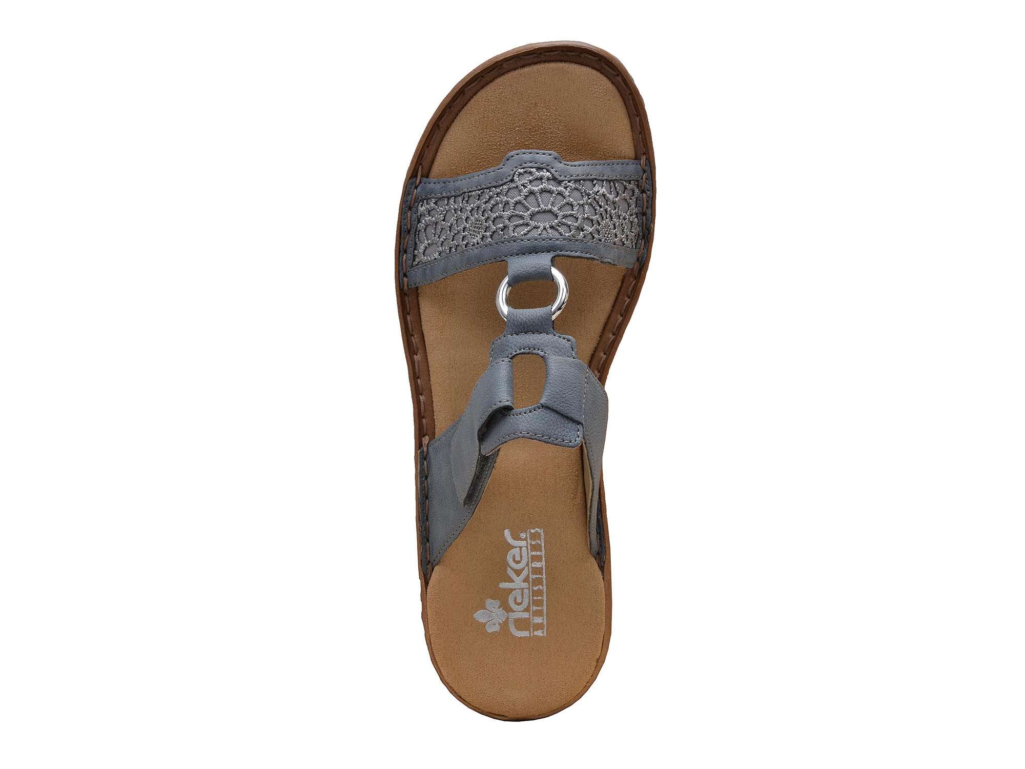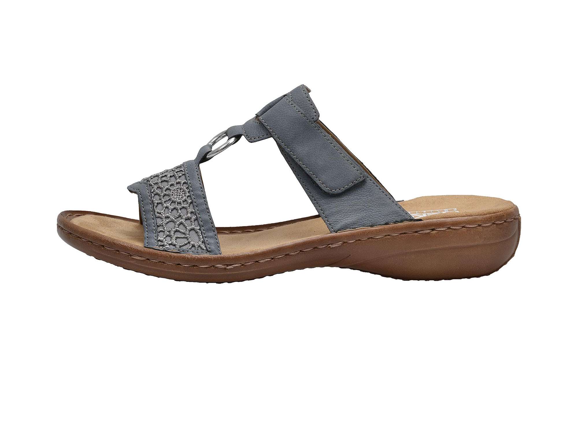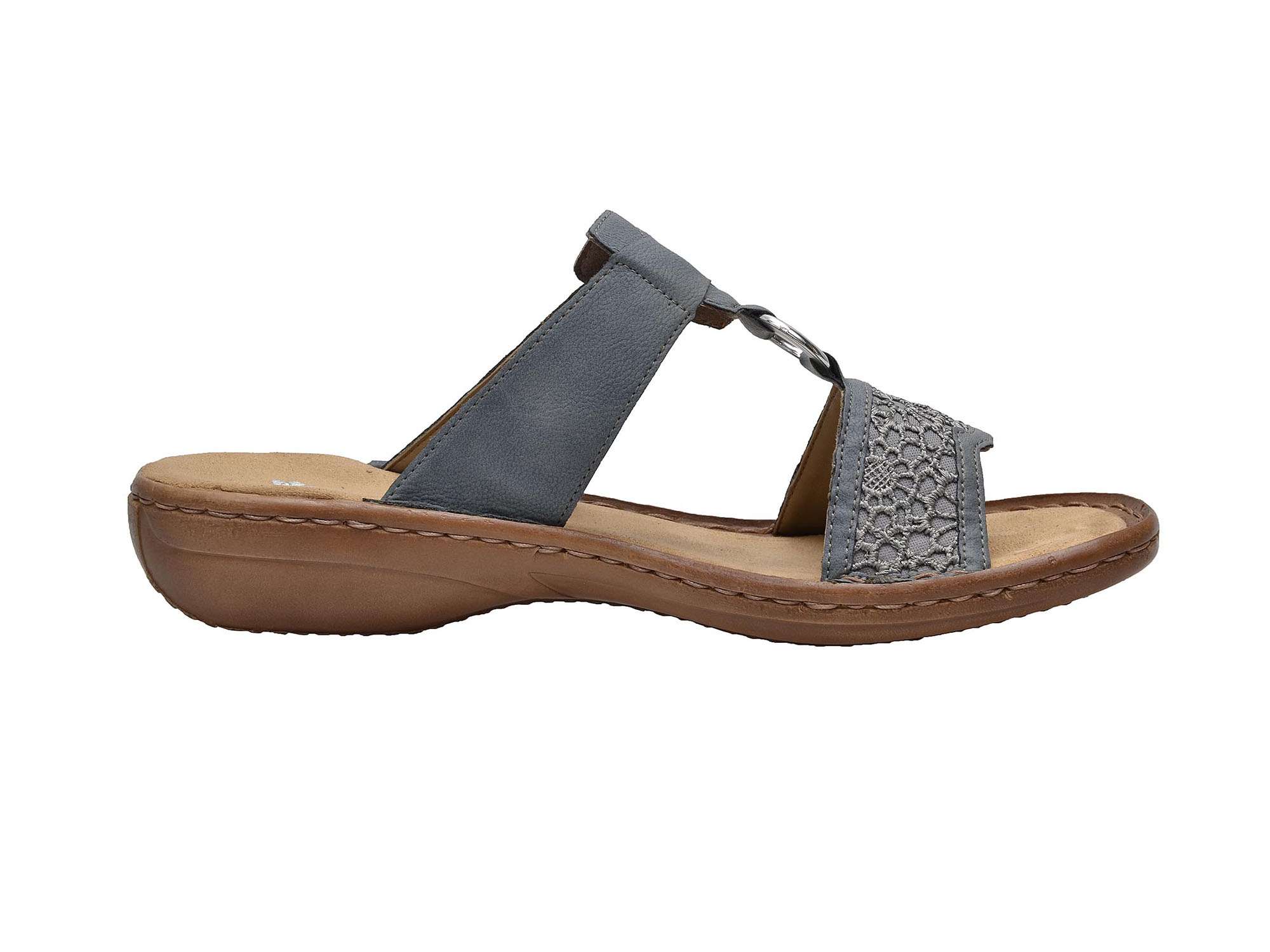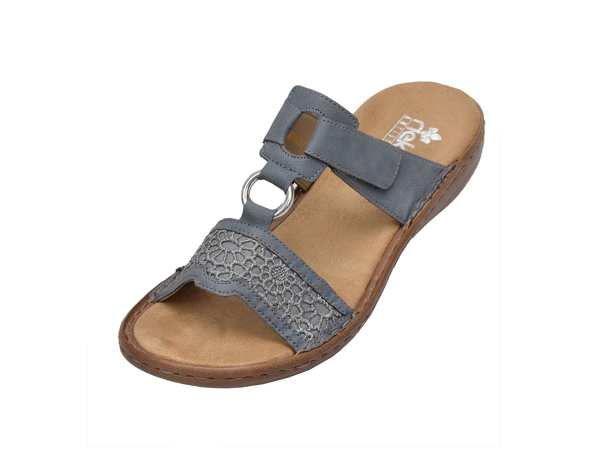 Dámské pantofle na nízkém podpatku/klínku nastavitelným páskem a zdobením [slovnik=4]šíře G[/] značky Rieker.