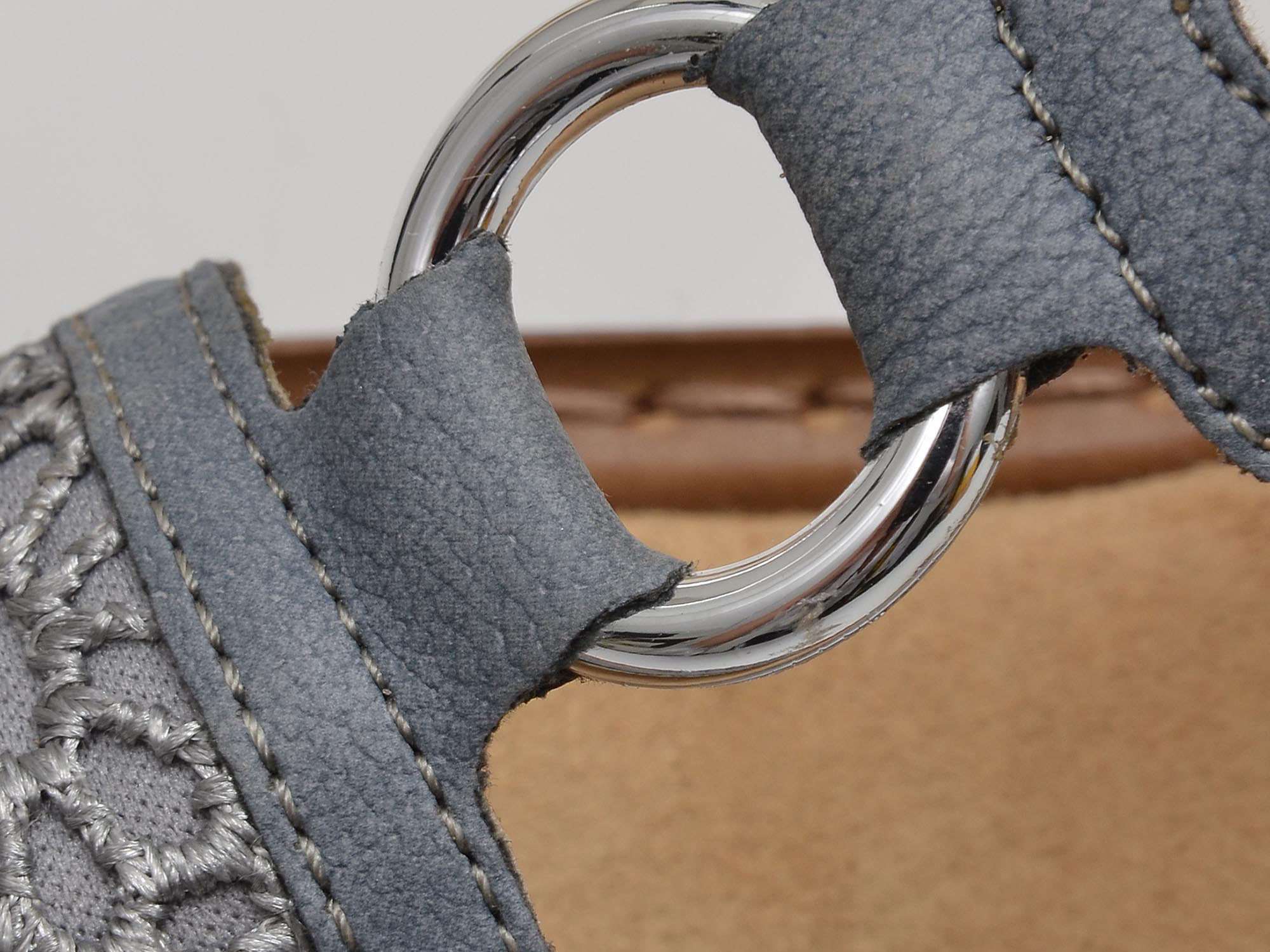 Svršek pantoflí je vyroben ze syntetického materiálu - imitace kůže. Je ve světlejší modré barvě. Pantofle jsou tvořeny dvěma širšími pásky, které jsou na nártu spojeny. Přední pásek je se zdobením světle modrou krajkou. Druhý pásek přes nárt je bez zdobení, ale je nastavitelný pomocí suchého zipu. Díky němu můžete pantofle upravit pro nižší, bežný nebo i vyšší nárt. Oba pásky jsou na nártu spojeny dílem světle modrého materiálu, který je s kovovým kroužkem.